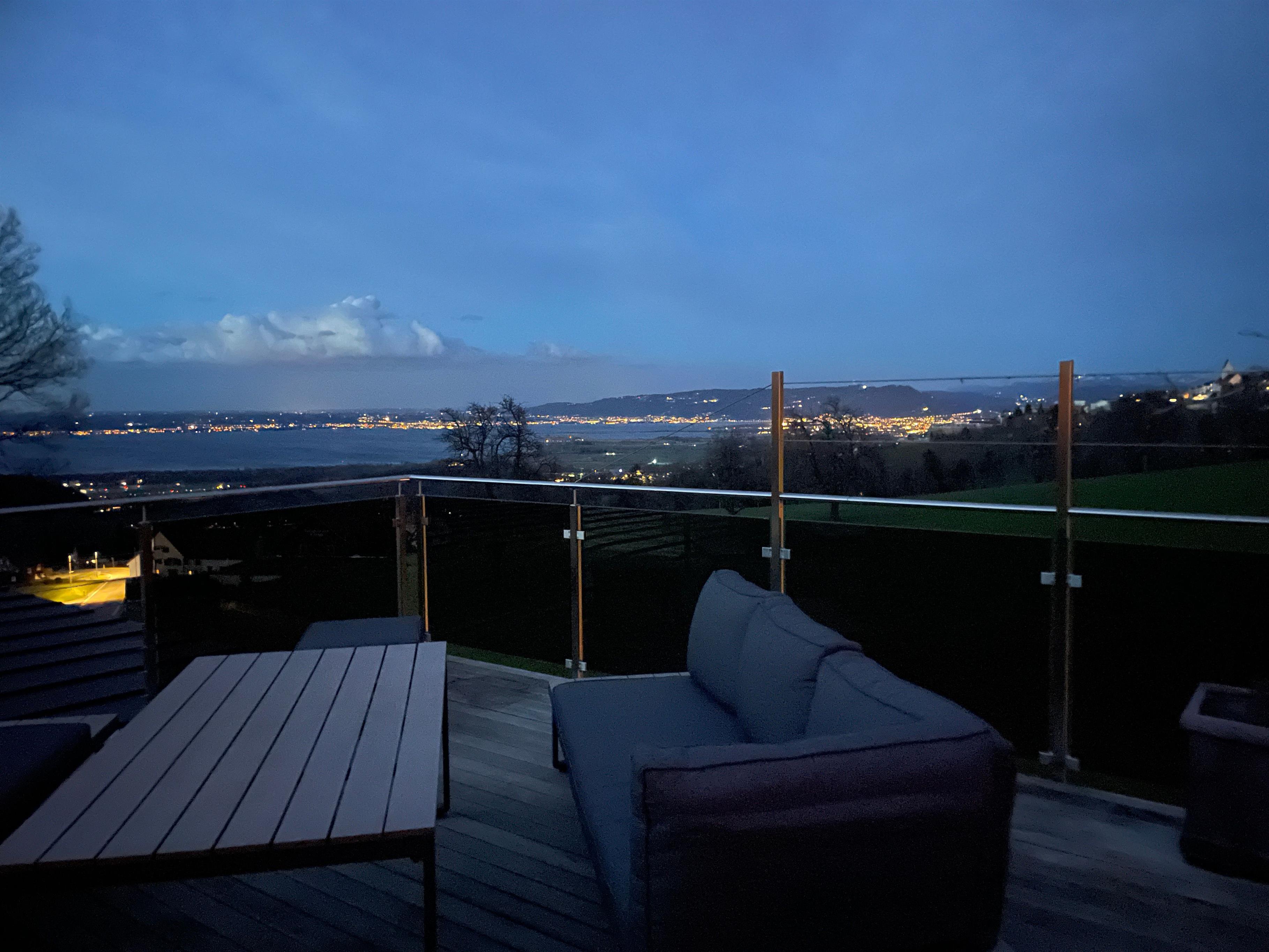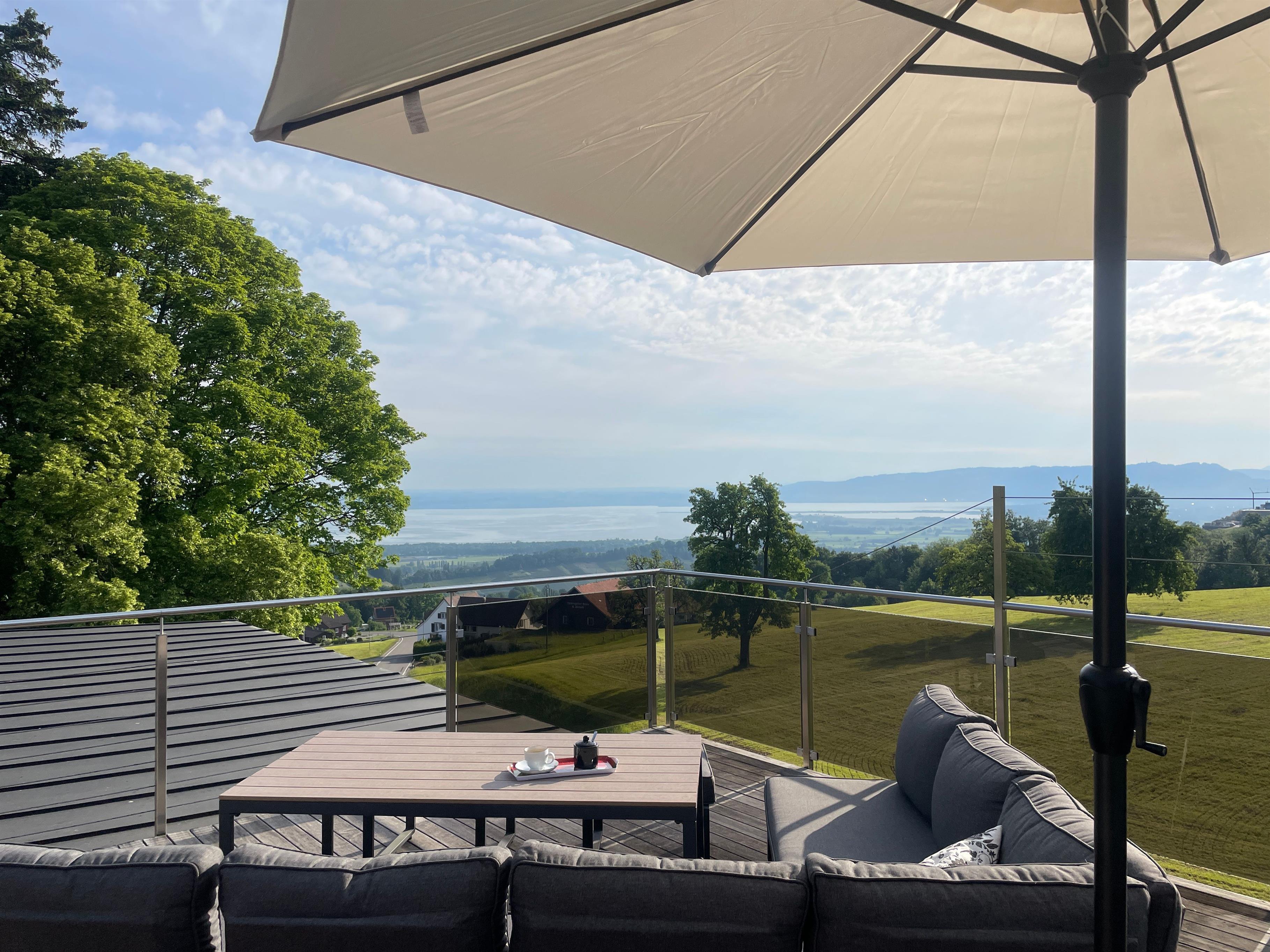 The roof terrace, which is for exclusive use, is a particular highlight and provides the ideal setting for cosy dinners in the open air or simply for relaxing. Here you can watch the kites soaring in the thermals. Let your gaze wander over the Rhine delta, the plain as far as the Austrian town of Bregenz, the Pfänder or the German island of Lindau. From the terrace, the bedrooms, the dining table and the sofa, you have a wonderful view of the surrounding meadows and pastures. Cows, alpacas, sheep and goats graze here, and there is also a small horse farm directly behind the house.
