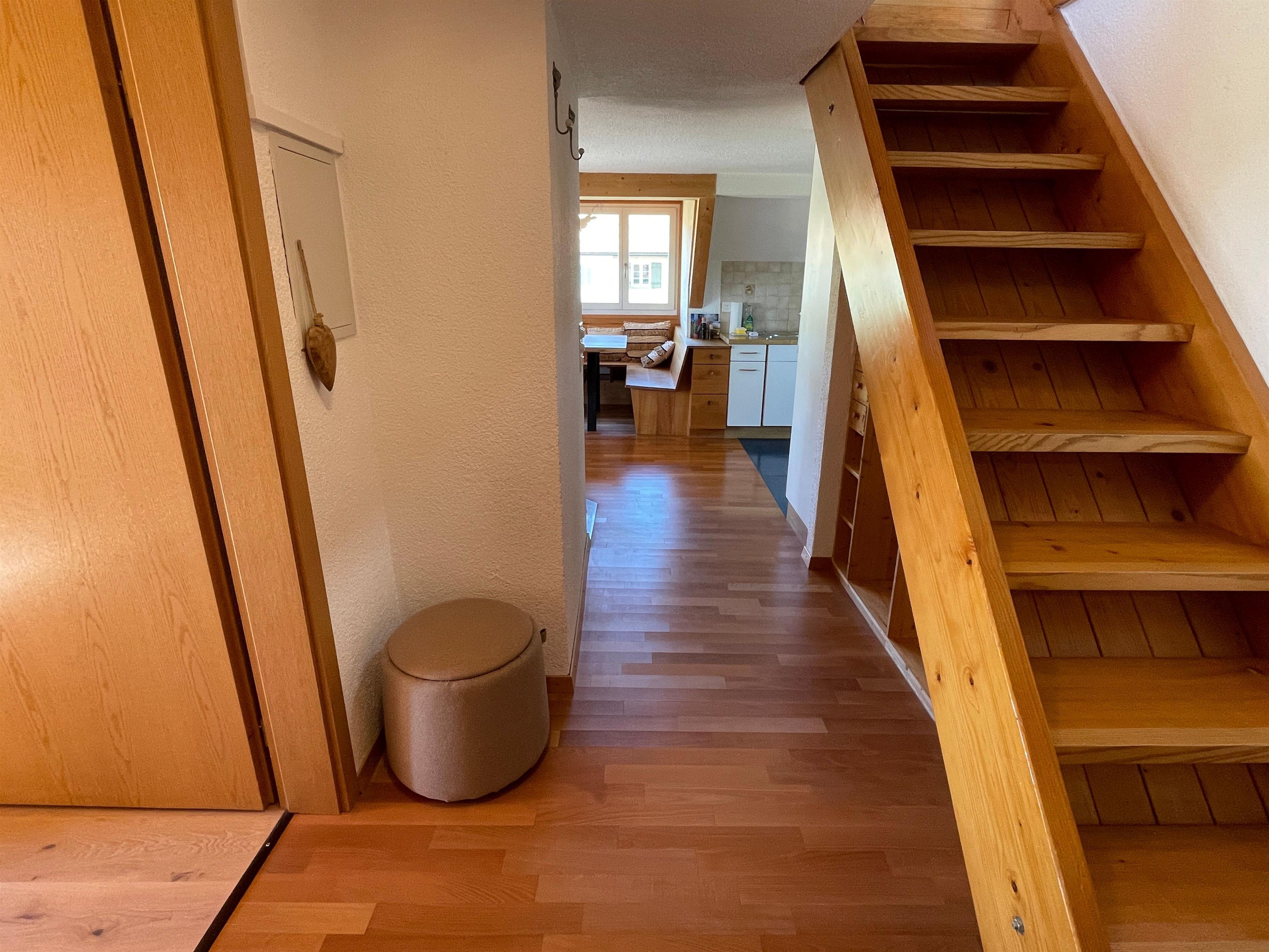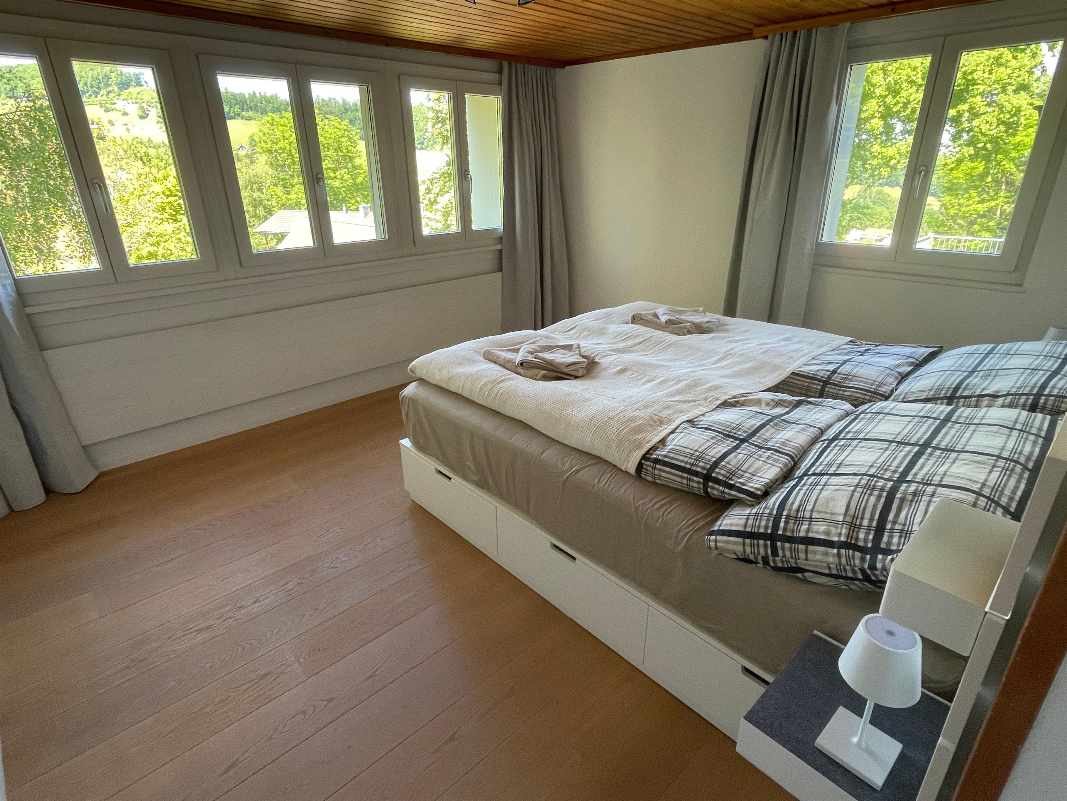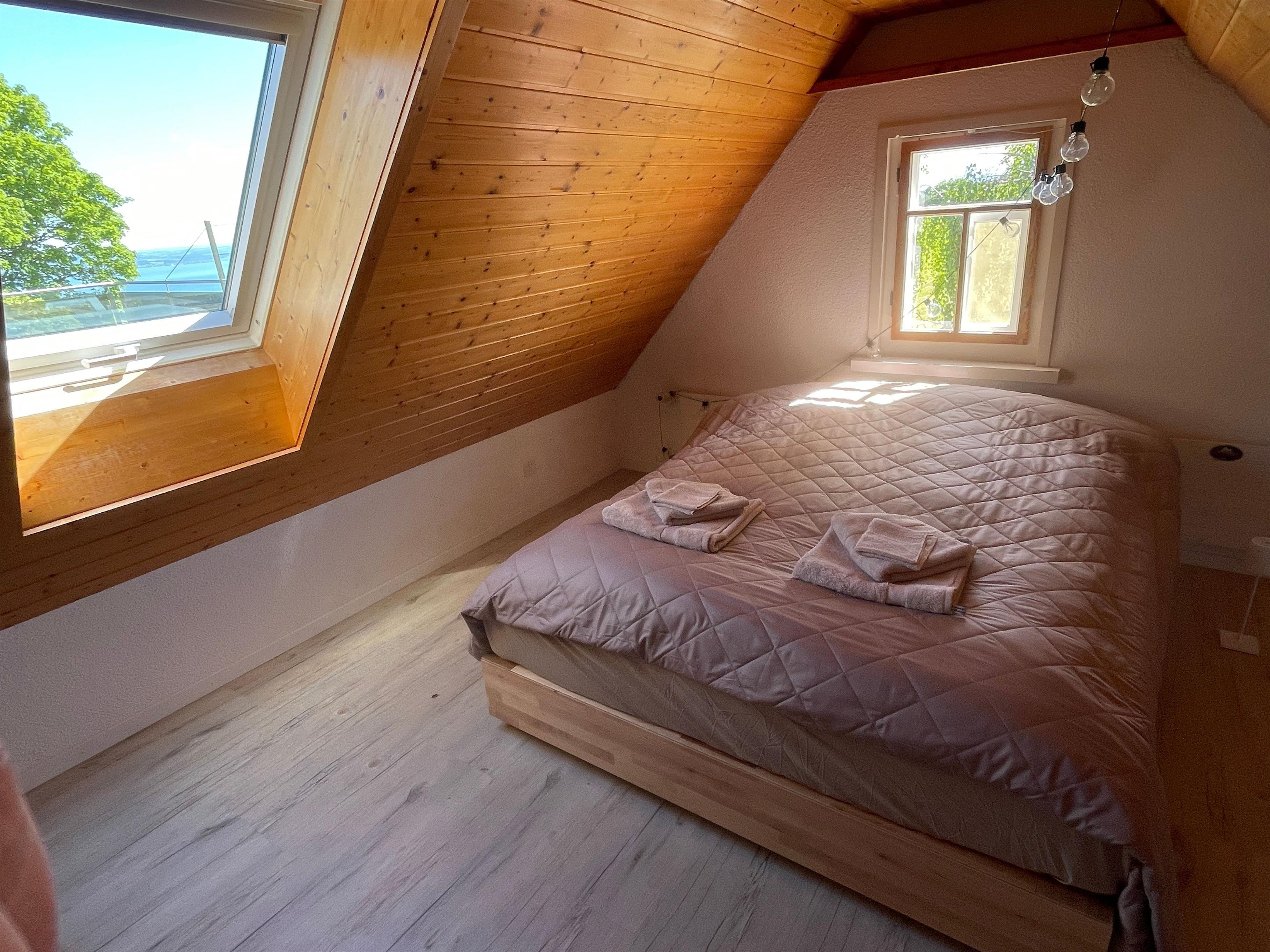This charming maisonette holiday flat on the edge of the village of Heiden, situated at approx. 700 metres above sea level and thus approx. 300 metres above Lake Constance, offers space for up to 6 people and is ideal for families or small groups looking for a break in a picturesque setting. The house is located approx. 2 minutes outside the village and is best reached by car, for which a garage and an outside parking space are available. The flat is located on the third floor, which is accessed via a staircase, and is characterised by its 3 carefully furnished bedrooms, all of which can be darkened to ensure a restful night's sleep. An internal staircase (not suitable for small children, see photos) provides access to the rooms on the top floor and the private terrace.