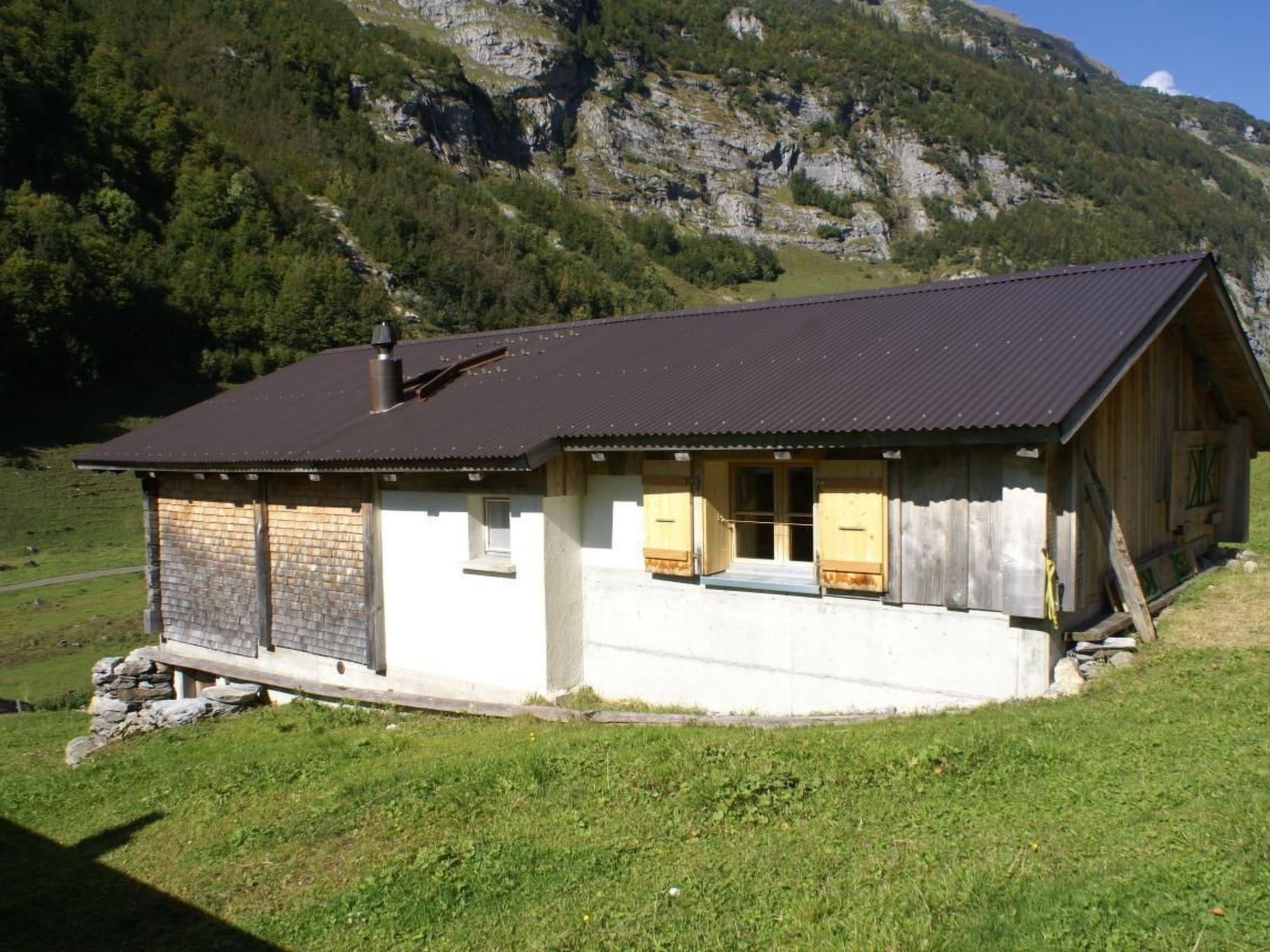 The alpine hut is built in the typical chalet style of the region with a living area and a stable.