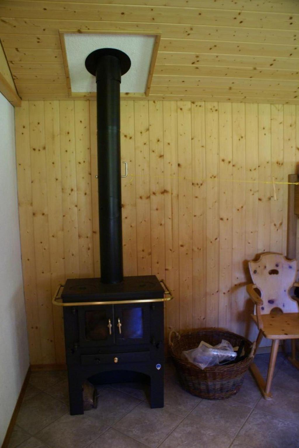 The living room is equipped with an eat-in kitchen, a dining table, a bunk bed and a Swedish stove.