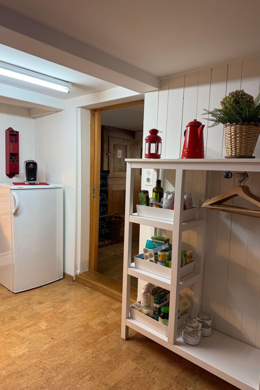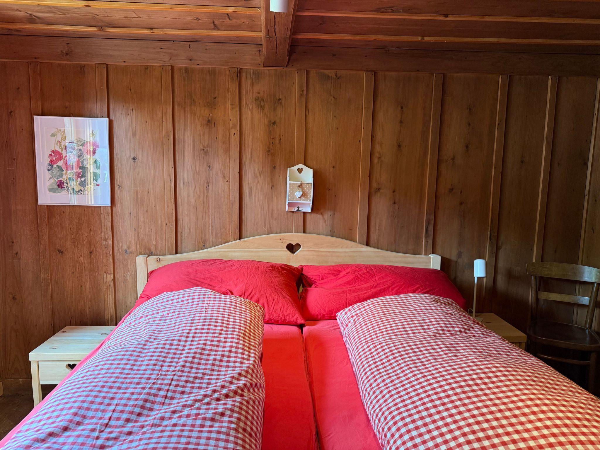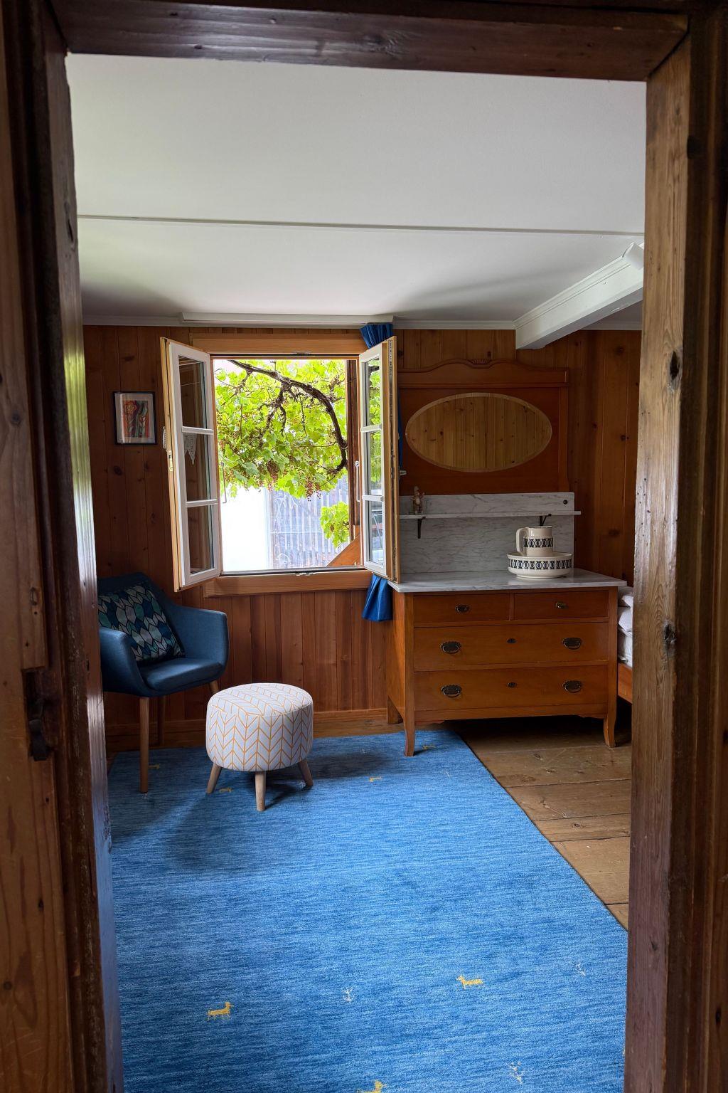 Inside the house, you will be welcomed by the cosy interior. The kitchen on the ground floor is equipped with a dishwasher and promises practical convenience. The adjoining living room with its cosy tiled stove, a twin bedroom and a separate WC round off the lower floor. Half a storey higher, there is a charming double room with a Swiss stone pine bed next to a shower area with a curtain for privacy. On the top floor, a small anteroom with a reading corner and desk invites you to linger, next to which there is another bedroom with a double bed.