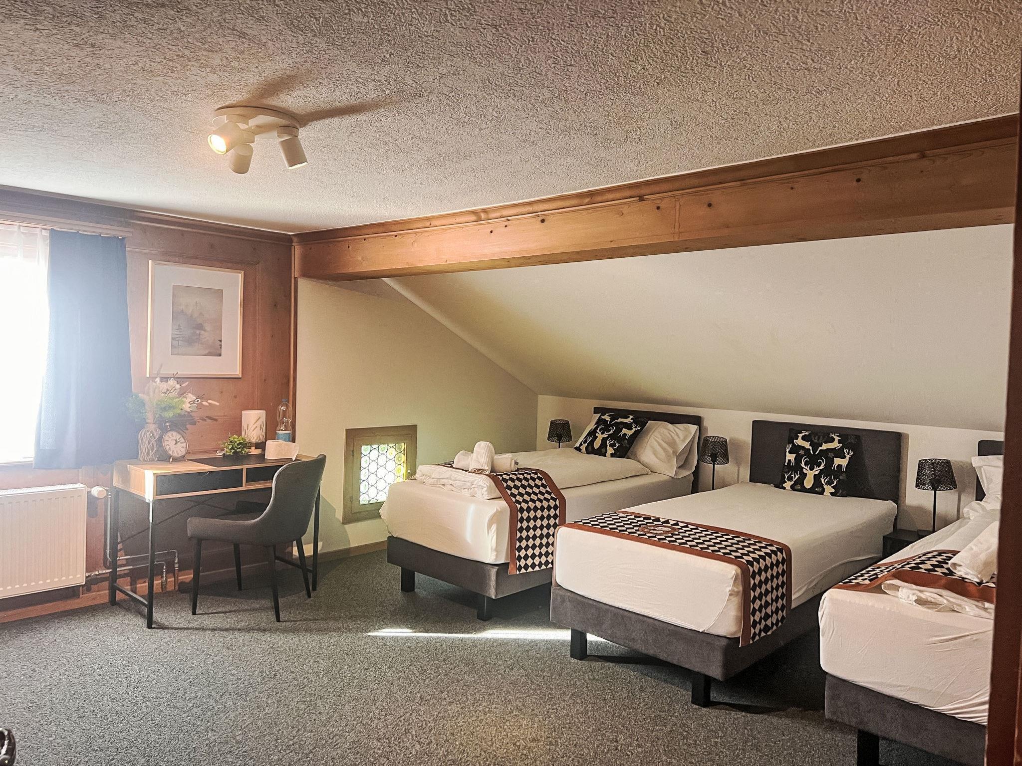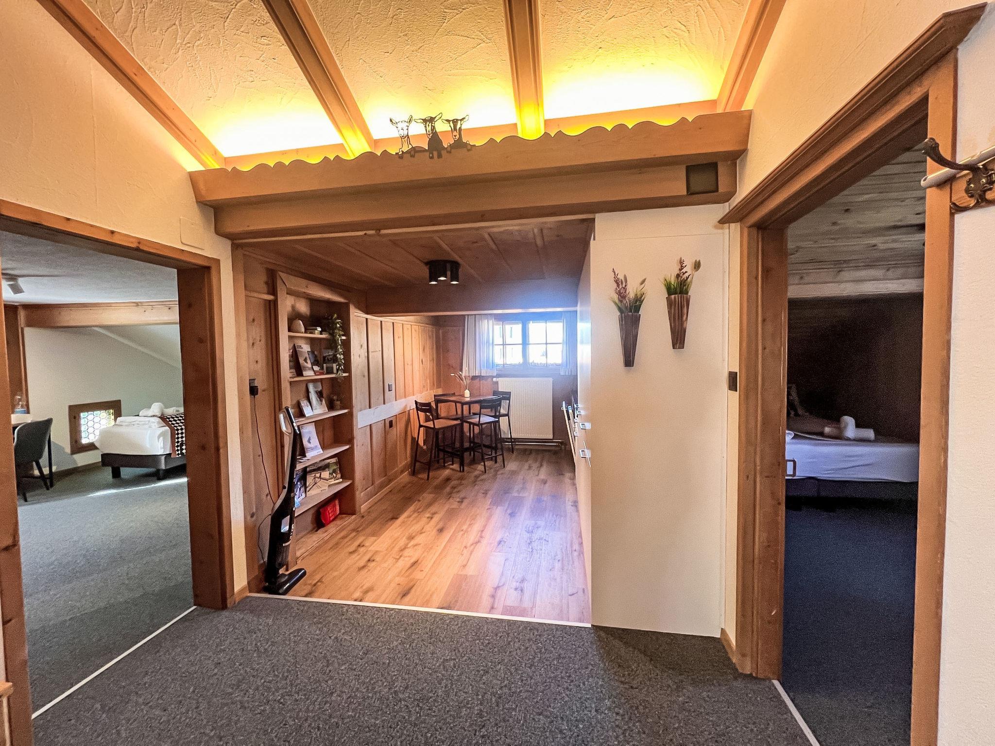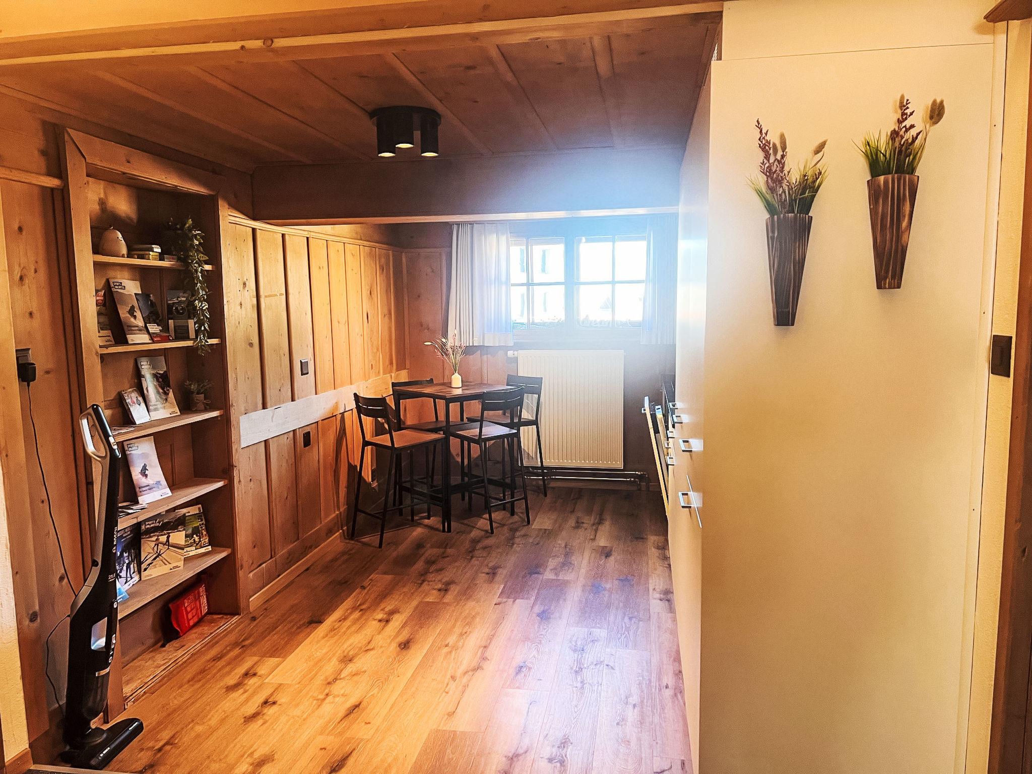 "Adlerhorst-Stube", 4-room apartment 100 m2 on 3rd floor. Fully renovated in 2025, comfortable and rustic furnishings: living/dining room with 1 double sofabed (160 cm, length 200 cm), cable TV (flat screen). Exit to the balcony. 1 double bedroom. 1 room with 3 beds. Lounge. Kitchen (oven, dishwasher, 4 ceramic glass hob hotplates, toaster, kettle, electric coffee machine, raclette grill, fondue Set (cheese)). Shower/WC. Small balcony, south facing position and west facing position. Balcony furniture. Beautiful view of the mountains, the countryside and the resort. Facilities: baby cot for up to 2 year olds (extra). Internet (WiFi, free). Parking (1 car) at the house. Please note: non-smokers only.