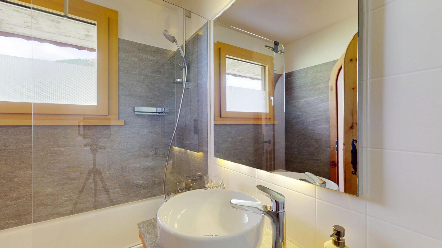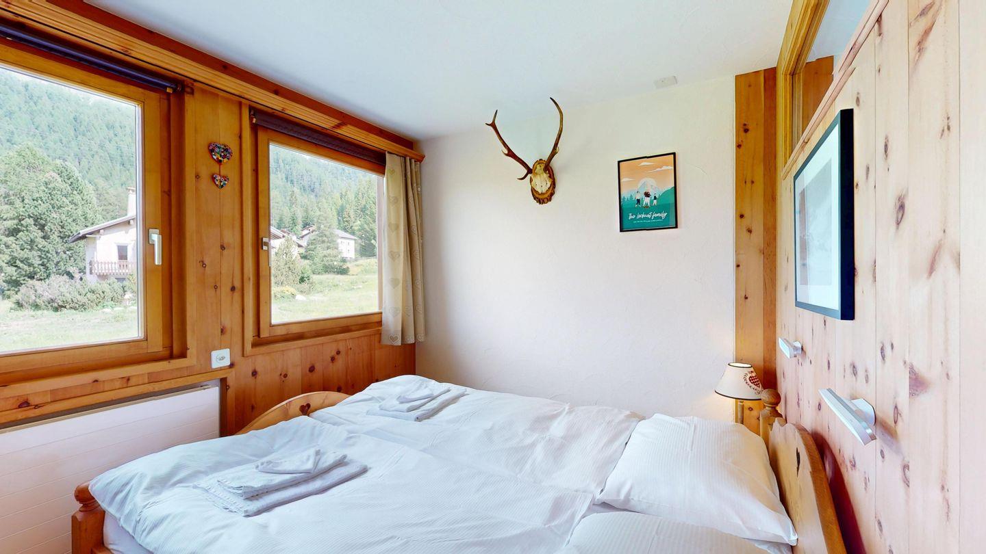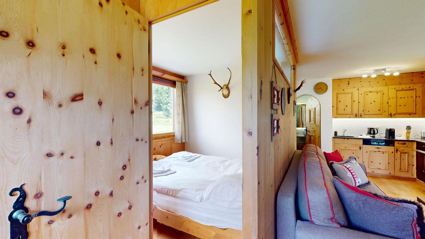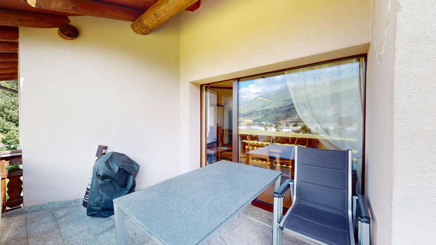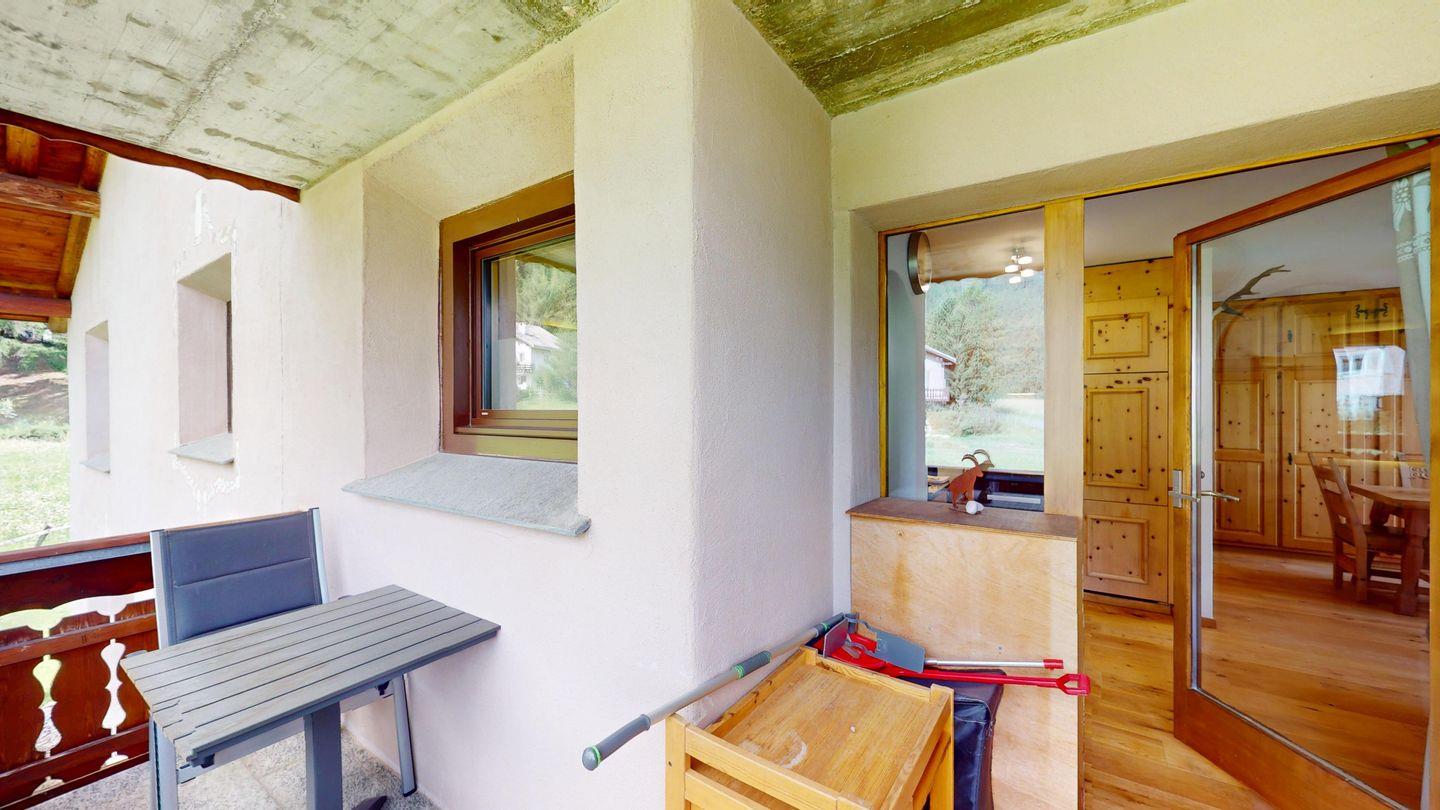 2-Zimmerwohnung im 1. Stock. Wohn-/ Esszimmer und Sofaecke mit Ausgang zum Balkon und einer schönen Bergsicht und Weber Grill. TV und Internet. Offene Küche mit Ausgang zum Balkon, mit Herd, Backofen, Kühlschrank mit kleinem Gefrierfach, Geschirrspülmaschine, Wasserkocher, Kaffeemaschine Chicco d'Oro, Racletteofen und Fondue. Schlafzimmer mit Doppelbett und Etagenbett. Badezimmer mit Badewanne/WC/Lavabo. Ein Parkplatz in der Garage. Skiraum und Waschküche zur gemeinschaftlichen Benutzung. Nichtraucherwohnung. Haustiere sind nicht erlaubt.