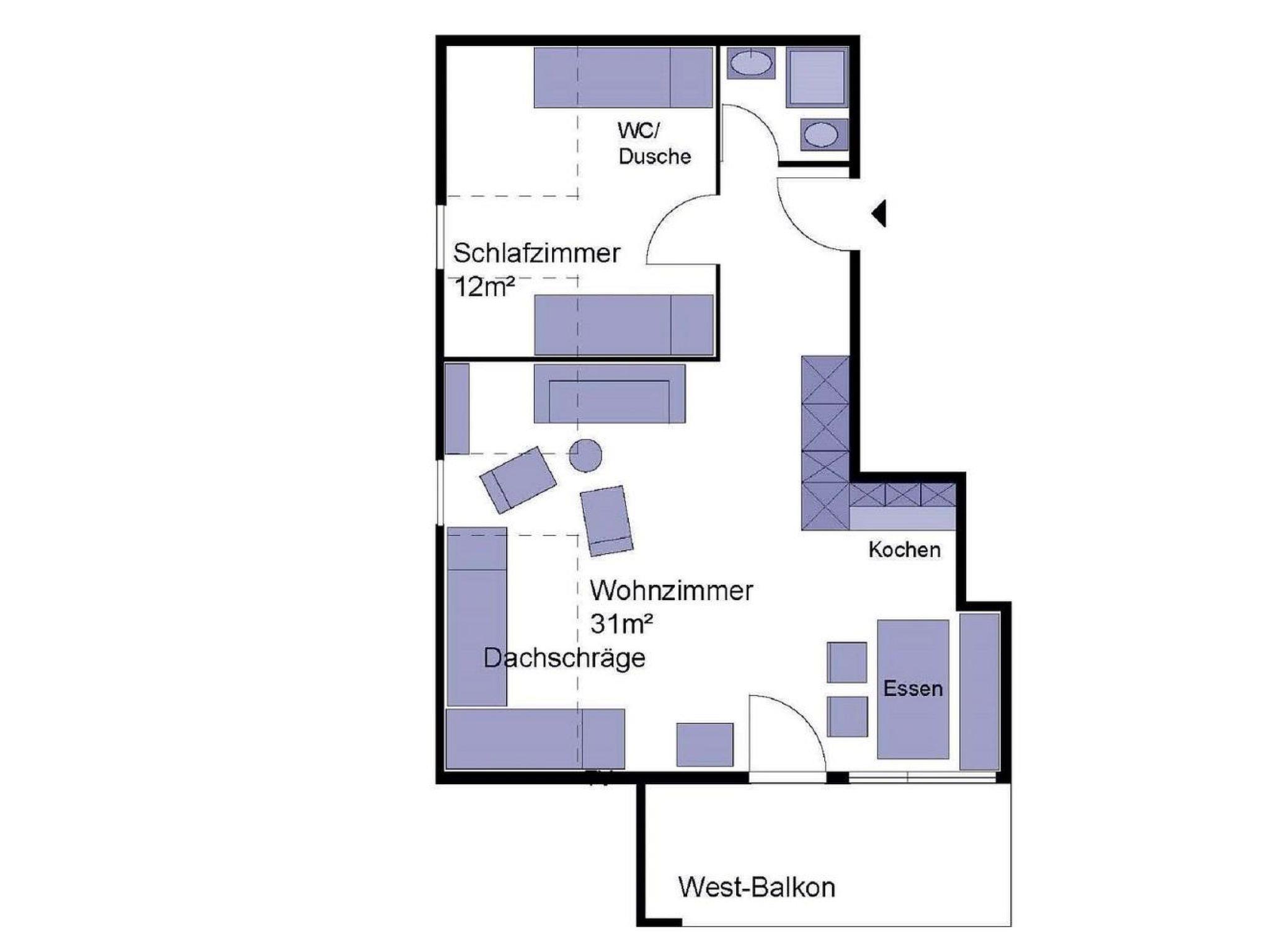 2-room apartment on the top floor of an apartment building. Living/bedroom (two single beds) with an integrated kitchen (dishwasher), radio, TV, bedroom with two single beds, shower/toilet, west-facing balcony, parking spot, 50 m2. No smoking, no pets allowed.