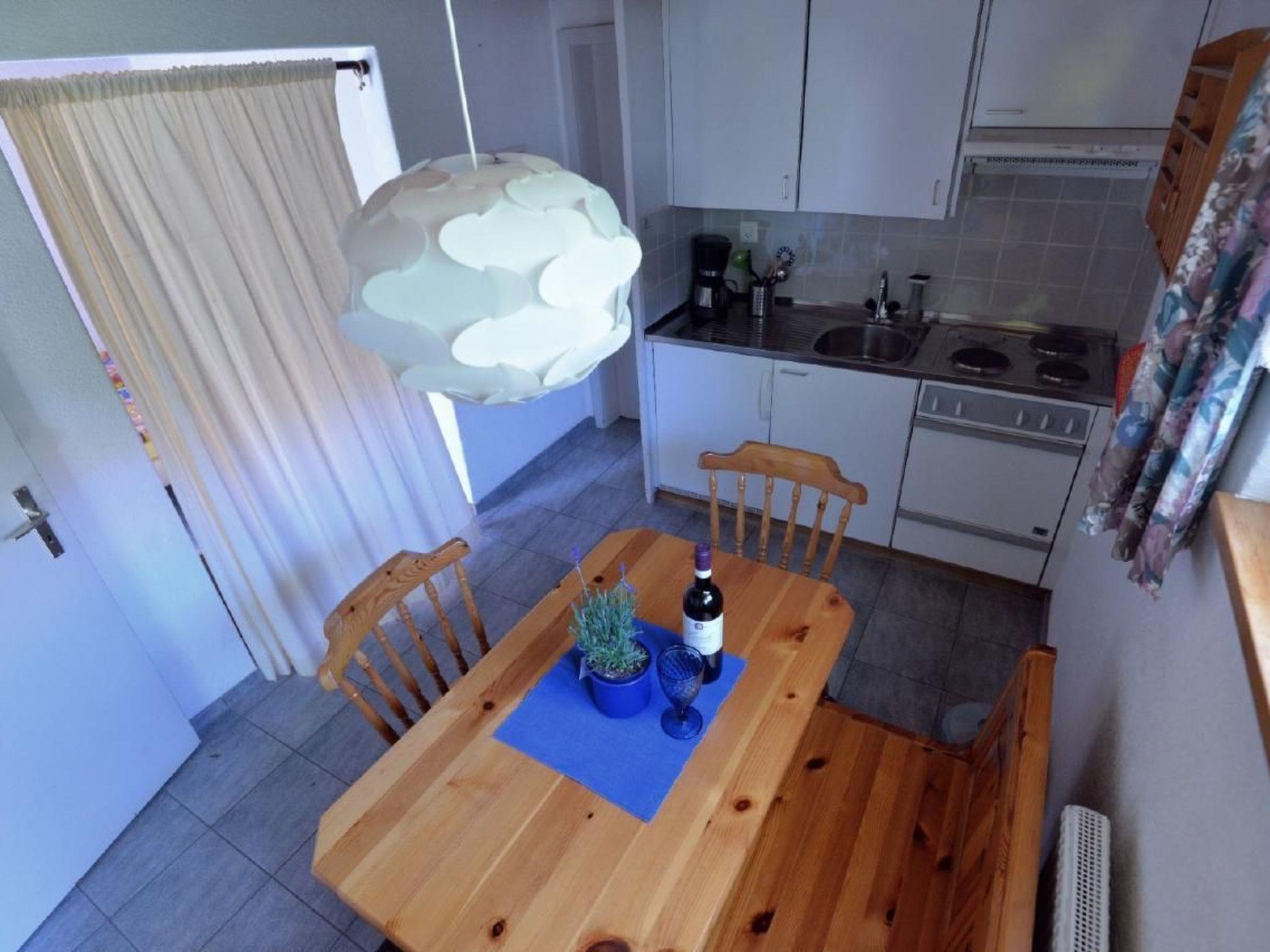 The spacious studio for 2 persons with private entrance is located in the basement of the 4-family house. The large window in the sleeping area offers a view of the mountain panorama. The studio is equipped with a fitted kitchen, dining table with corner bench for at least 4 people and a bathroom with shower, WC and bathtub. The sleeping area is separated from the living area by a curtain. An espresso coffee machine and a kettle are available for a relaxed breakfast. We are happy to provide a fondue or raclette set on request. For entertainment there is a TV and super-fast Wifi free of charge. Enjoy the breathtaking view from the private terrace in front of the studio or on the communal terrace in front of the house. Clean and well-groomed pets are welcome with prior notice. All flats in Chalet Böbs are non-smoking.