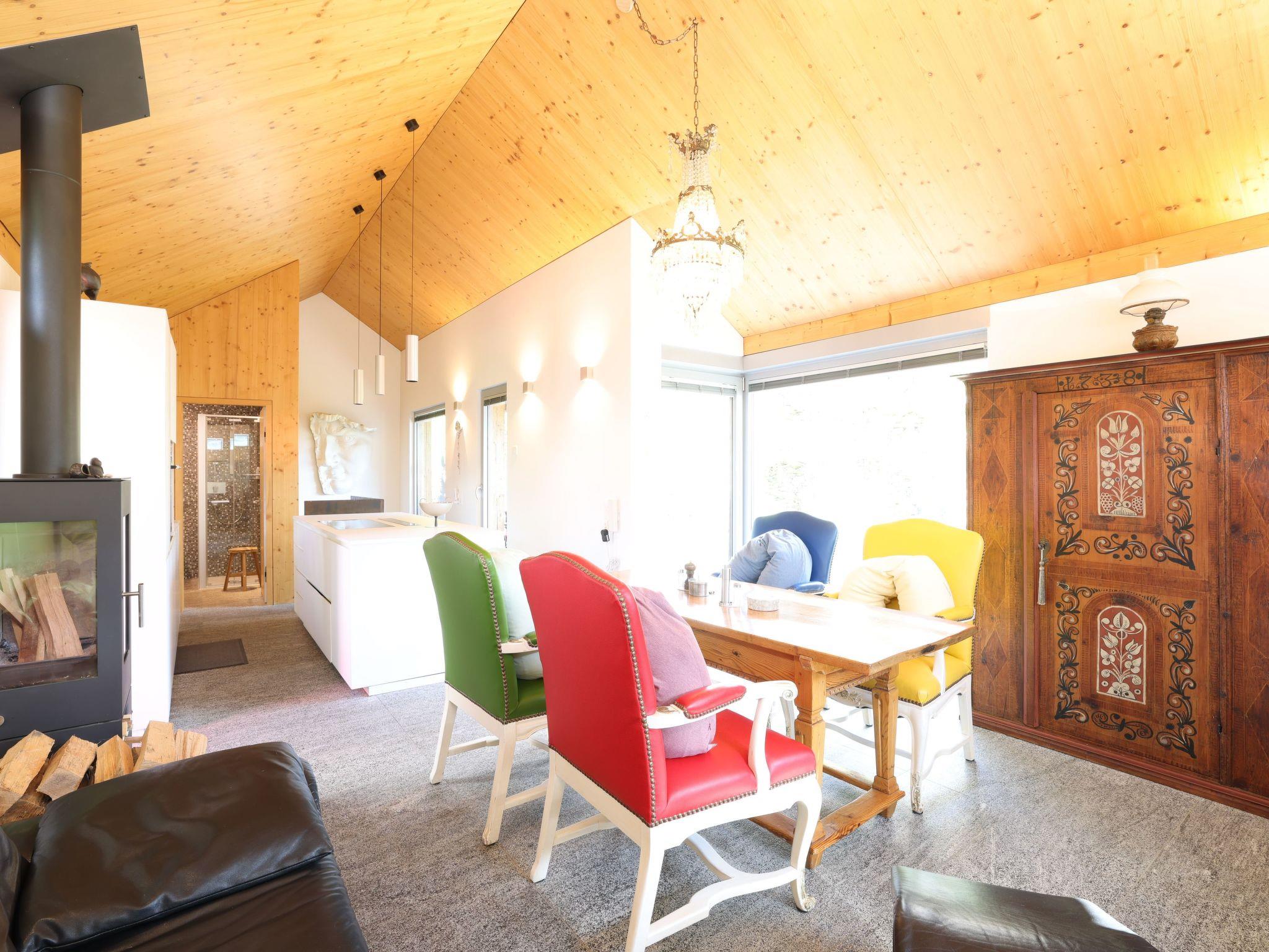 The interior design of the house reflects a harmonious combination of antique charm and modern elegance. Spread over two floors, guests will find a cosy bedroom on the ground floor with an integrated bathroom featuring a luxurious bathtub, a WC and an elegantly designed washbasin. The upper floor opens onto a spacious living and dining area with a fully equipped open-plan kitchen, an office and a wet room, complemented by a wooden veranda and a sun terrace offering picturesque views of the surrounding area. Superior comfort is guaranteed by the use of a heat pump with solar panels, underfloor heating and high-quality WLAN including Swisscom TV.