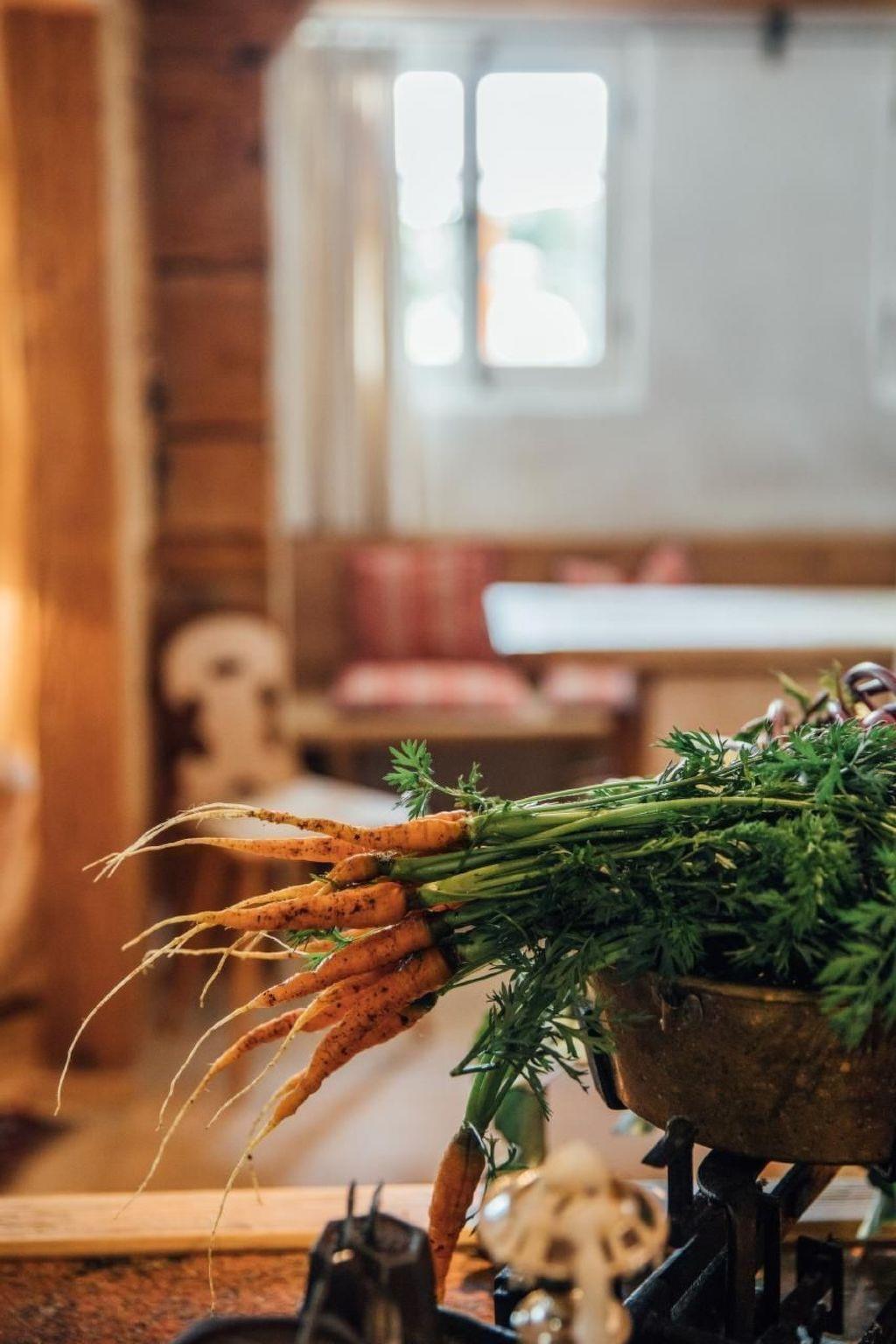 The outdoor area of the BLACHTY impresses with its south-west facing meadow plot with a natural stone terrace and lovingly arranged stones. Here you can enjoy the picturesque view over the valley or admire the sight of grazing cows in spring and autumn. The charm of this unique holiday home is further enhanced by its picturesque mullioned windows and authentic wooden architecture, allowing you to immerse yourself in another time.
