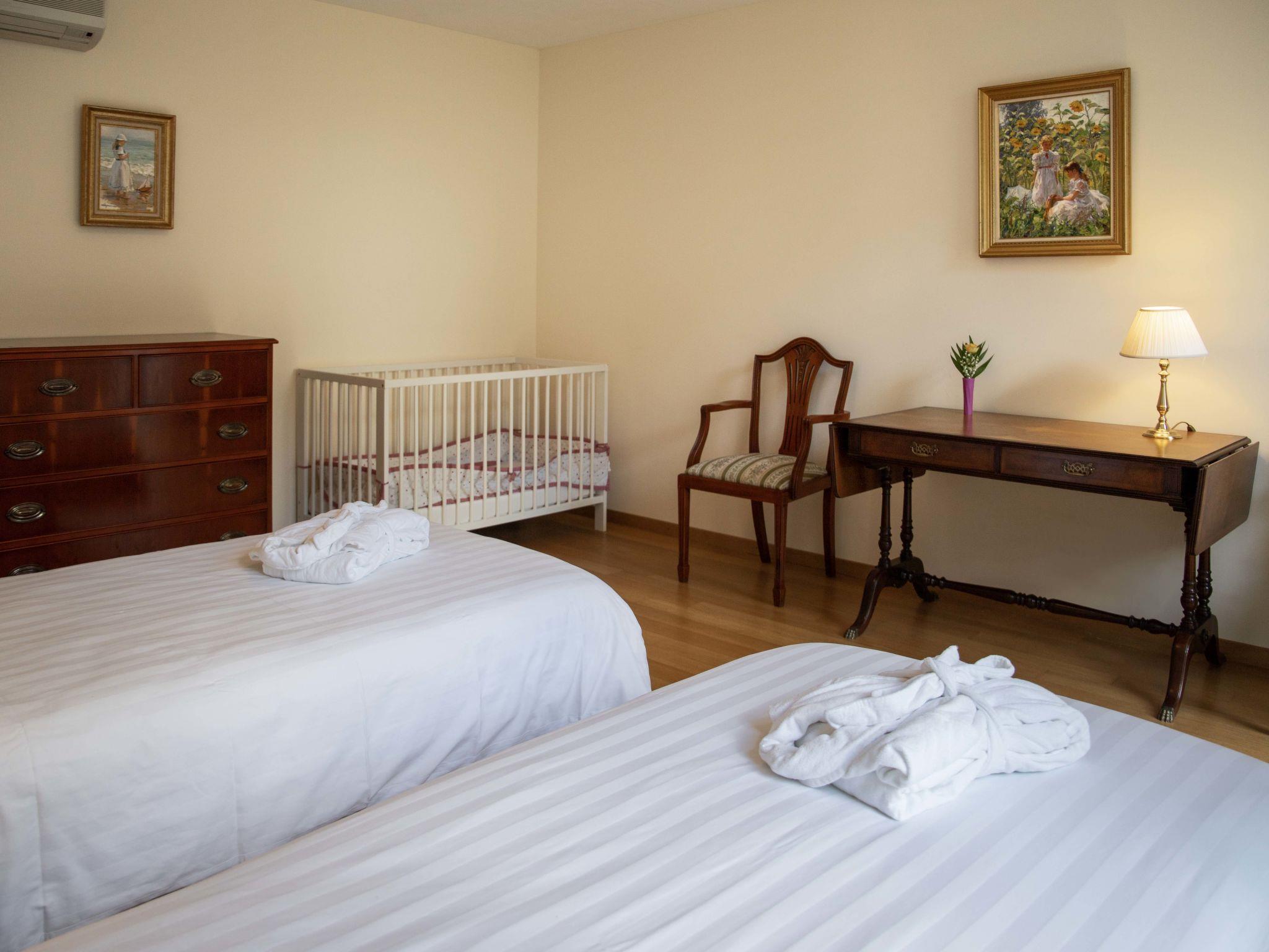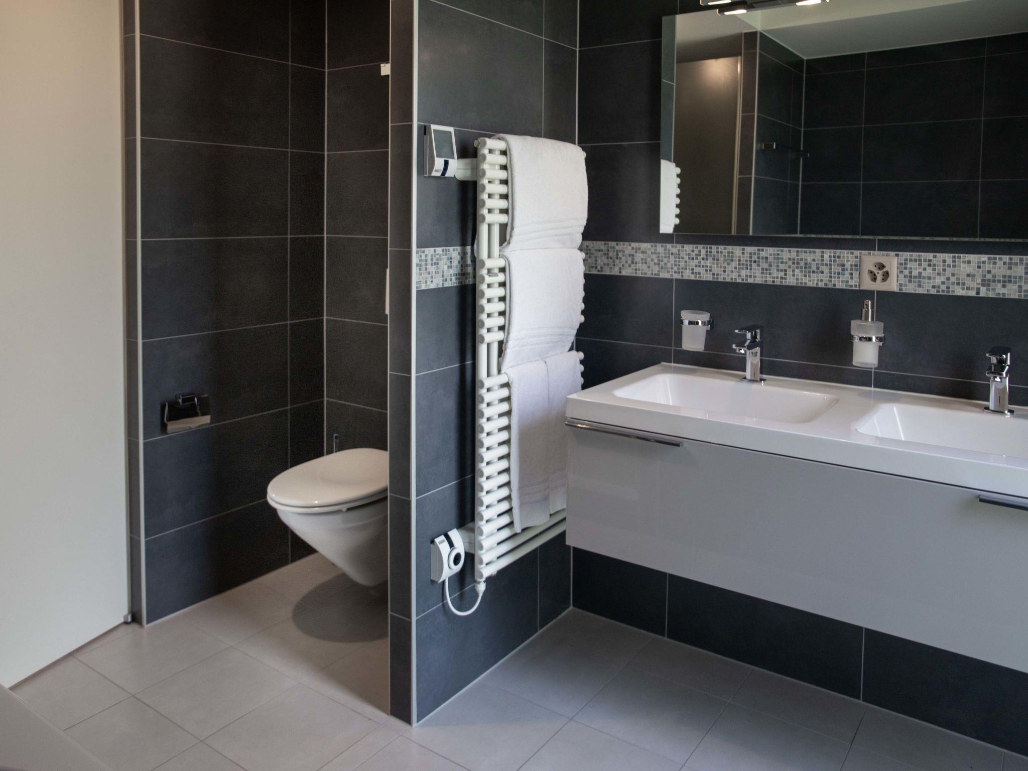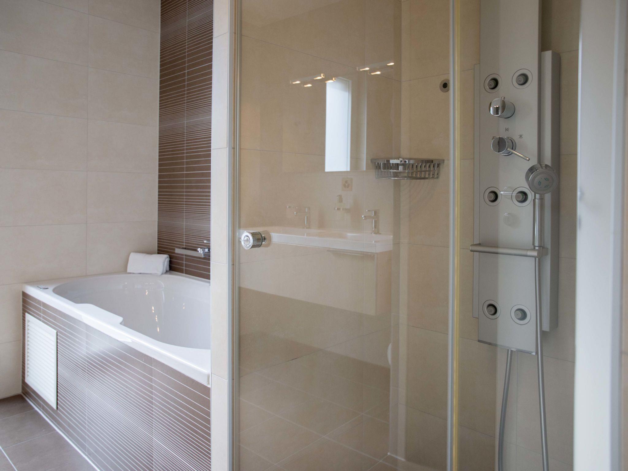 "L'Esplanade A1.4", 5-room apartment 214 m2 on 1st floor. Luxurious and tasteful furnishings: large living/dining room with open-hearth fireplace (only for decoration), cable TV, DVD, gas heating, air conditioning and electric shutters. Exit to the terrace. 1 large room with 1 double bed (160 cm, length 200 cm), bath/shower/WC and air conditioning. 1 large room with 2 beds (90 cm, length 200 cm), bath/shower/WC and air conditioning. 1 room with 2 beds (90 cm, length 200 cm), air conditioning. 1 room with 1 bed (90 cm, length 200 cm). Office. Kitchen (oven, dishwasher, 4 ceramic glass hob hotplates, toaster, kettle, microwave, freezer, electric coffee machine, Capsules for coffee machine (Nespresso) extra). Shower/WC, bath/shower/WC. Terrace 18 m2. Terrace furniture, deck chairs (2). Beautiful view of the lake, the mountains, the countryside and the resort. Facilities: washing machine, dryer, iron, hair dryer. Internet (WiFi, free). Garage space n 85, height 190 cm. Please note: non-smokers only, parking space for small car only.