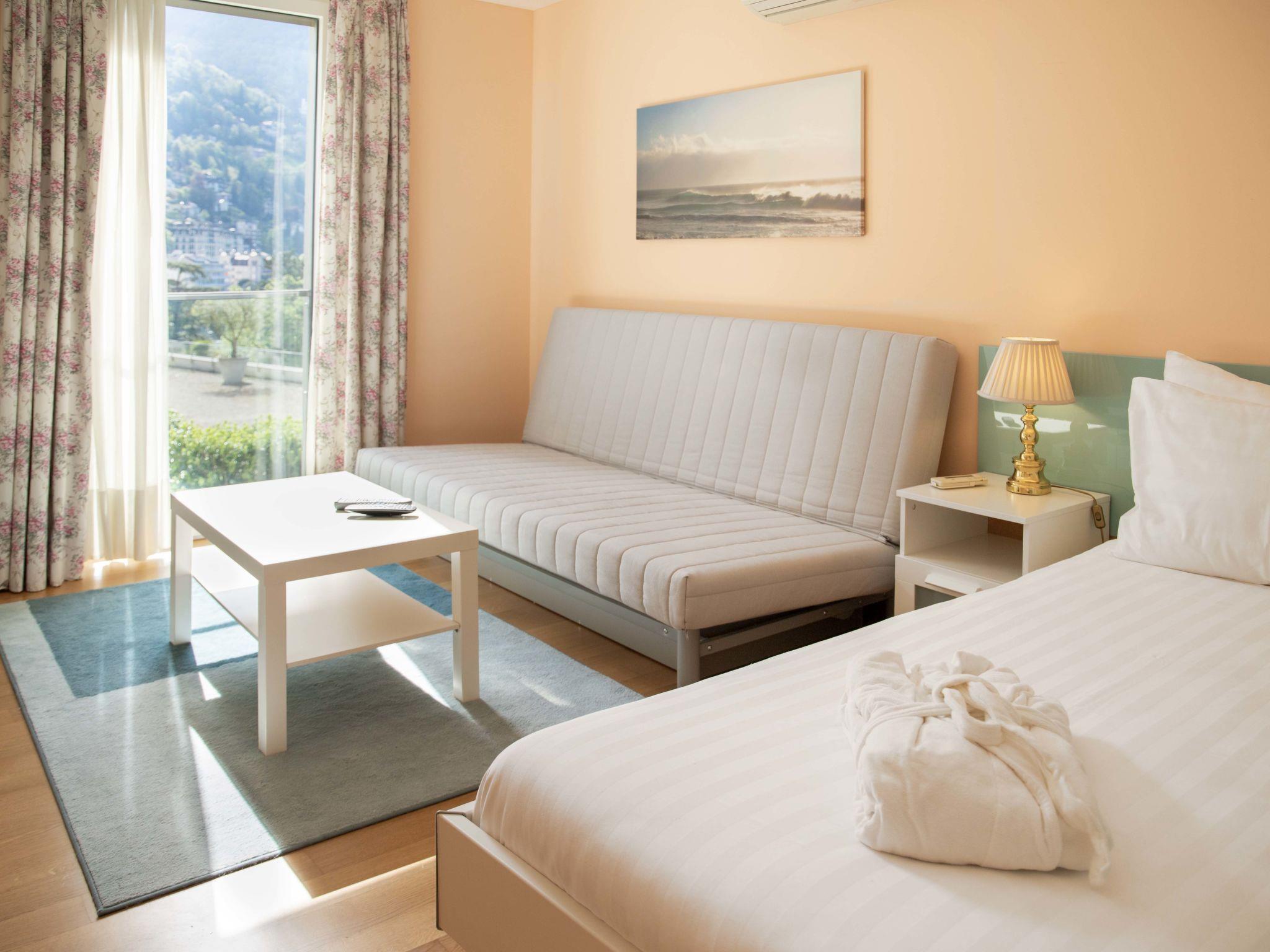 Modern residence "Le National Montreux". In the resort, in the heart of the city. For shared use: swimming pool heated (3 x 10 m, depth 160 - 160 cm, seasonal availability: 01.Jan. - 31.Dec. pool opening hours: 07:00-22:00). Shower/WC in the pool area. In the house: sauna, fitness room, relaxation room hamam, lift, central heating system. Linen change weekly (suppl. charge extra). Towel change weekly (suppl. charge extra). Room cleaning weekly on request (extra). Communal covered parking. Dimension: height 195 cm. Supermarket 400 m, shopping centre 350 m, restaurant 300 m, café 350 m, bus stop "Bon Port" 130 m, railway station "Montreux", ferry 700 m, outdoor swimming pool 5 km, lake Lac Léman 50 m. Golf course (18 hole) 15 km, tennis 950 m, minigolf 1.1 km. Nearby attractions: Château de Chillon 2.4 km, Montreux Jazz Festival 1.4 km, Musée Olympique Lausanne 27 km, Swissvapeur Parc / Aquaparc Bouveret 16 km, Chaplin's World Vevey 9.3 km. Well-known ski regions can easily be reached: Leysin, Villars, Portes-du-Soleil. Well-known lakes can easily be reached: Lac Léman. Hiking paths: Rochers de Naye. Please note: guarded residence. Residence with electric gates. Main road close by. Neighbourhood highly sensitive to noise. Quietness and good behaviour expected.
