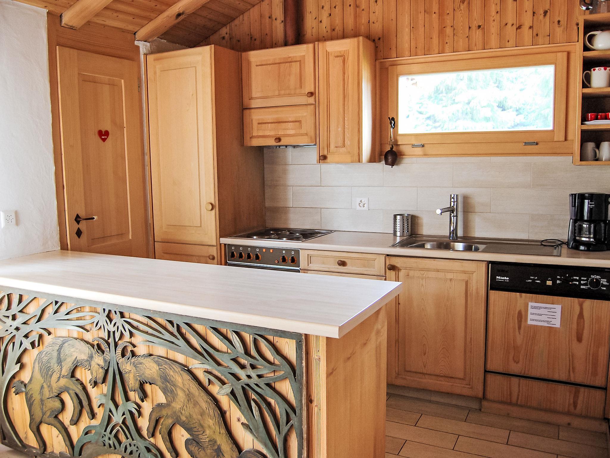 "Bisse-Vieux A-4", 4-room penthouse 100 m2 on 2 levels on 4th floor. Bright, partly with sloping ceilings, beautiful and wooden furniture furnishings: living/dining room with panoramic window with open-hearth fireplace. Exit to the terrace, south facing position and east facing position. 1 room with 1 french bed (140 cm, length 200 cm). Exit to the balcony, north facing position and east facing position. 1 room with 1 french bed (1 x 150 cm, length 180 cm). Open kitchen (4 hot plates, oven, dishwasher, toaster, kettle, microwave, electric coffee machine, Capsules for coffee machine (Nespresso) extra, raclette grill, fondue Set (cheese)). Shower, sep. WC. Upper floor: 1 room with sloping ceilings with rooflight with 2 beds (90 cm, length 180 cm). Open small lounge with sloping ceilings, ceiling height 100 - 170 cm with cable TV and DVD. Shower/WC. Balcony, north-east facing position, terrace 10 m2, south facing position and, east facing position. Balcony furniture. Beautiful view of the mountains, the valley and the resort. Facilities: hair dryer. Internet (WiFi, free). Parking space n 11 (roofed, 1 car). Please note: non-smokers only.