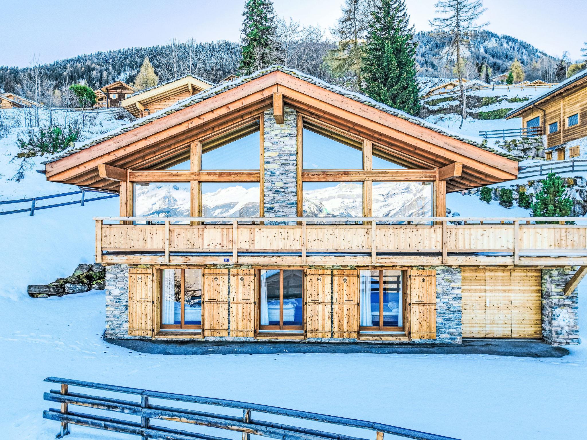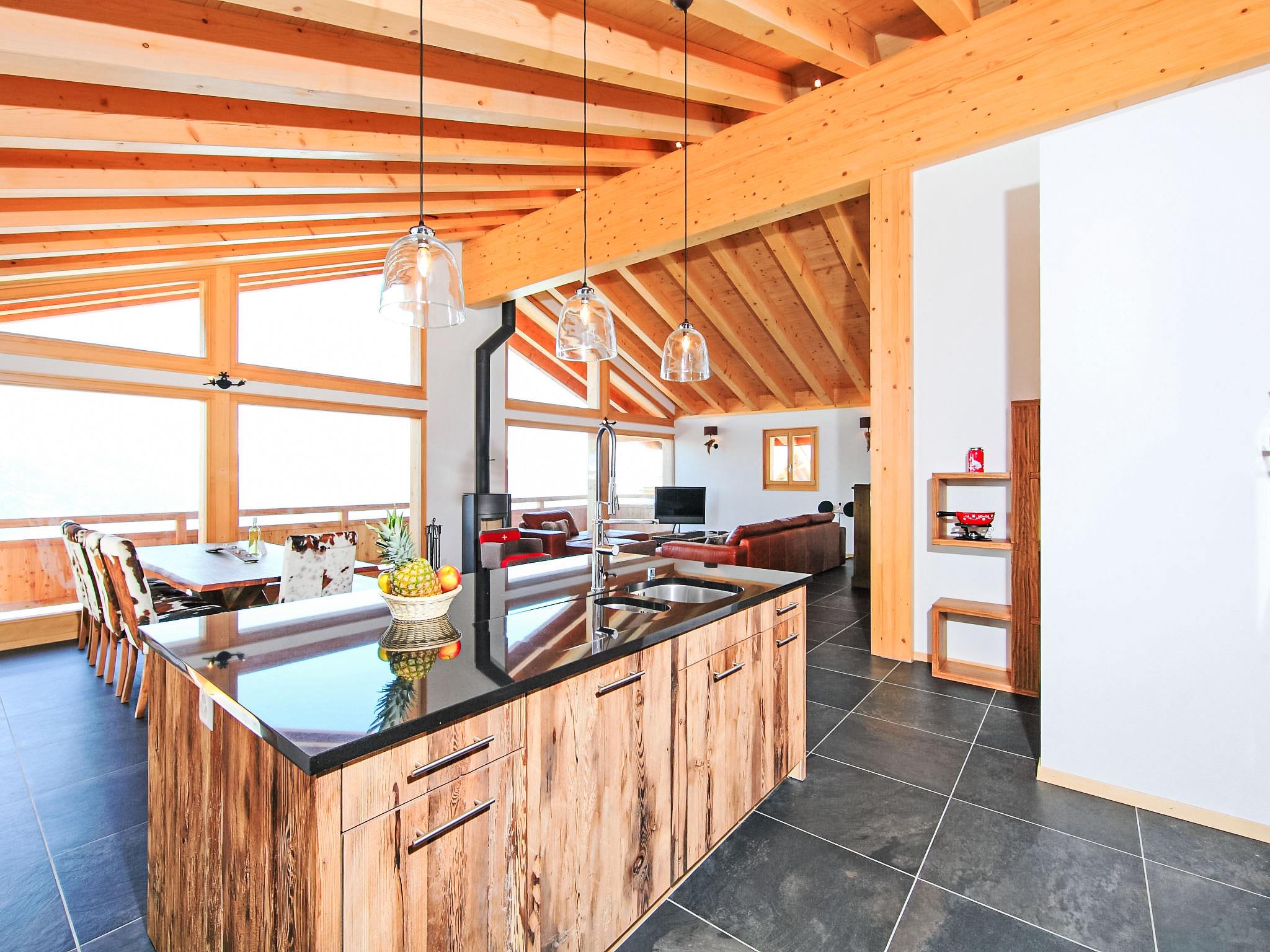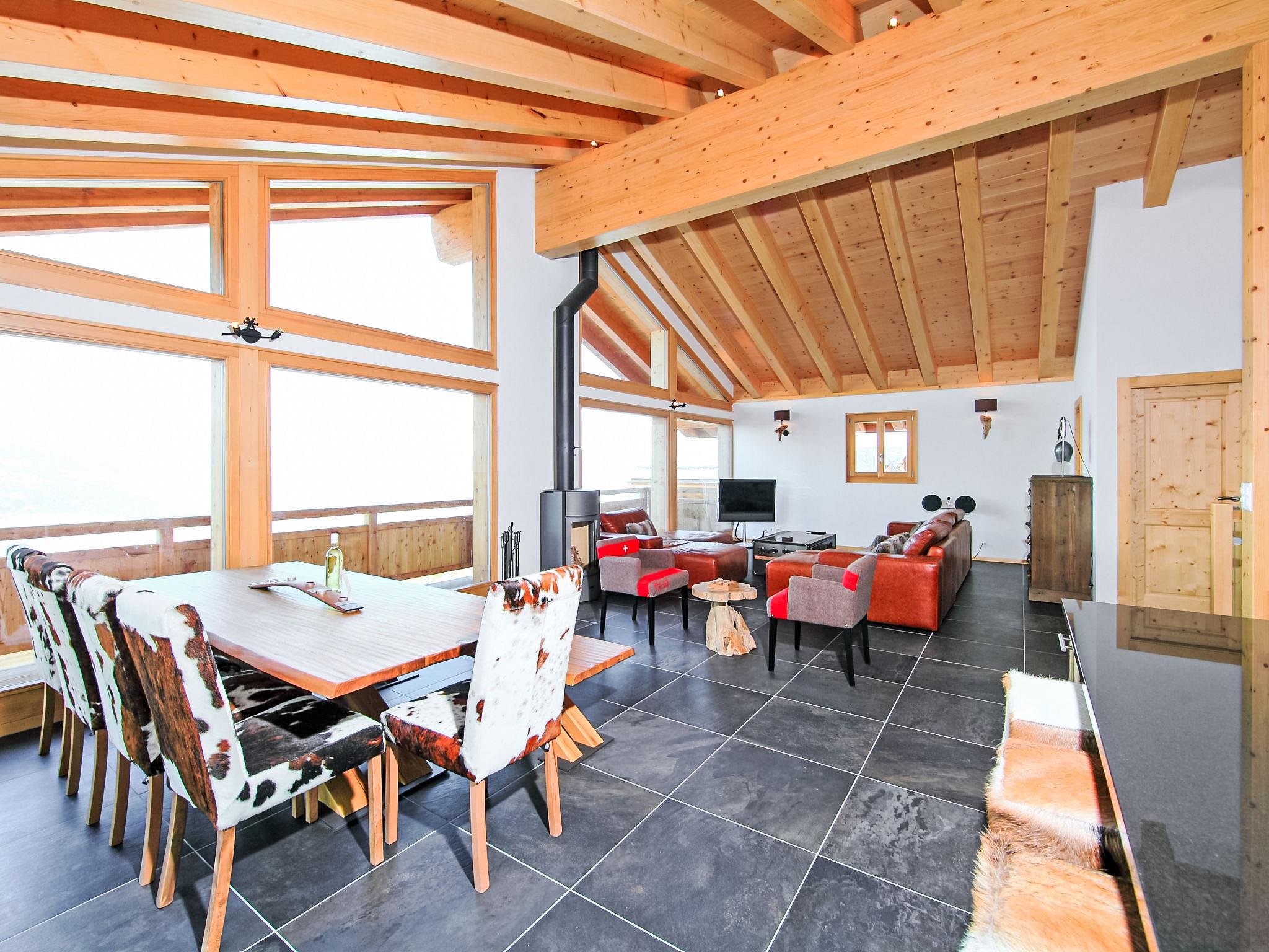"Chalet Flocon de Neige", 5-room chalet 184 m2 on 2 levels. Comfortable furnishings: large living/dining room with panoramic window with Scandinavian wood stove, dining nook, cable TV and DVD. Open kitchen (oven, dishwasher, 6 induction hot plates, toaster, kettle, microwave, electric coffee machine, Capsules for coffee machine (Nespresso) extra, raclette grill, cooking island, fondue Set (cheese)). Sep. WC. Heating. On the lower ground floor: 2 double bedrooms, each room with 2 beds (90 cm, length 200 cm). 1 children's room with 1 bed (90 cm, length 190 cm), 1 x 2 bunk beds (90 cm, length 190 cm), cable TV, flat screen and DVD. 1 double bedroom with 1 french bed (160 cm, length 190 cm), shower/WC, cable TV and flat screen. Bath/WC, shower/WC. Balcony, north facing position, terrace, west facing position and north facing position. Terrace furniture, barbecue, deck chairs (2). Very beautiful view of the mountains and the valley. Facilities: washing machine, dryer, children's high chair, baby cot, hair dryer. Internet (WiFi, free). Parking (3 cars). Please note: non-smoking house.