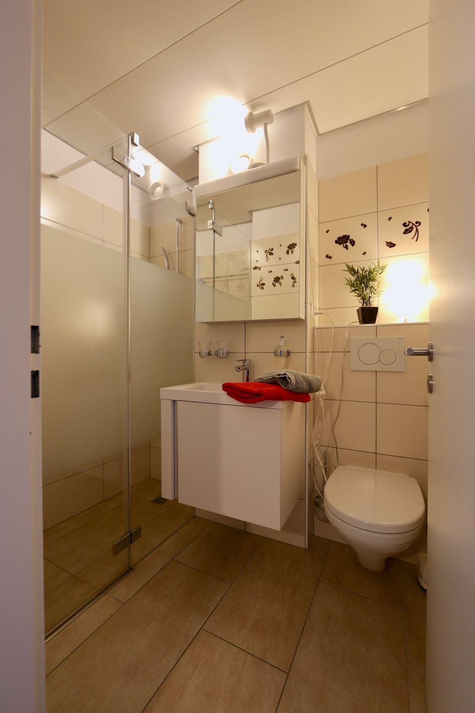 Bad mit Dusche, Waschbecken und WC, Haartrockner.