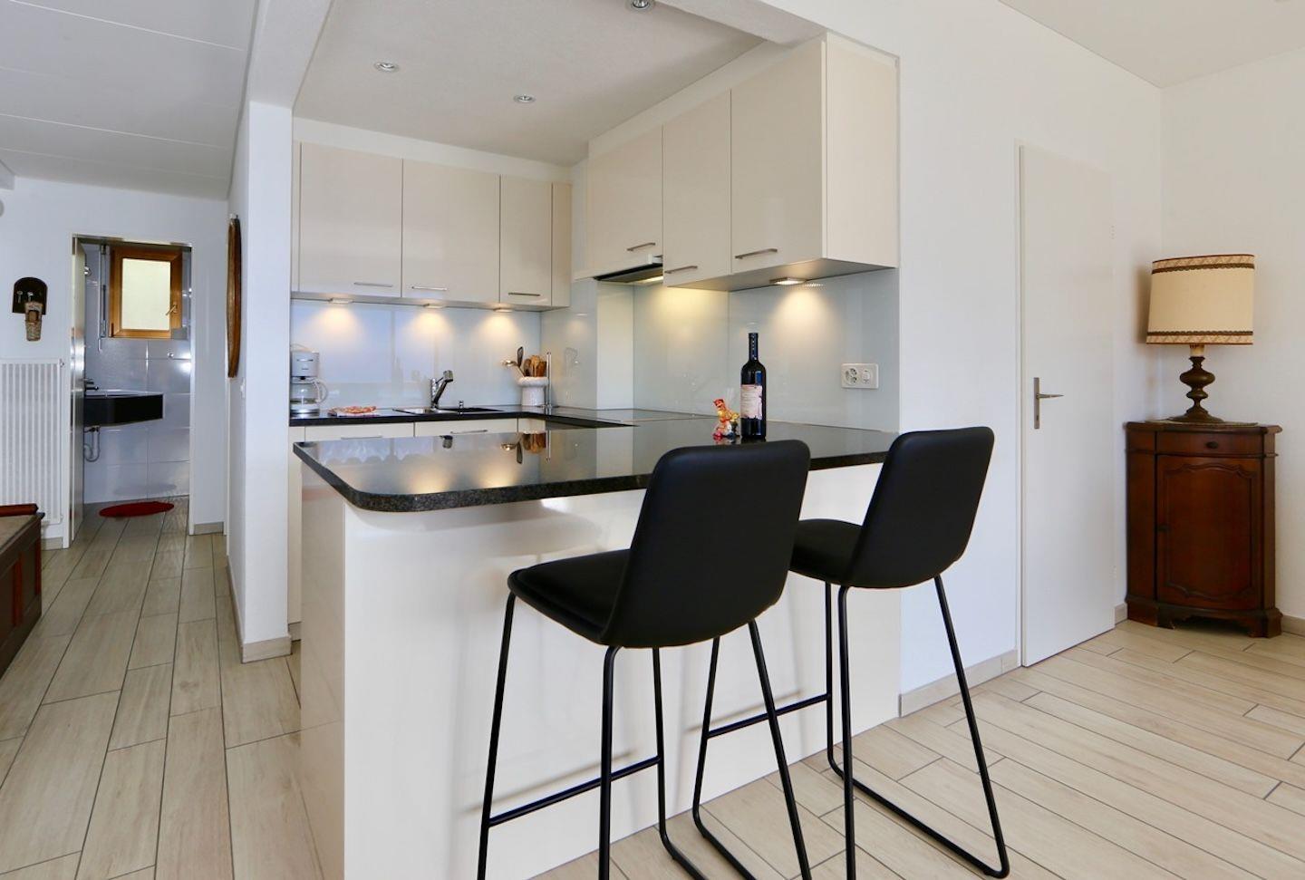 Offene Küche mit Glaskeramikherd, Backofen, Geschirrspüler, Kühlschrank, Nespressomaschine.
