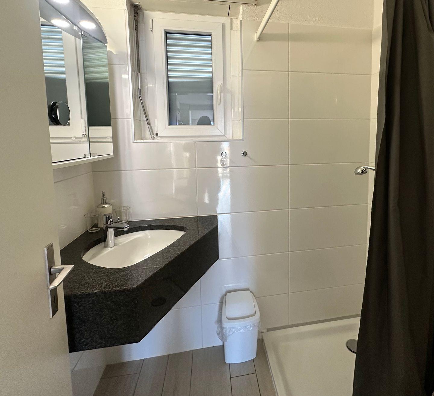 Badezimmer mit Dusche, Waschbecken, Haartrockner, separates WC.