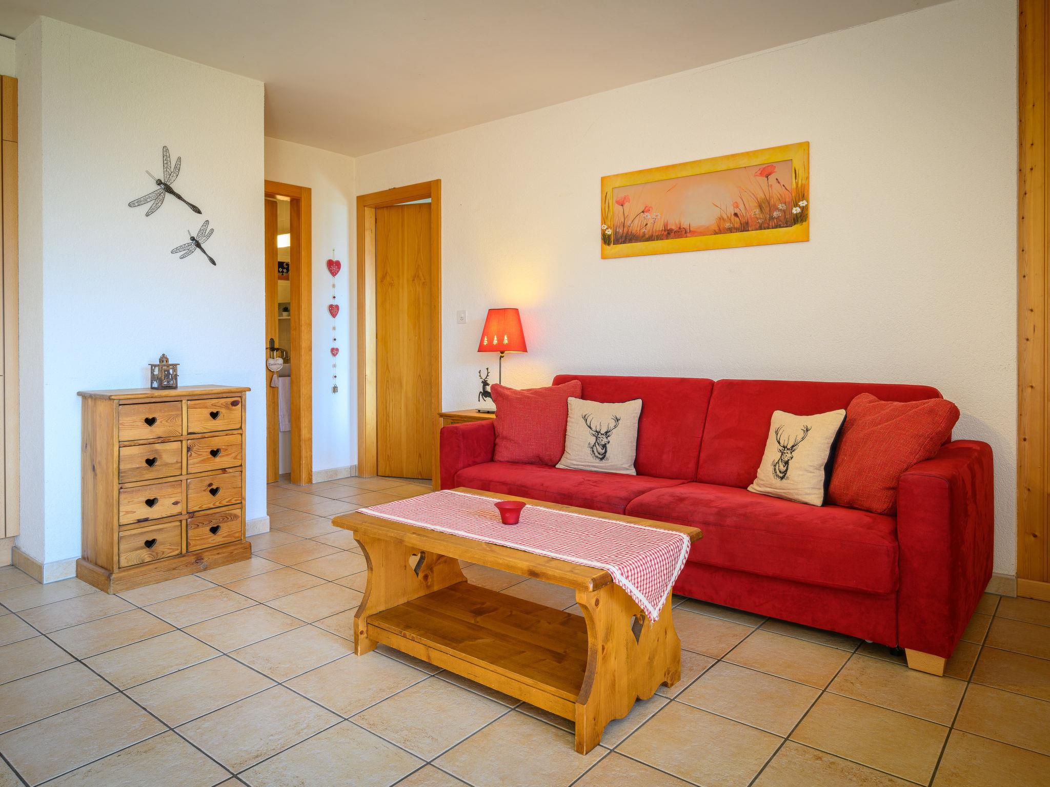 "Plein Sud 3", 2-room apartment 43 m2, on the ground floor, south-east facing position. Comfortable and tasteful furnishings: living/dining room with 1 sofabed, TV and flat screen. Exit to the terrace, south facing position and east facing position. 1 room with 1 double bed (2 x 80 cm, length 200 cm). Exit to the terrace, south facing position and east facing position. Open kitchen (4 hot plates, oven, dishwasher, toaster, kettle, electric coffee machine, Capsules for coffee machine (Nespresso) extra, raclette grill, fondue Set (chinoise, cheese)). Shower/WC. Underfloor heating. Large terrace, lawn. Terrace furniture, barbecue. Beautiful view of the mountains. Facilities: Internet (WiFi). Parking (1 car). Please note: non-smokers only.