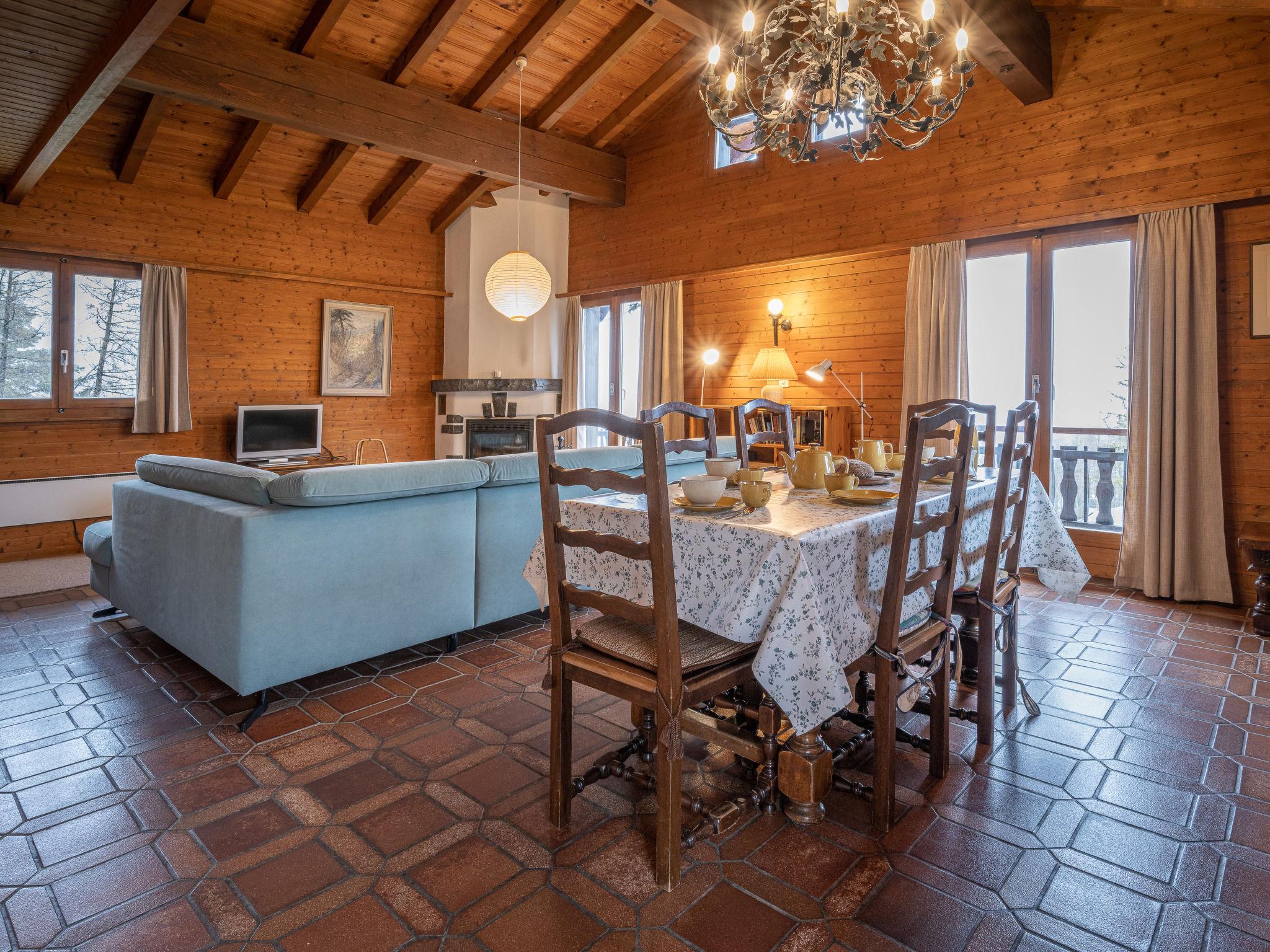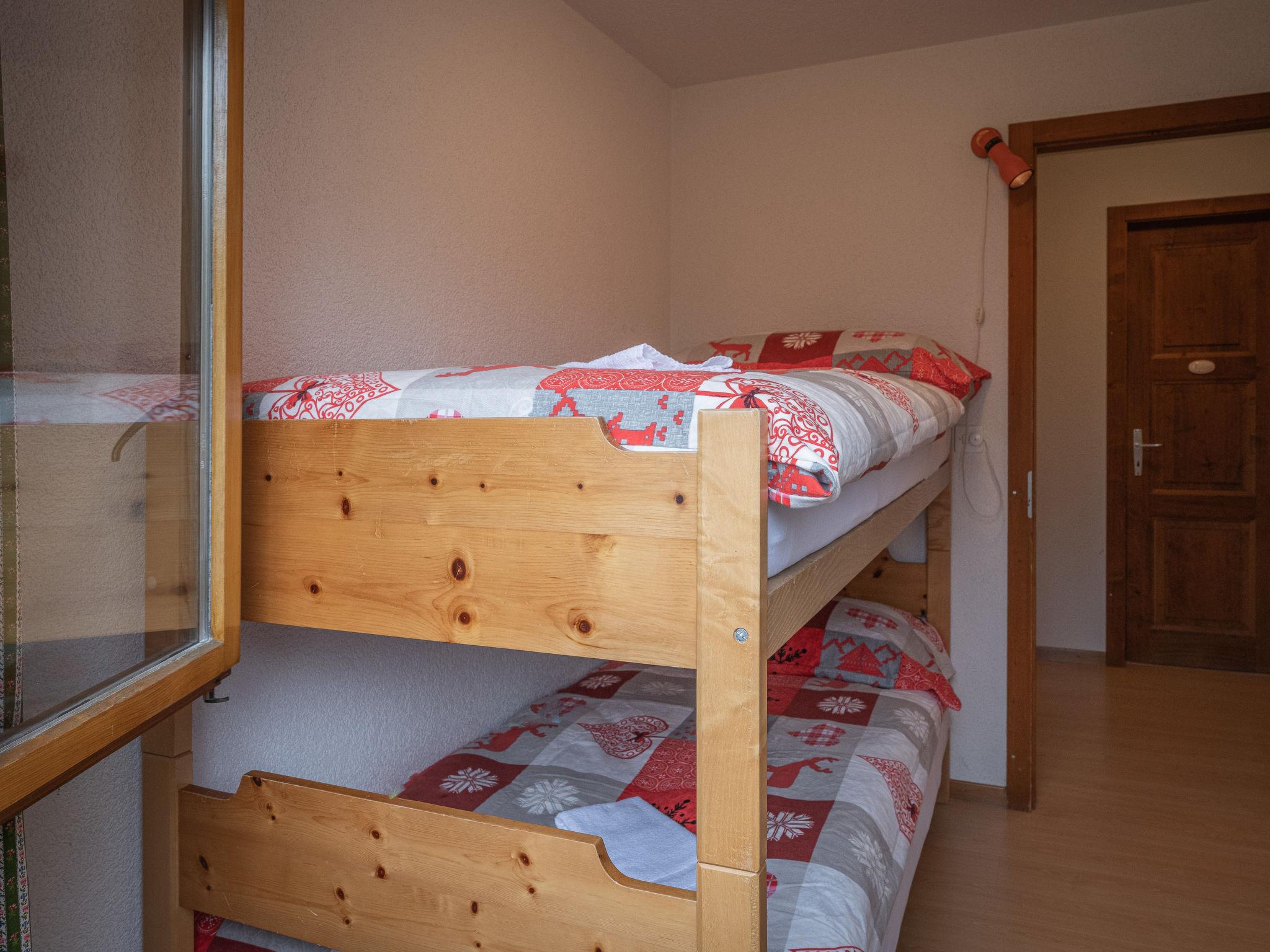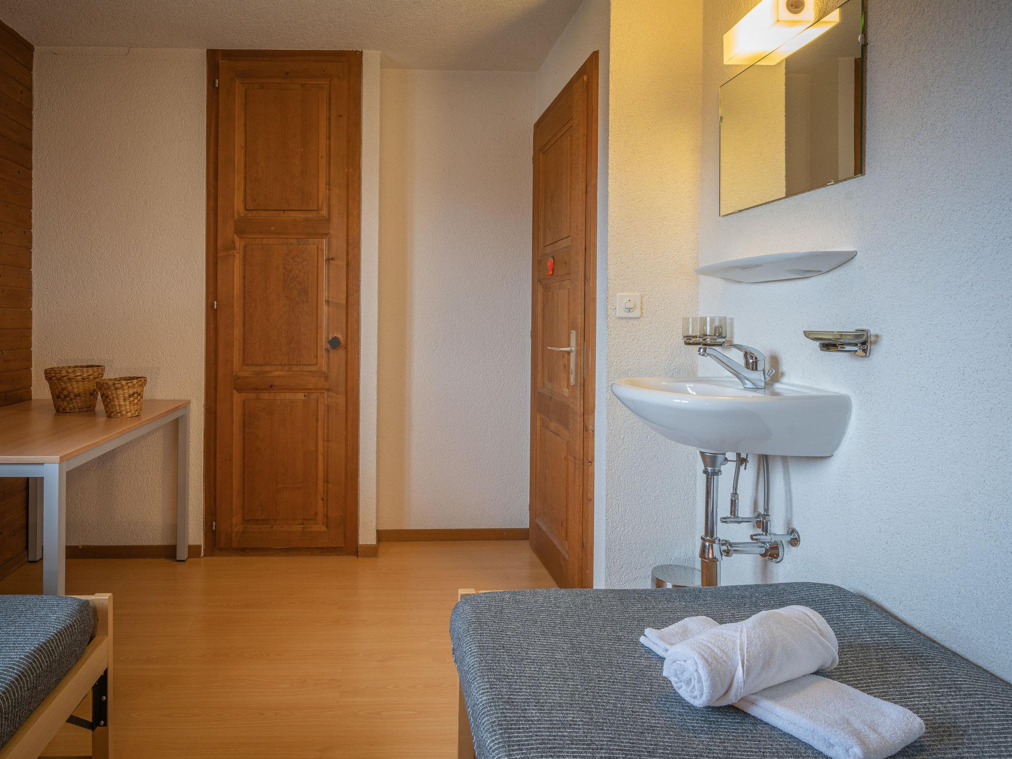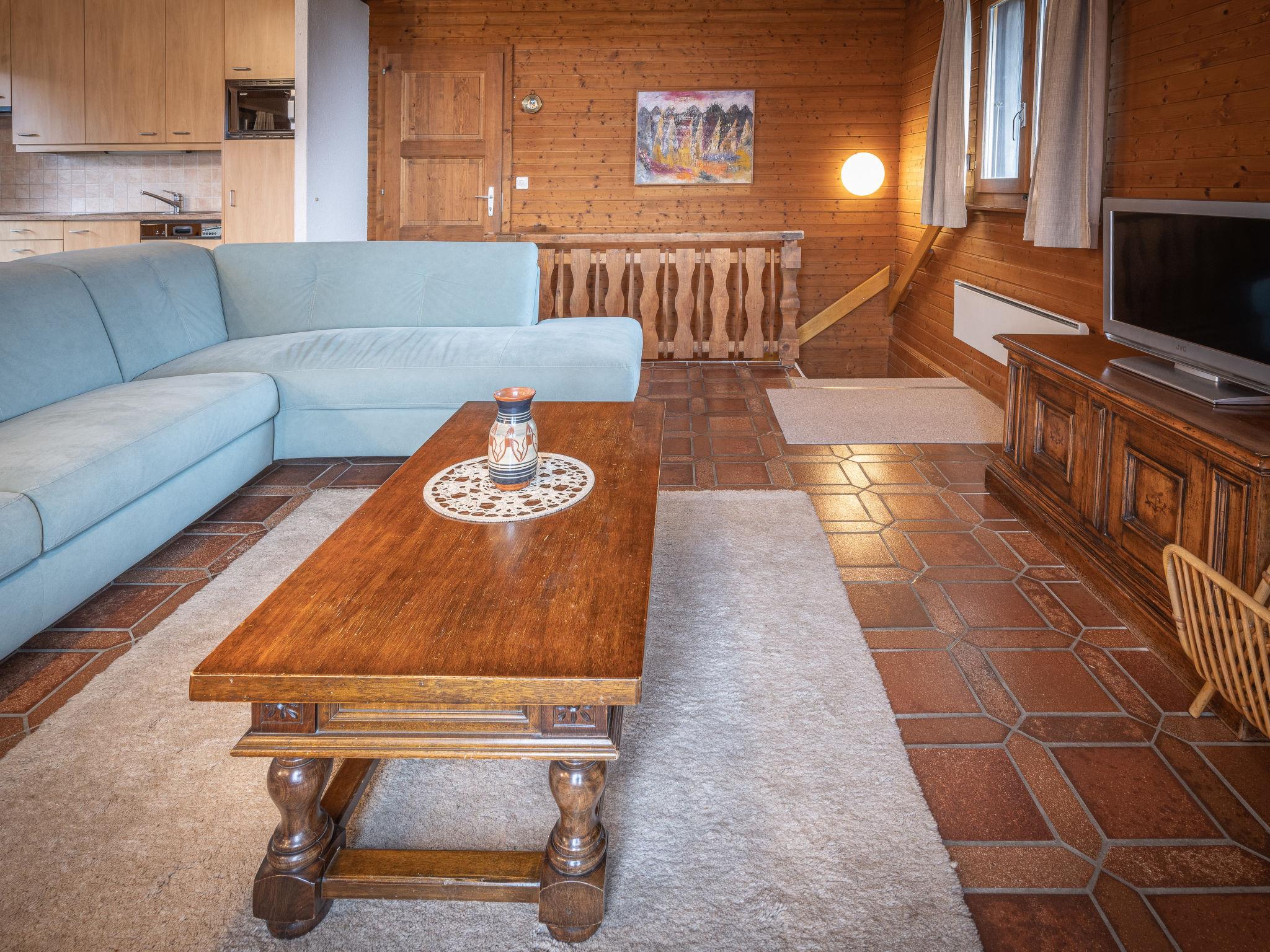 4-room chalet on 2 levels, south facing position. Comfortable furnishings: living/dining room with open-hearth fireplace, TV and radio. Exit to the balcony. Kitchenette (oven, dishwasher, 4 ceramic glass hob hotplates, toaster, microwave, electric coffee machine, Capsules for coffee machine (Nespresso) extra, fondue Set (chinoise, cheese)). Sep. WC. On the lower ground floor: 1 room with 2 beds (90 cm). 1 room with 2 beds and hand-basin. 1 children's room with 1 x 2 bunk beds. Bath/WC, shower. Electric heating. Balcony. Deck chairs, box-room. Beautiful view of the mountains. Facilities: iron, baby cot for up to 2 year olds. Internet (WiFi, free). Garage. Please note: non-smokers only.