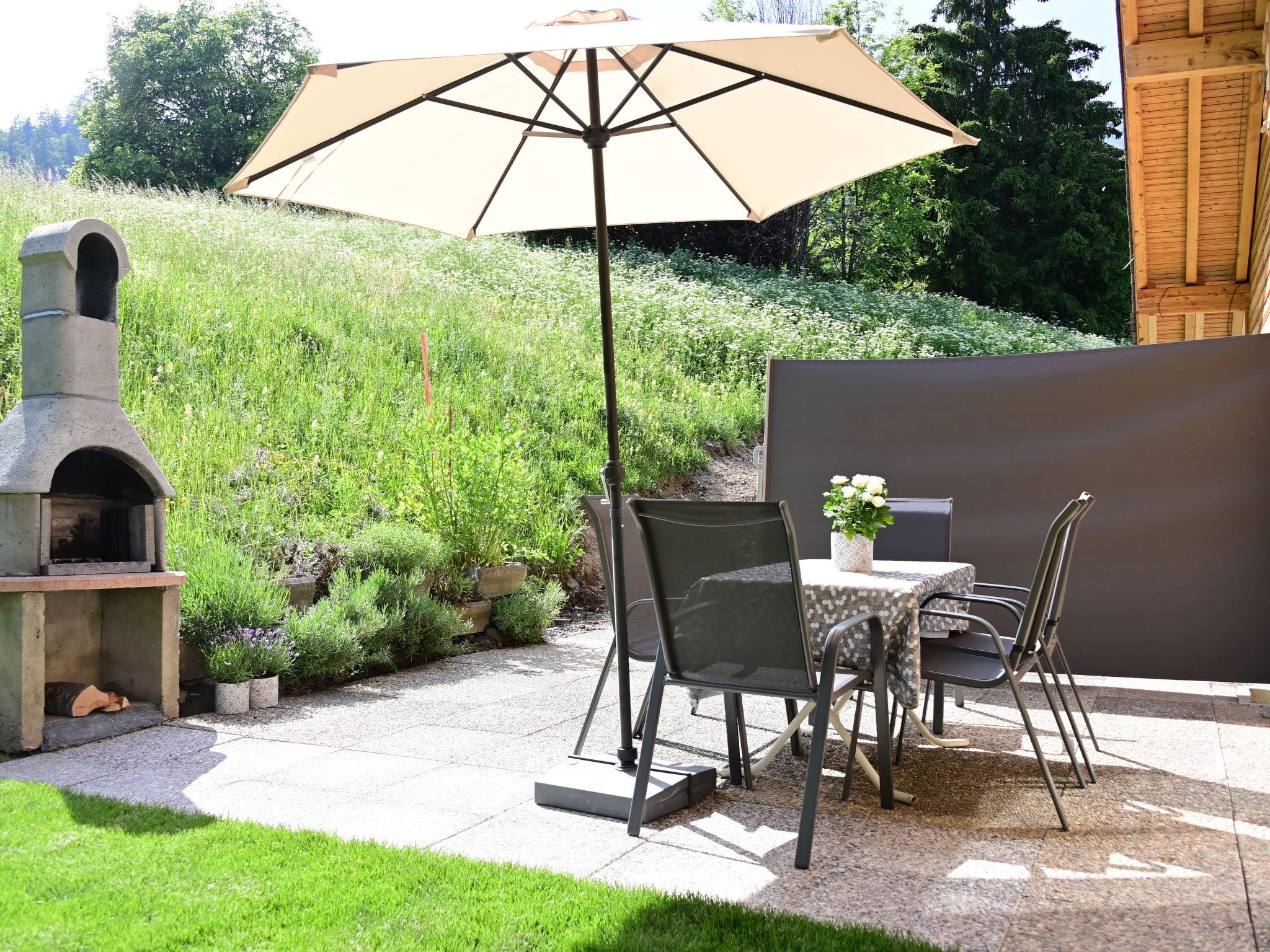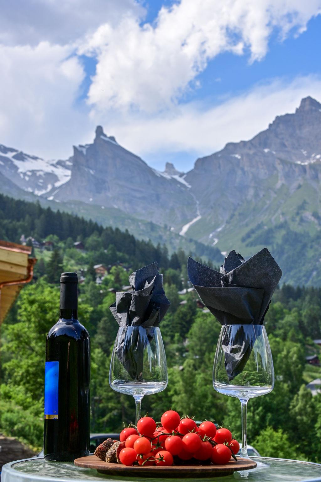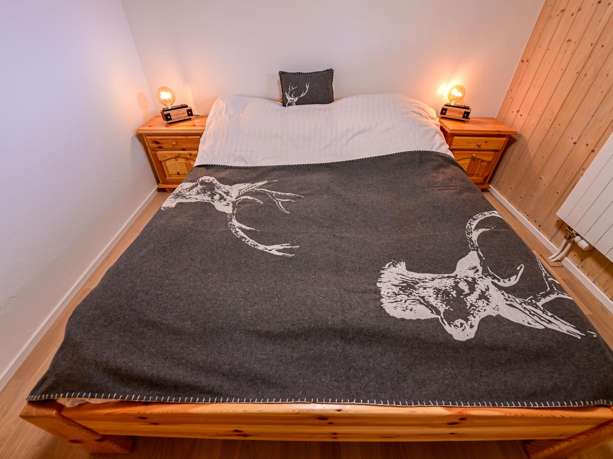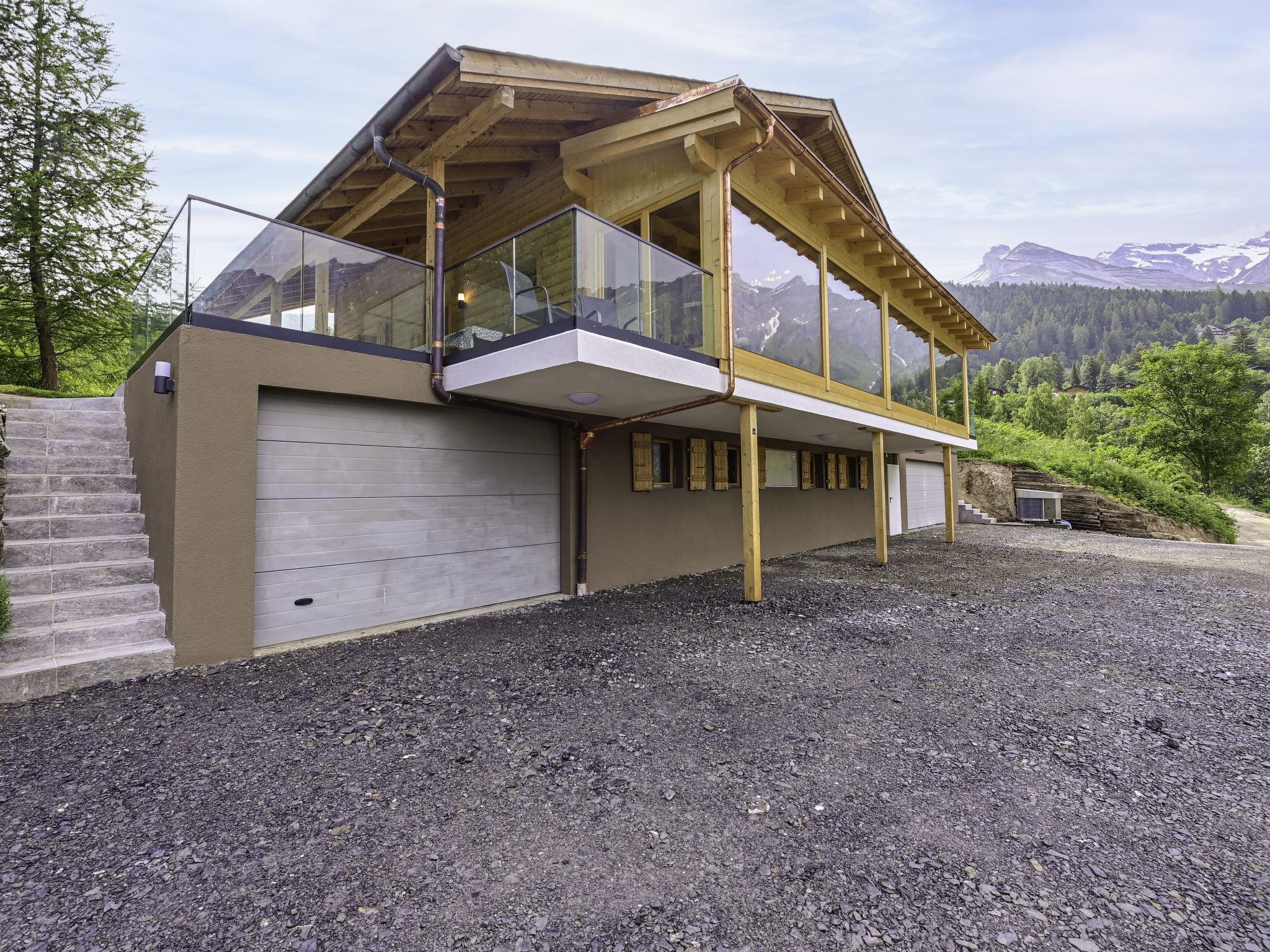 "Paisible", 5-room semi-detached house 165 m2 on 3 levels. Spacious, fully renovated in 2021, comfortable and modern furnishings: entrance hall. Large living room with panoramic window with Scandinavian wood stove, cable TV and flat screen. Exit to the terrace, south-east facing position. Open kitchen (oven, dishwasher, 4 ceramic glass hob hotplates, toaster, kettle, microwave, freezer, electric coffee machine, Capsules for coffee machine (Nespresso+ Delongi) extra, raclette grill, fondue Set (chinoise, cheese)) with dining table. Exit to the terrace, south-west facing position. Sep. WC. On the lower ground floor: 1 room with 1 double bed (2 x 80 cm, length 200 cm). 1 room with 1 bed (90 cm, length 200 cm), TV and video. Shower, shower/WC. Upper floor: luggage room with Dressing room. 1 room with 1 french bed (160 cm, length 200 cm), cable TV. 1 room with 2 beds (90 cm, length 190 cm), 1 x 2 bunk beds (90 cm, length 200 cm). Large terrace 36 m2, south-east facing position, large terrace 14 m2, south-west facing position, lawn. Terrace furniture, barbecue, deck chairs (5), box-room. Very beautiful view of the mountains. Facilities: iron, children's high chair, baby cot for up to 3 year olds, hair dryer, logs (free). Internet (WiFi, free). Parking (2 cars), garage (1 car), height 210 cm, width 320 cm. Please note: suitable for families. Non-smoking house.