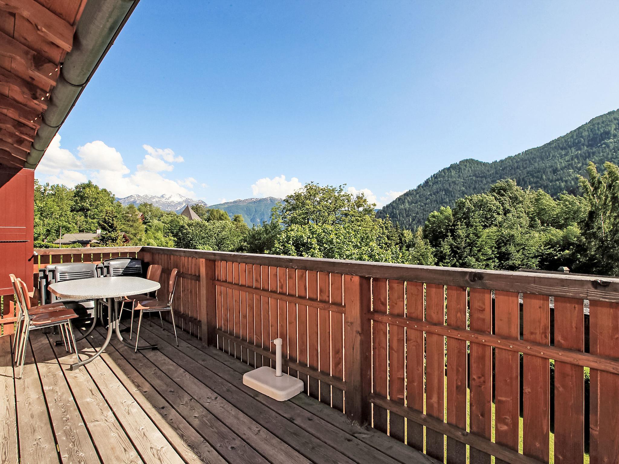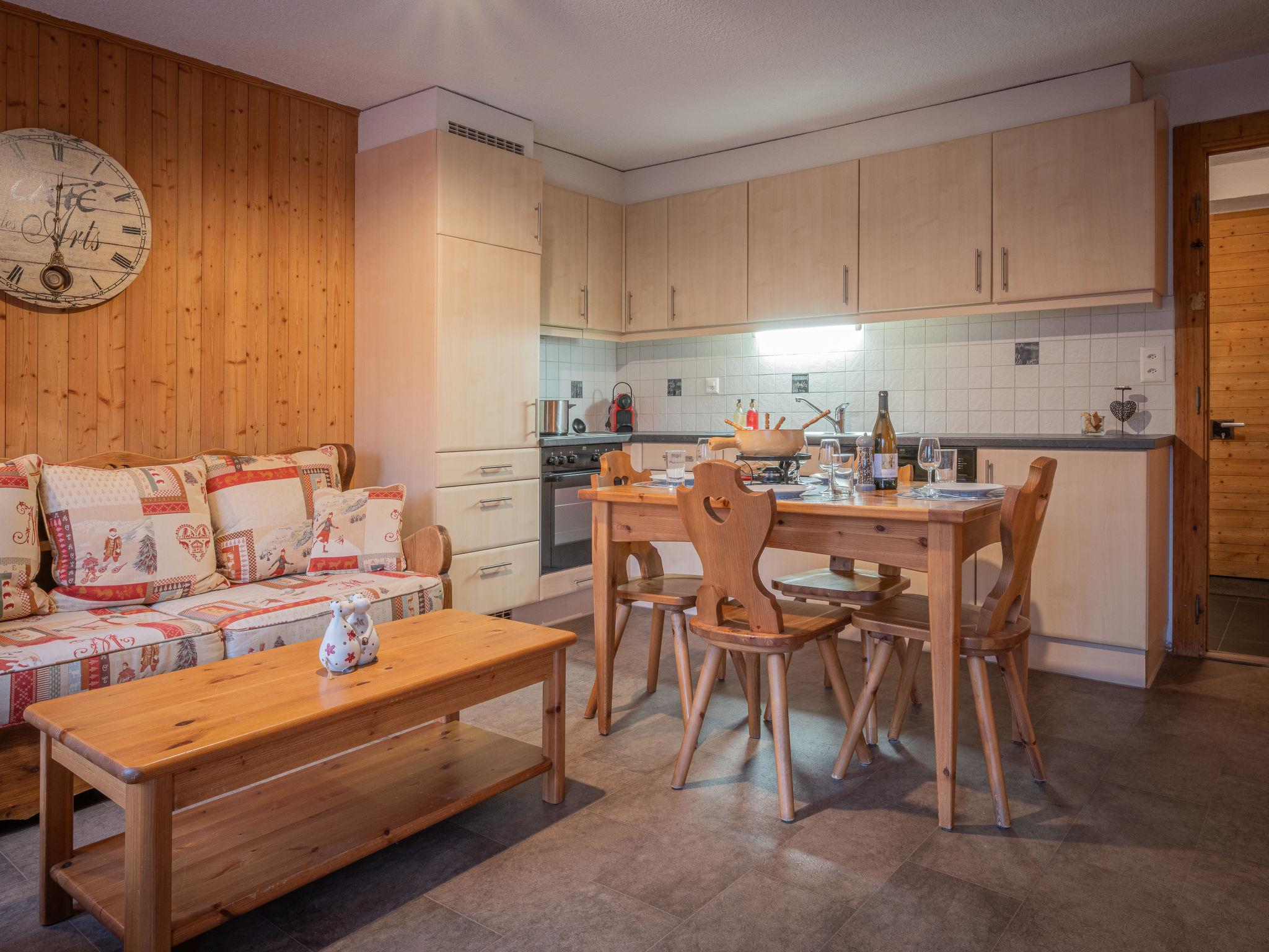 "Vers Saille", 3-room terraced house 55 m2, on the upper floor. Comfortable and beautiful furnishings: living/dining room with dining table, cable TV, radio, CD-player and electric heating. Exit to the balcony, south-west facing position. 1 room with 2 beds (90 cm, length 200 cm). 1 room with 1 double bed (180 cm, length 200 cm). Open kitchen (oven, dishwasher, raclette grill, fondue Set (cheese)). Shower/WC. Balcony terrace 40 m2, lawn. Terrace furniture, balcony furniture. Beautiful view of the mountains. Facilities: Internet (WiFi, free). Parking at the house. Please note: non-smokers only. Private entrance.