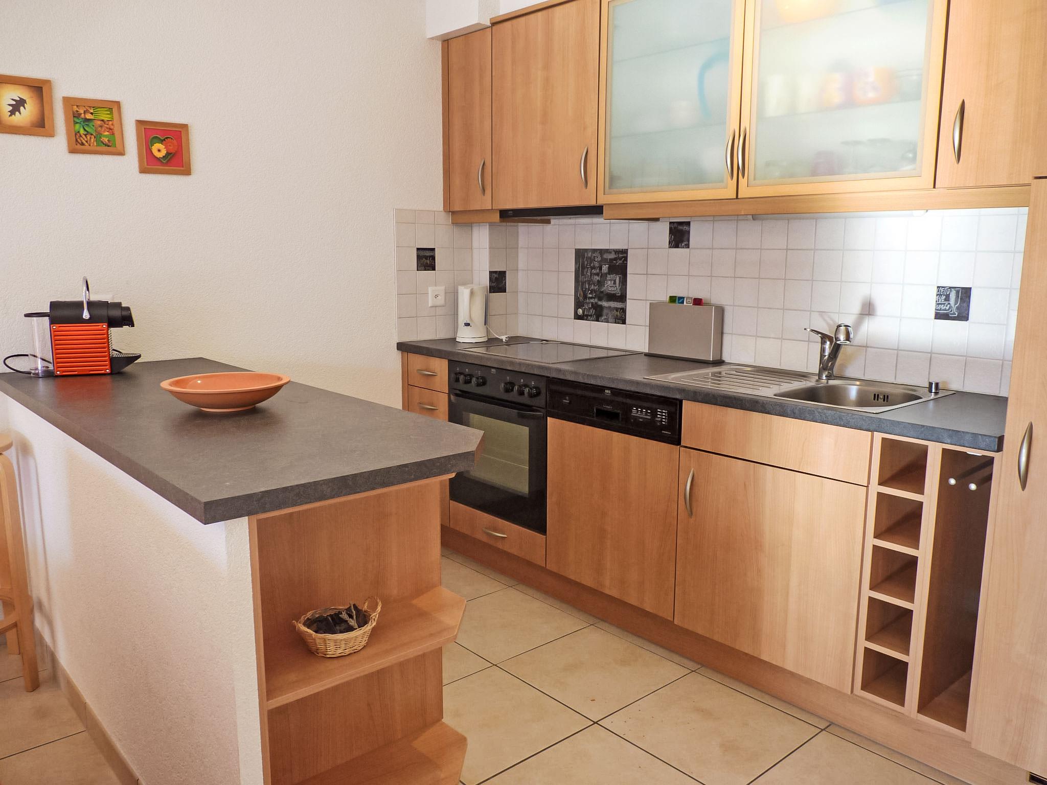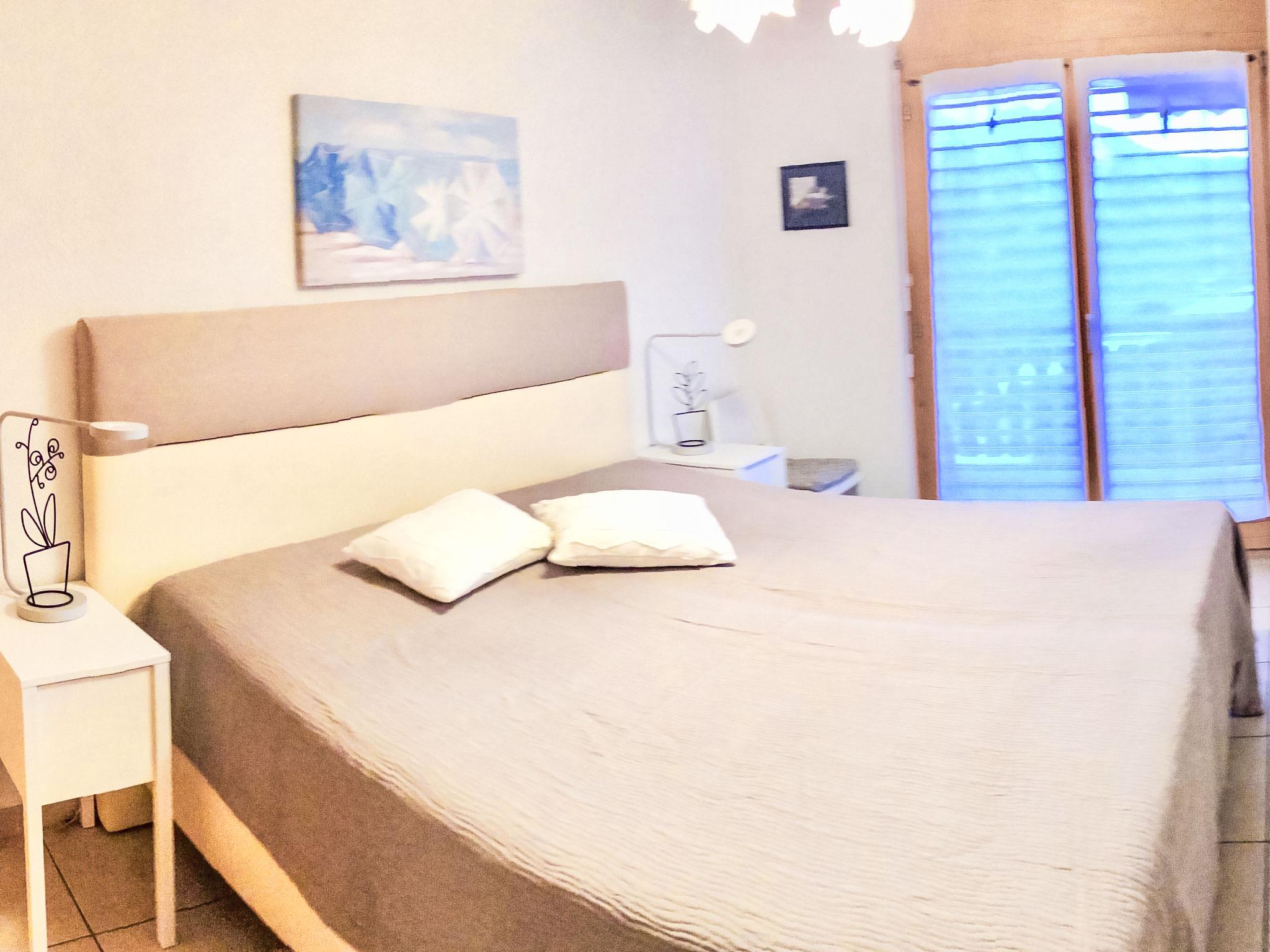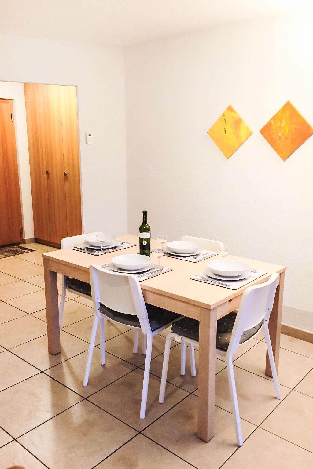 "Viognier 5", 2-room apartment 60 m2 on 2nd floor, south facing position. Comfortable and modern furnishings: entrance hall. Living/dining room with 1 sofabed (140 cm, length 200 cm), open-hearth fireplace and cable TV (flat screen). Exit to the balcony, south facing position. 1 room with 1 double bed (180 cm, length 200 cm). Open kitchen (dishwasher, 4 ceramic glass hob hotplates, microwave, electric coffee machine, Capsules for coffee machine (Nespresso) extra, raclette grill, fondue Set (chinoise, cheese)). Shower/WC. Underfloor heating. Large balcony 17 m2. Balcony furniture, deck chairs (4). Very beautiful view of the mountains. Facilities: Internet (WiFi, free). Parking (2 cars). Please note: non-smokers only.