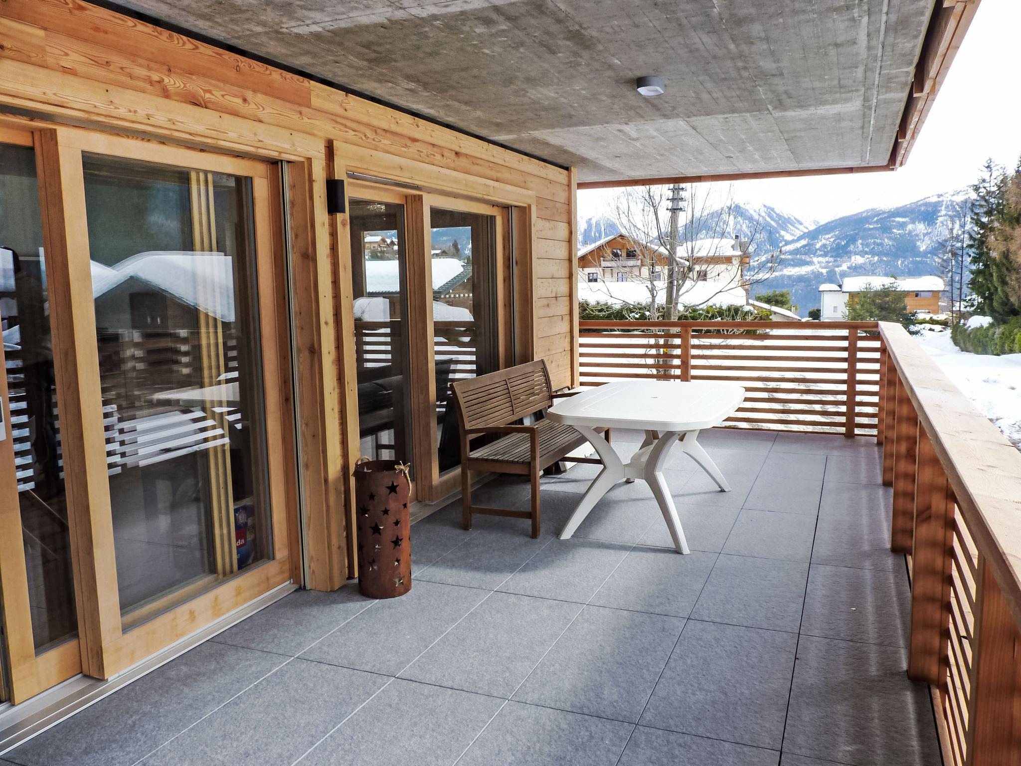 "Jardins d'Helene", 3-room apartment 74 m2 on 1st floor, south-west facing position. Object suitable for 2 adults + 2 children. Practical and modern furnishings: living/dining room with flat screen. Exit to the balcony. 1 room with 1 french bed (160 cm, length 200 cm). 1 children's room with 1 x 1 bunk beds (85 cm, length 180 cm). Open kitchen (4 ceramic glass hob hotplates, electric coffee machine, Capsules for coffee machine (NESPRESSO) extra, raclette grill, fondue Set (cheese)). Shower/WC. Large balcony 27 m2, south-west facing position. Balcony furniture, deck chairs (3). Beautiful view of the mountains. Facilities: washing machine, hair dryer. Internet (WiFi, free). Parking space n 4 (1 car), garage space n 4 (1 car), height 210 cm, width 230 cm. E-charging station. Please note: suitable for families. Non-smokers only.