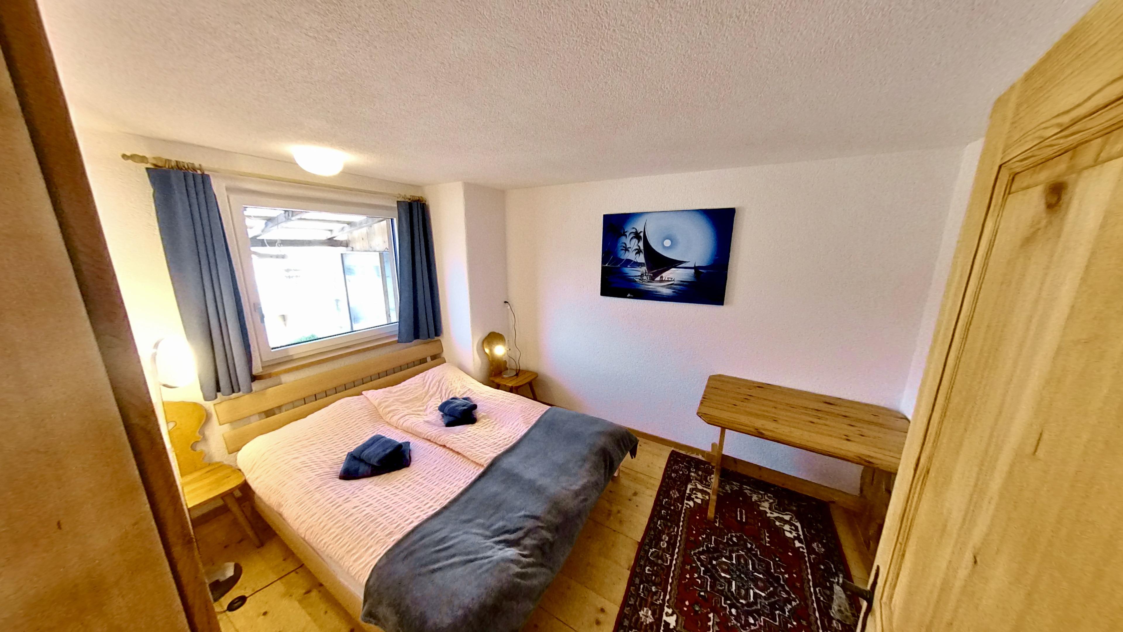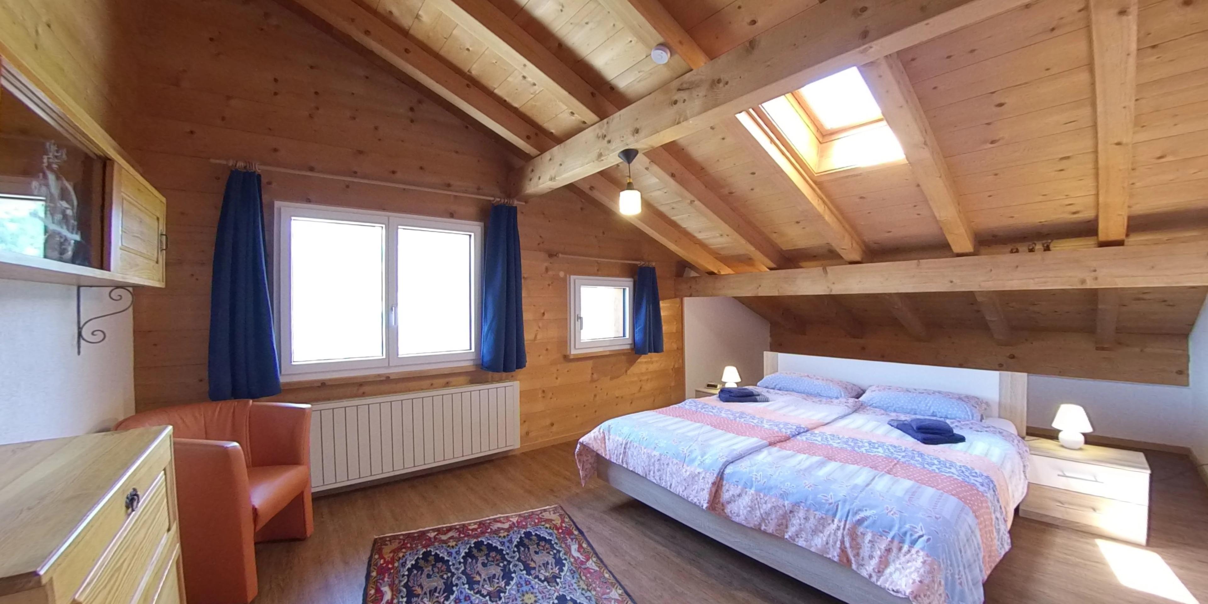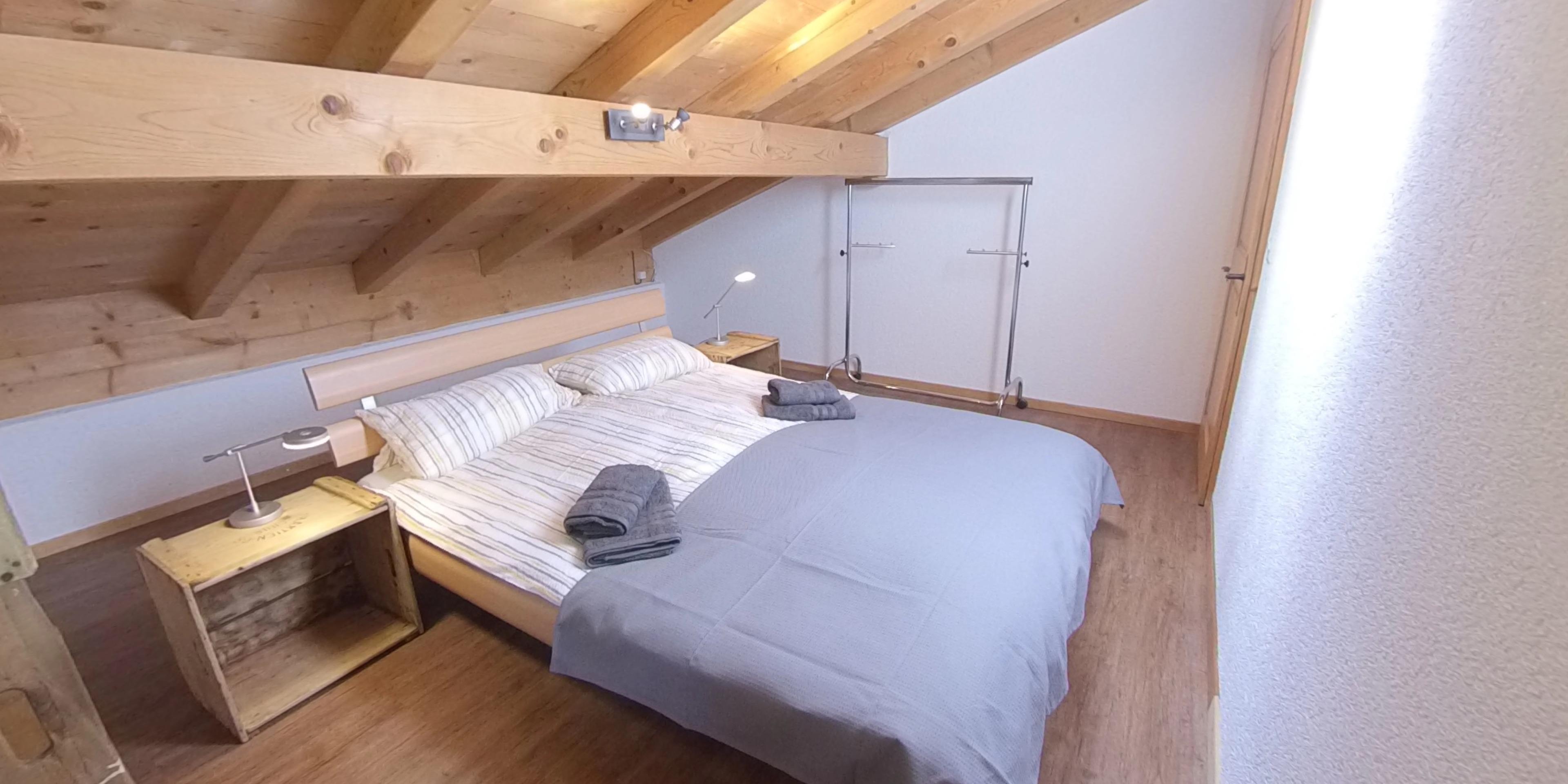 2 geräumige Doppelzimmer mit Doppelbett 180x200cm und 1 kleineres Zimmer mit Doppelbett 180x200cm. Zustellbett 90x200cm oder Kinderbett 70x140cm auf Anfrage möglich. Ein Badezimmer mit Badewanne/WC.