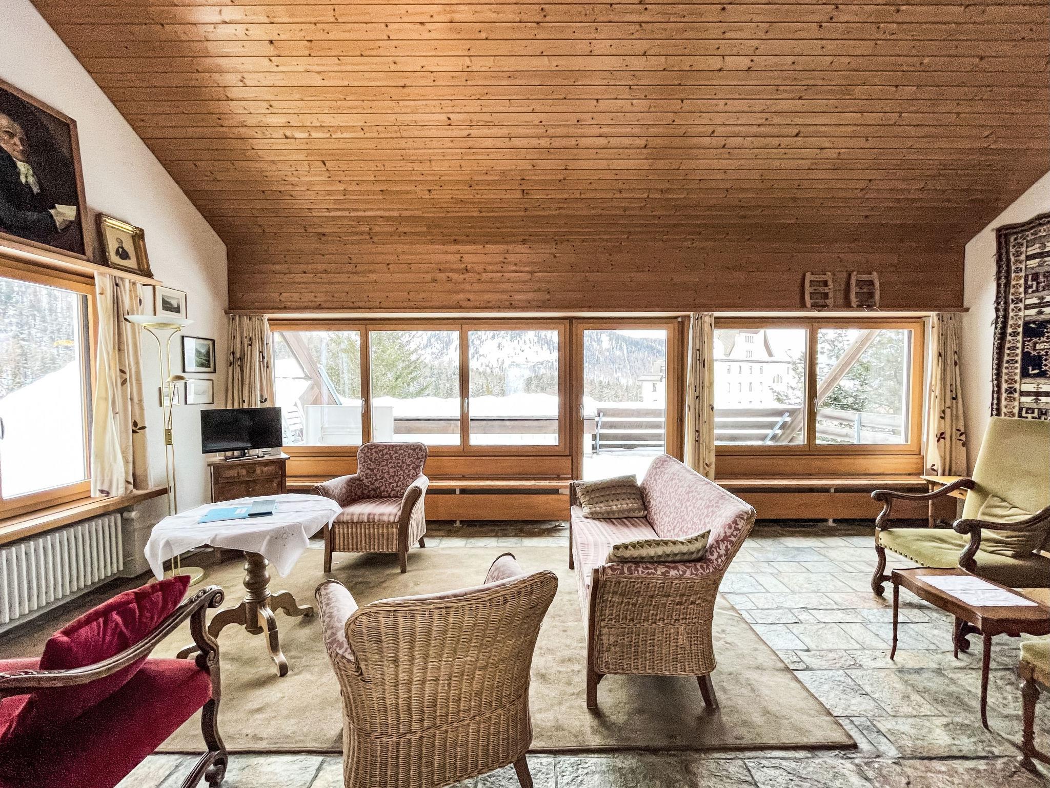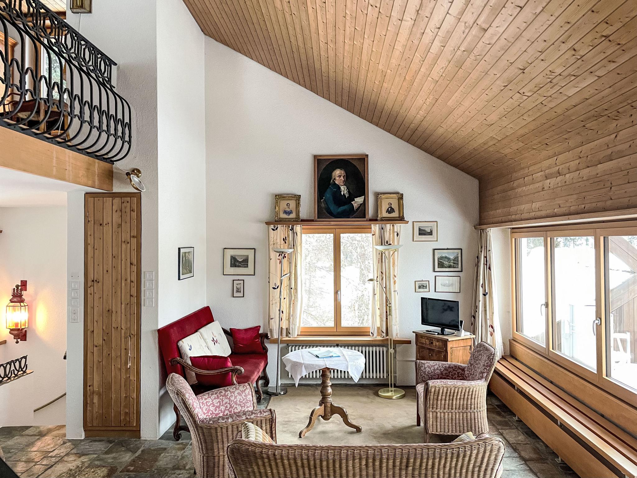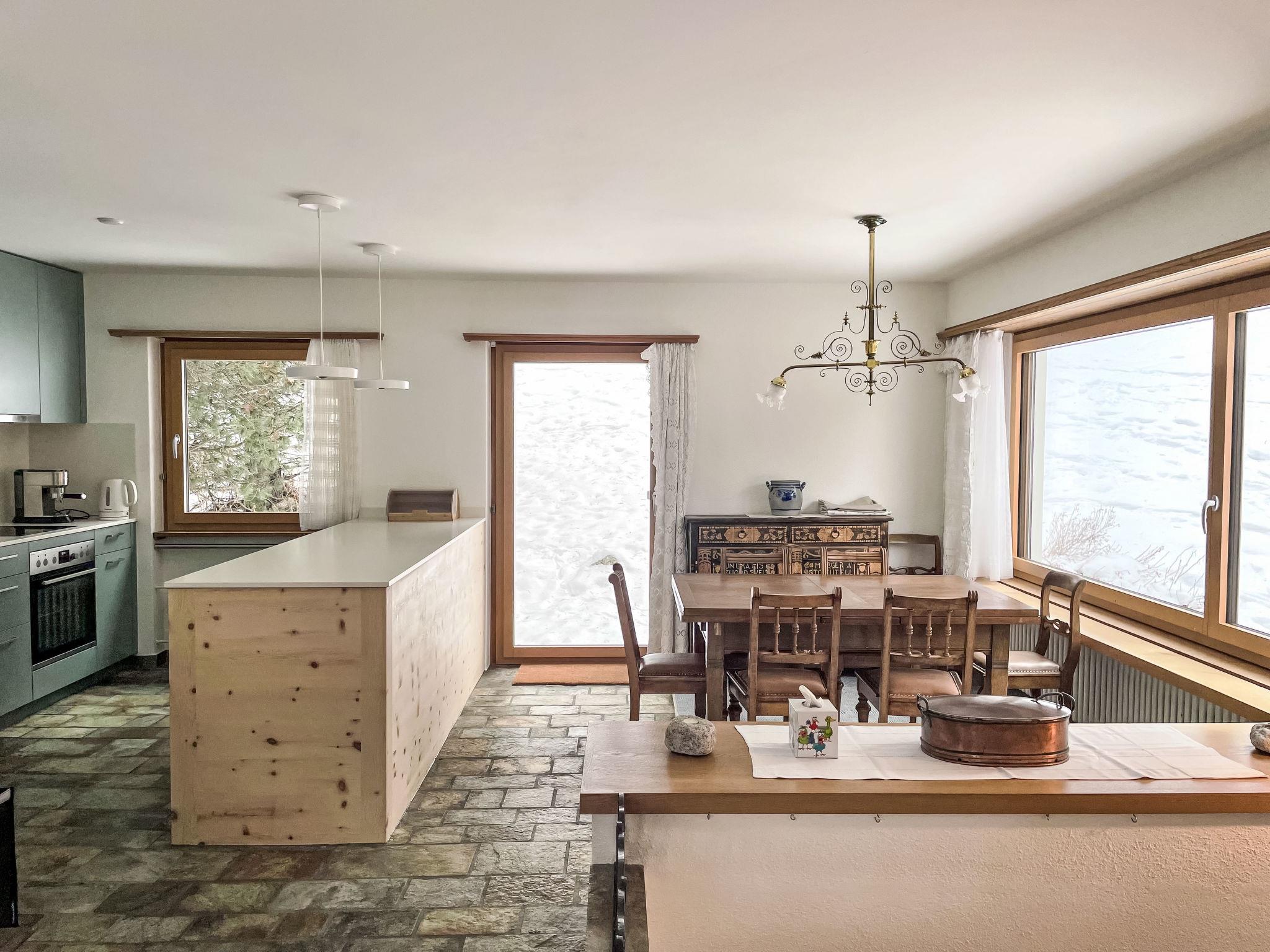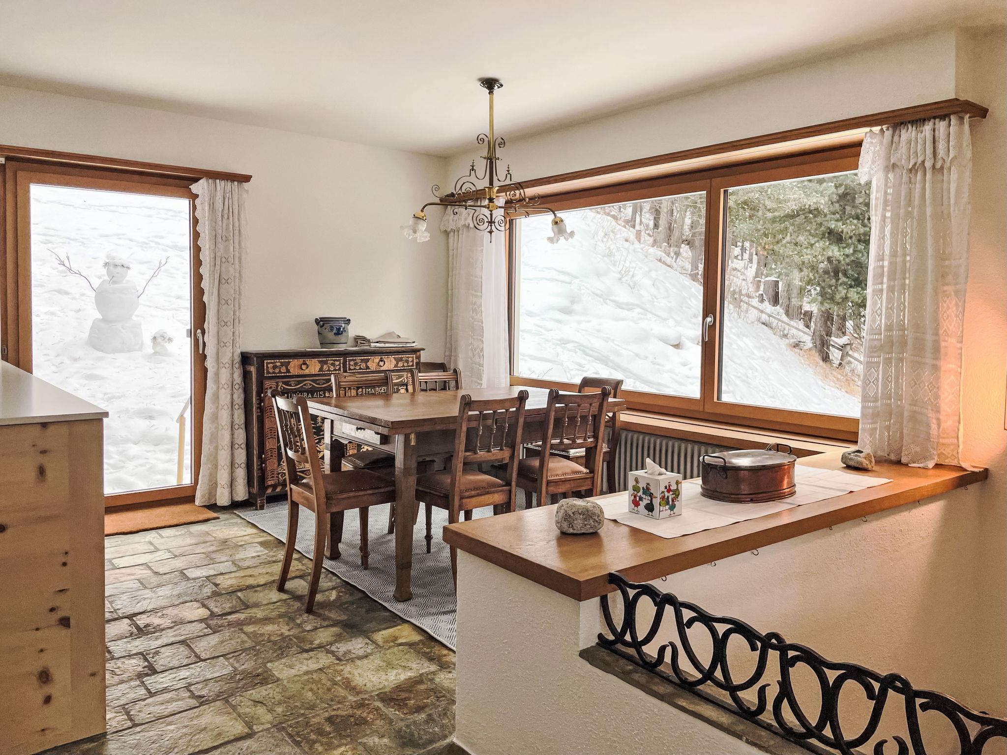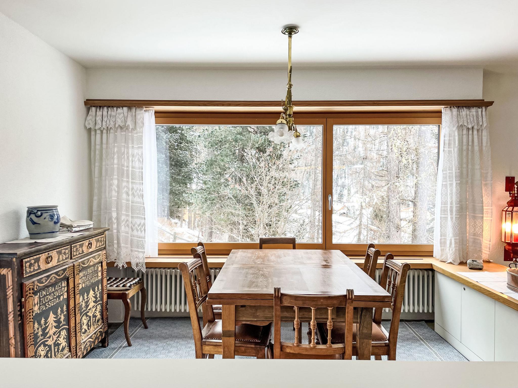 The 150 m2 apartment is located in the top of three terrace houses (access via stairs – without lift) and offers wonderful views: the view from the living area over the whole Julier chain is fantastic at any time of the day. From the dining area you can see into the forest – here the squirrels sometimes come to visit you for breakfast. The evening sun on the Segantini hut is also in view.
