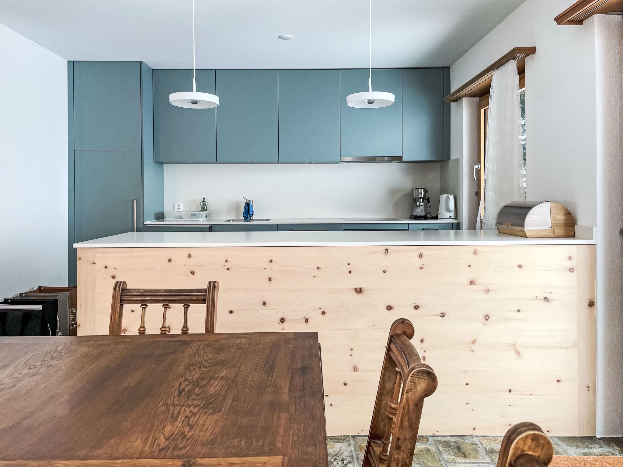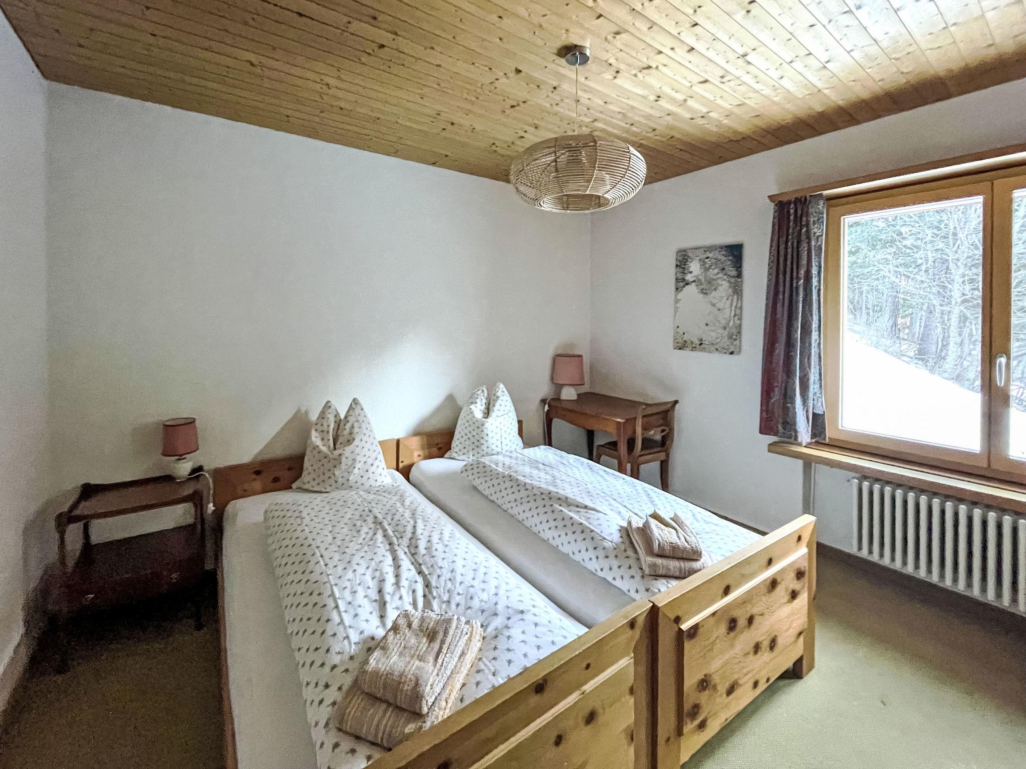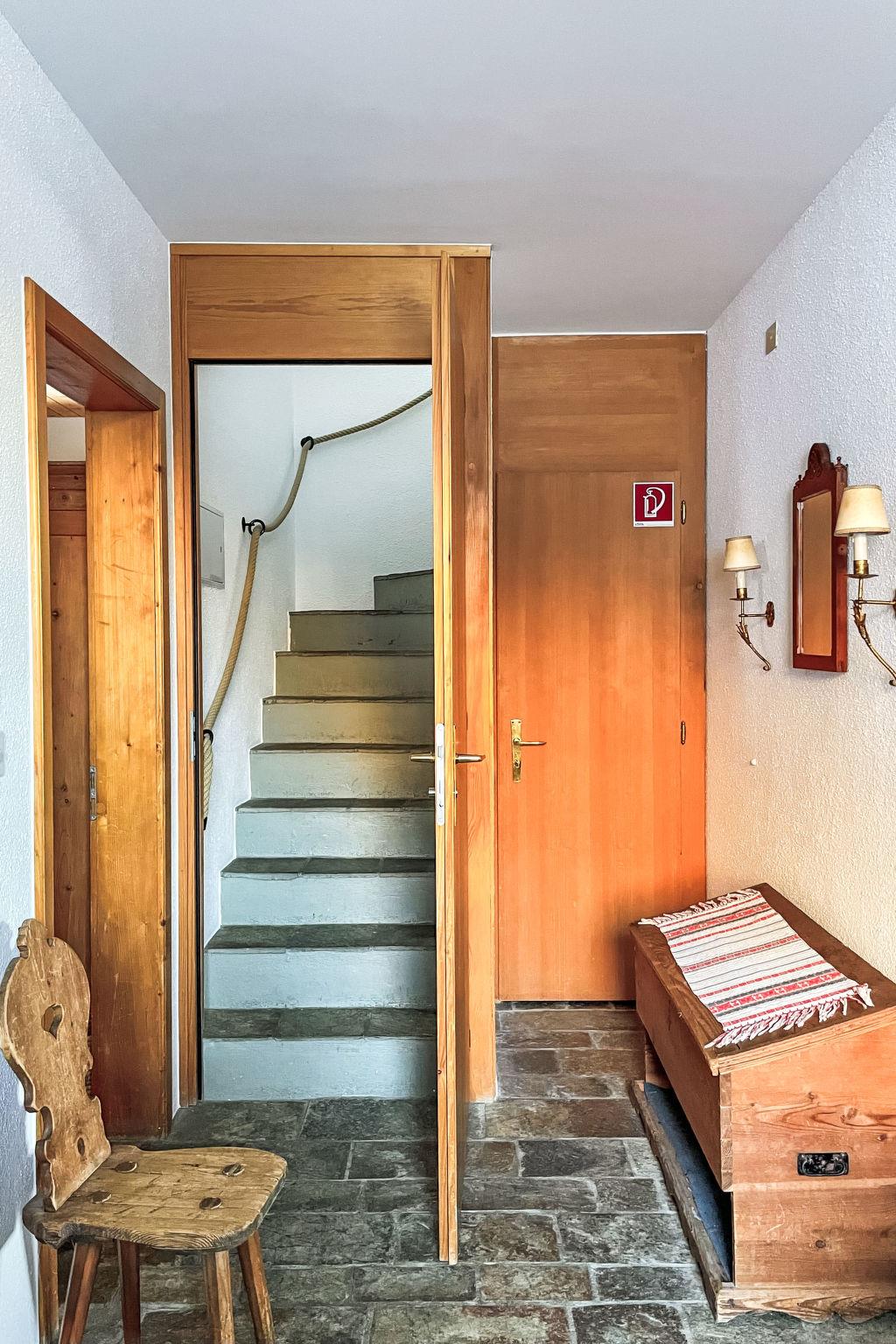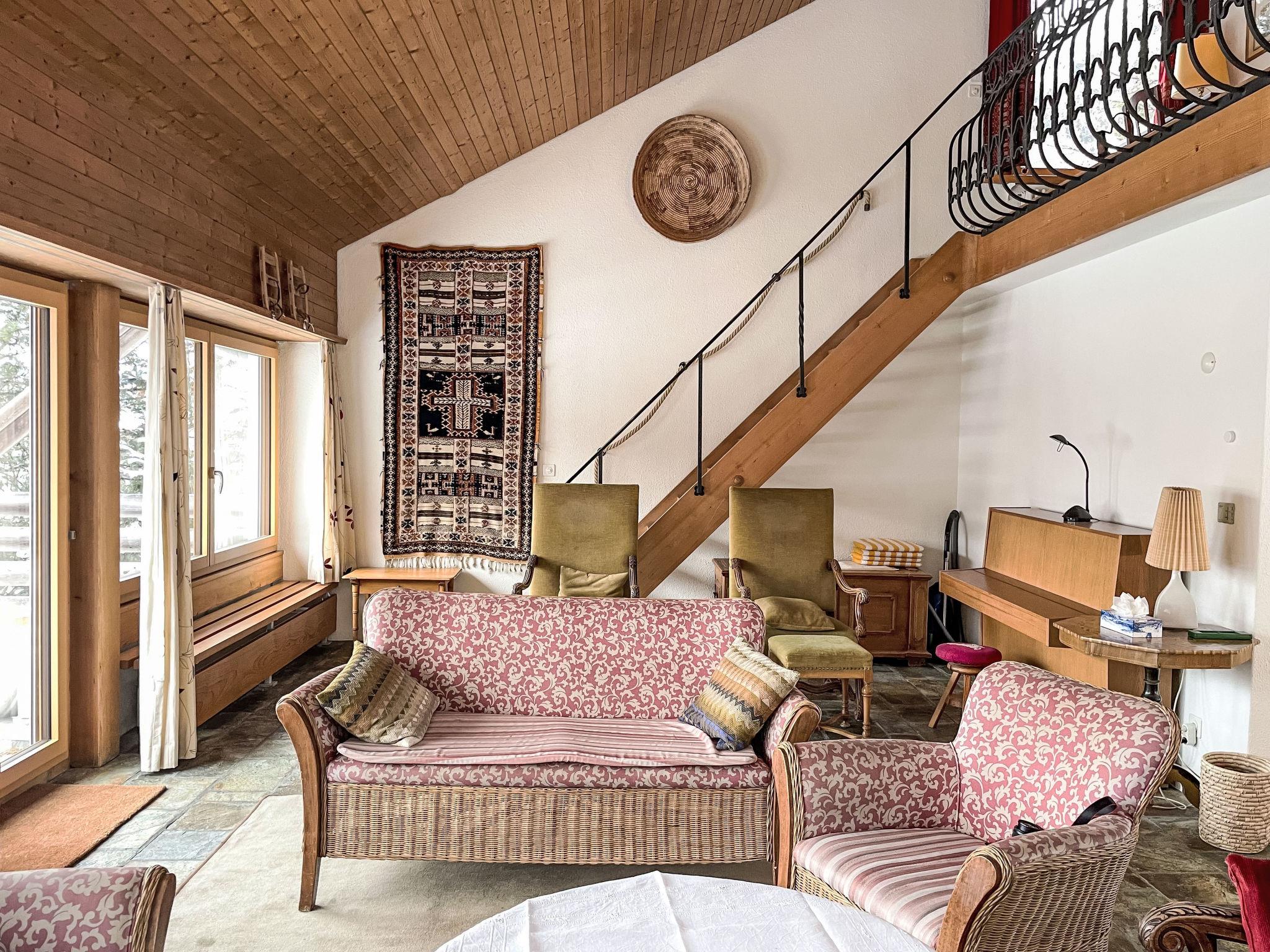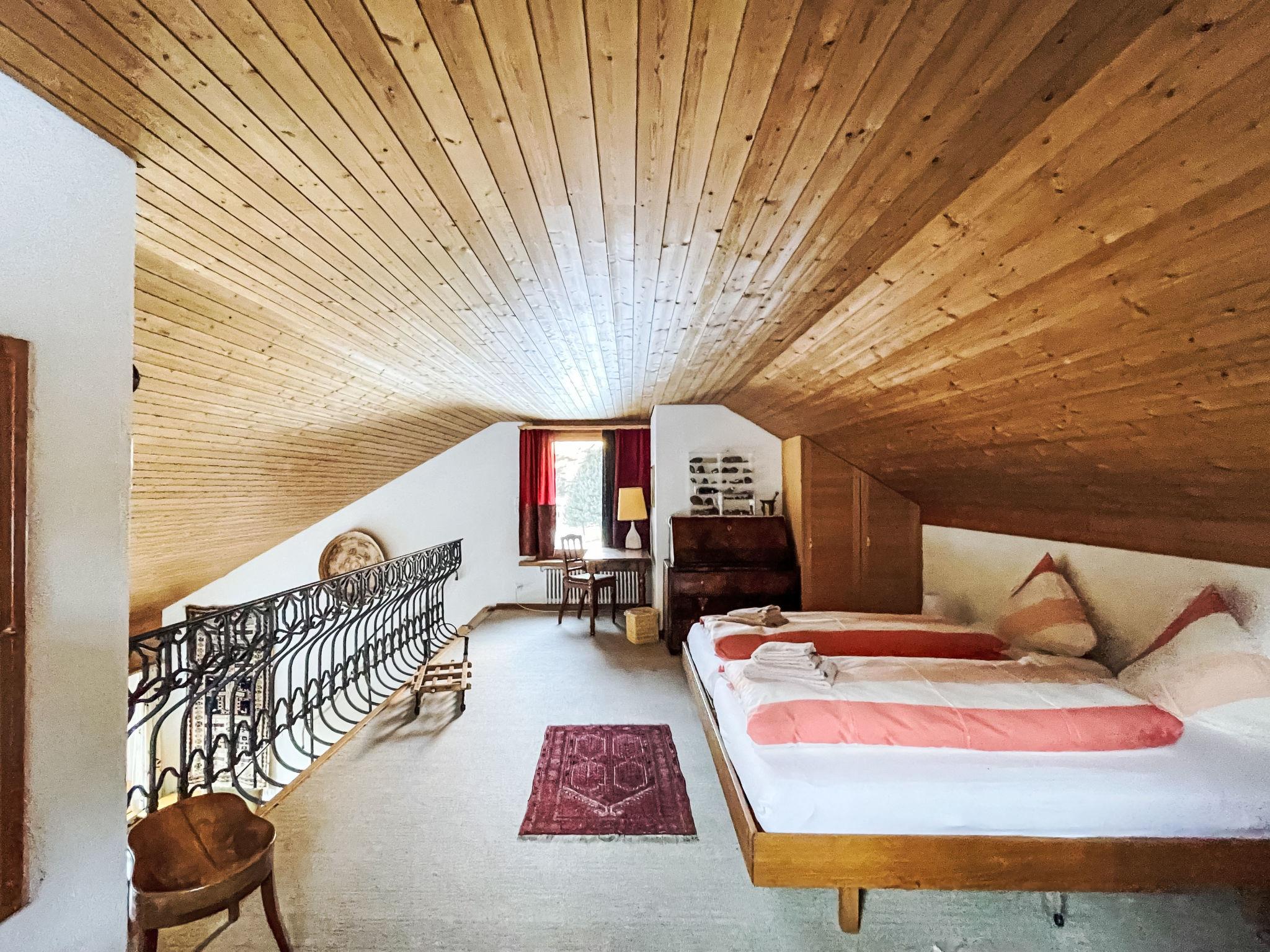 The 150 m2 apartment is located in the top of three terrace houses (access via stairs – without lift) and offers wonderful views: the view from the living area over the whole Julier chain is fantastic at any time of the day. From the dining area you can see into the forest – here the squirrels sometimes come to visit you for breakfast. The evening sun on the Segantini hut is also in view.