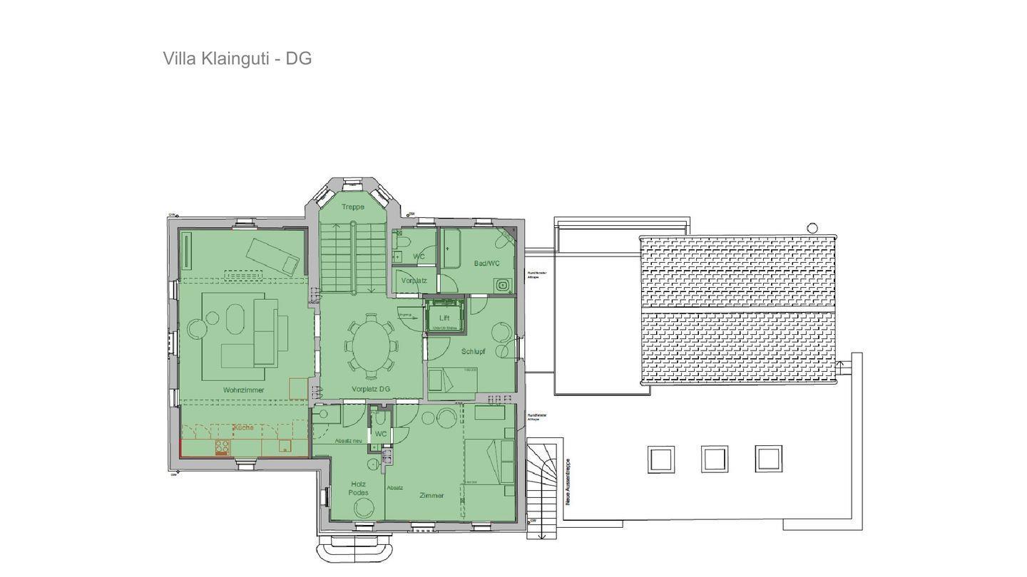 Erdgeschoss: Eingang mit einem grosszügigen Vorplatz. Zwei gemütliche Wohnzimmer wovon eines mit einem wunderschön verzierten Kachelofen. Gemütliches Esszimmer. Neben der Küche zur Eigennutzung verfügt die Villa Klainguti über eine zusätzliche, professionell ausgestattete Gastroküche für einen Privatkoch. Im Annex befindet sich eine moderne, gemütliche Kamin Lounge sowie ein Wintergarten mit Bar.