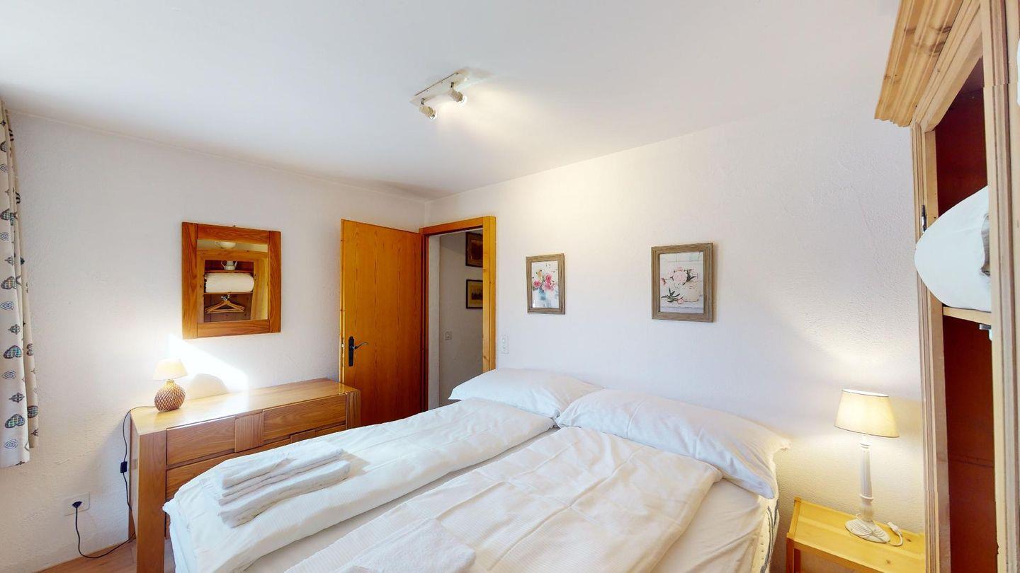 Im ersten Stock verfügt die Wohnung über ein Wohn- und Essbereich, welcher mit viel Holz ausgestattet ist und dadurch eine warme und einladende Atmosphäre verbreitet. Ebenfalls befinden sich auf der ersten Etage ein Schlafzimmer mit einem Doppelbett und ein Badezimmer mit Dusche. Im teilweise abgeschrägten Dachgeschoss befinden sich ein weiteres Badezimmer mit Badewanne und ein Schlafzimmer ebenfalls mit Doppelbett. Die Dachterrasse ist vom oberen Geschoss zugänglich und diese bietet eine atemberaubende Aussicht auf die umliegenden Berge. Im Dachgeschoss gibt es zusätzlich einen offenen Raum, der als Kinderspielzimmer geeignet ist.