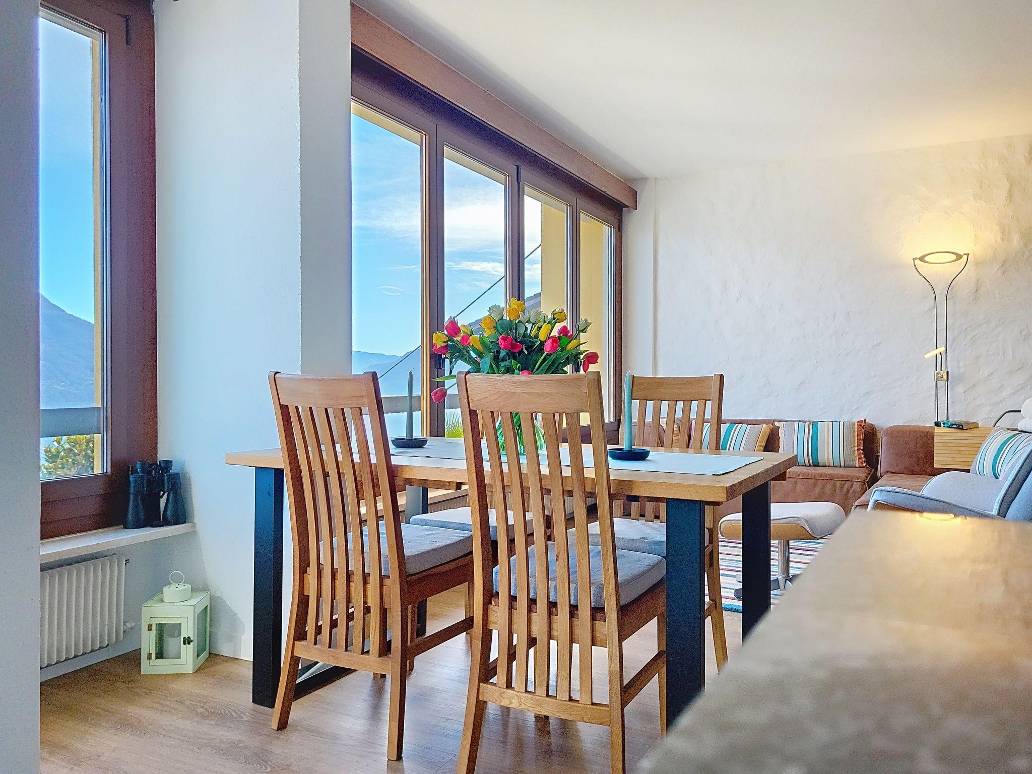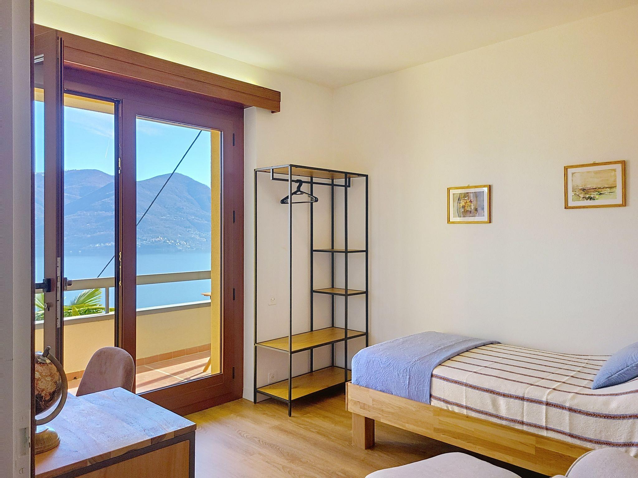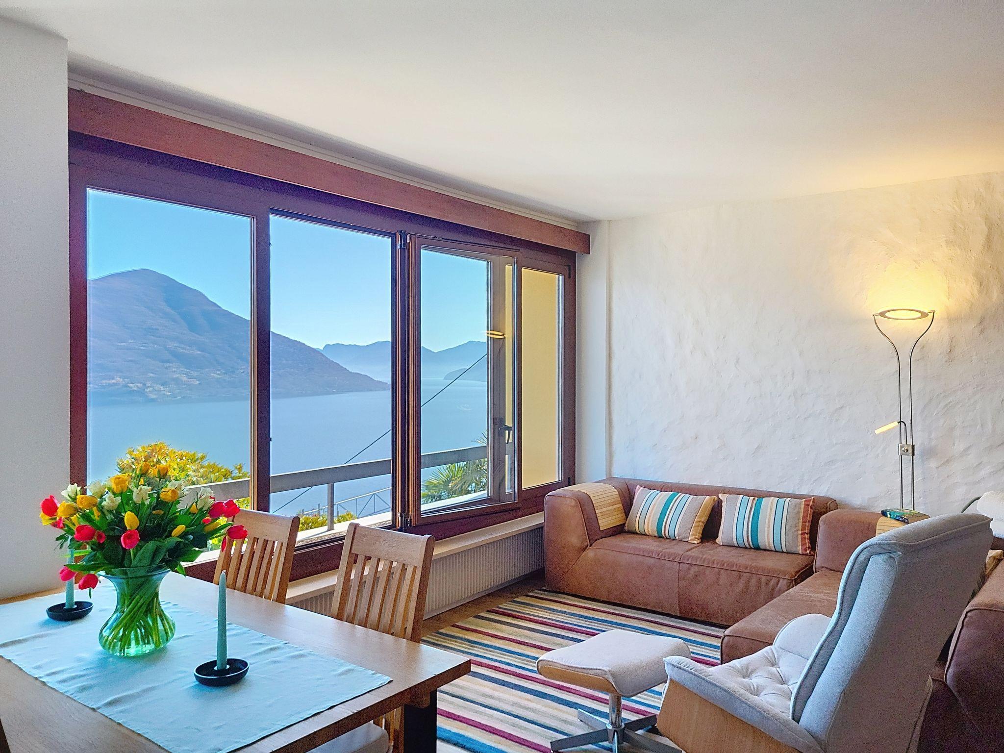 "Apt. Tana dei Leoni", 4-room apartment 85 m2 on 1st floor, south-east facing position. Renovated in 2025, modern and cosy furnishings: open living/dining room with panoramic window with open-hearth fireplace, dining table, international TV channels, flat screen and radio. Exit to the balcony. 1 double bedroom with 1 double bed (1 x 160 cm, length 200 cm). 1 room with 1 bed (90 cm, length 200 cm). 1 room with 1 bed (90 cm, length 200 cm). Open kitchen (dishwasher, 4 ceramic glass hob hotplates, toaster, kettle, microwave, electric coffee machine, Capsules for coffee machine (Nespresso) extra, fondue Set (cheese)). Sep. WC, bath/shower/WC, double hand-basin. Heating. Balcony, terrace roofed, south facing position and, east facing position. Terrace furniture, deck chairs (2). Marvellous panoramic view of the lake, the mountains and the countryside. Facilities: washing machine (extra). Dryer (extra), iron, children's high chair for up to 2 year olds (extra), hair dryer. Internet (WiFi). Parking space n 1 (roofed). Please note: non-smokers only. Maximum 1 pet/ dog allowed. NL-00013153