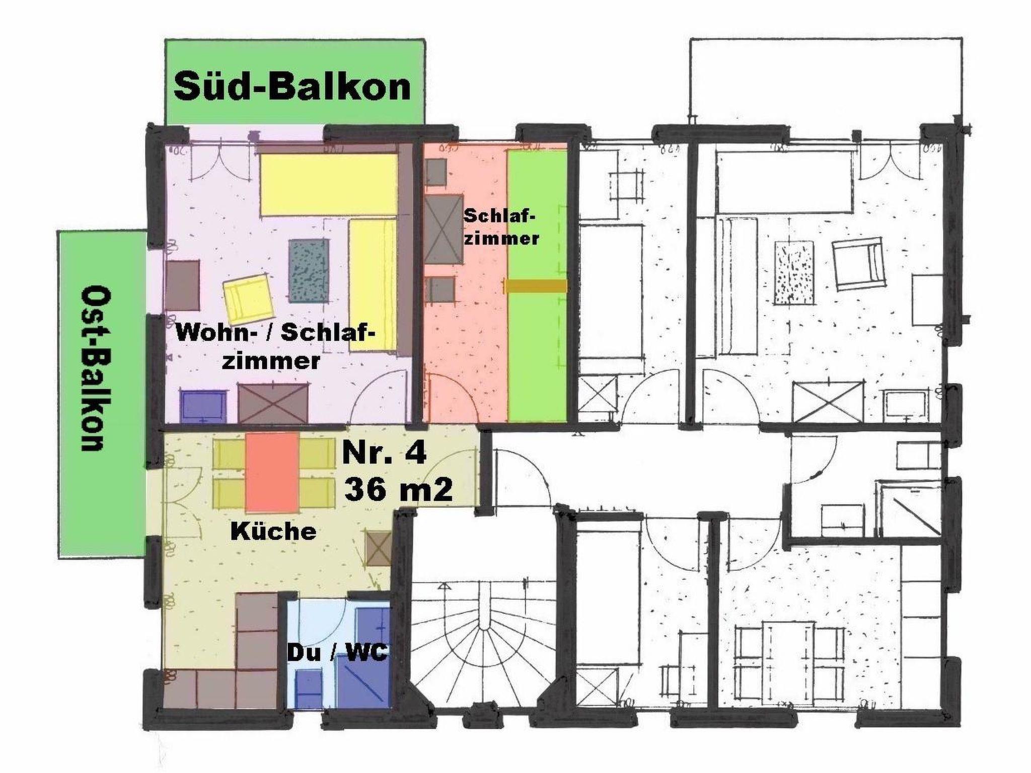 2 1/2-room apartment (4 beds, 36 m2), 2nd floor, 1 bedsitting room, 1 bedroom, dining-kitchen, shower/WC, flat screen TV, south-east balcony