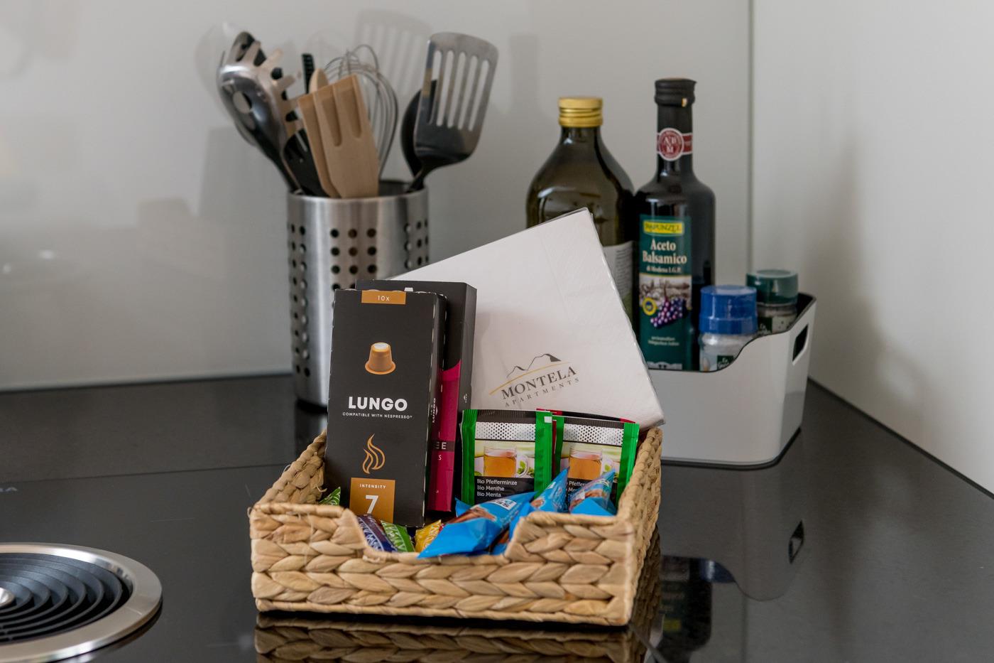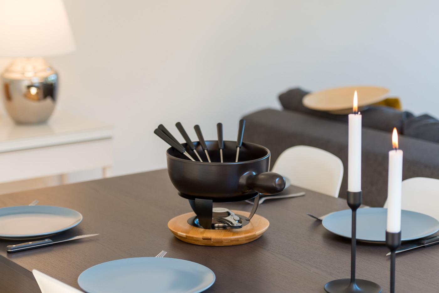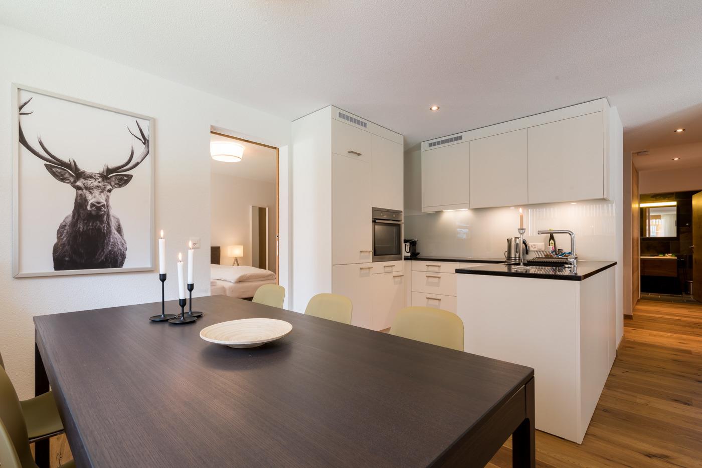 Die modernen Wohnungen sind geschmackvoll, gut und hell eingerichtet, sehr gute Ausstattung. Jeweils Kabel-Flat-TV (Apple-TV) und Radio. Die Küchen sind sehr gut und vollständig ausgestattet mit Einbauhherd (4 Ceranfelder), Backofen, Mikrowelle, Geschirrspüler, Kühl-/Gefrierkombination, Filter-Kaffeemaschine, Nespresso-Kapsel-Kaffeemaschine, Wasserkocher, Toaster, Fondue-Rechaud und Raclette-Gerät. Holzdielenböden im Wohnraum und Schlafzimmern mit Fußbodenheizung. Jedes Bad mit Haartrockner.