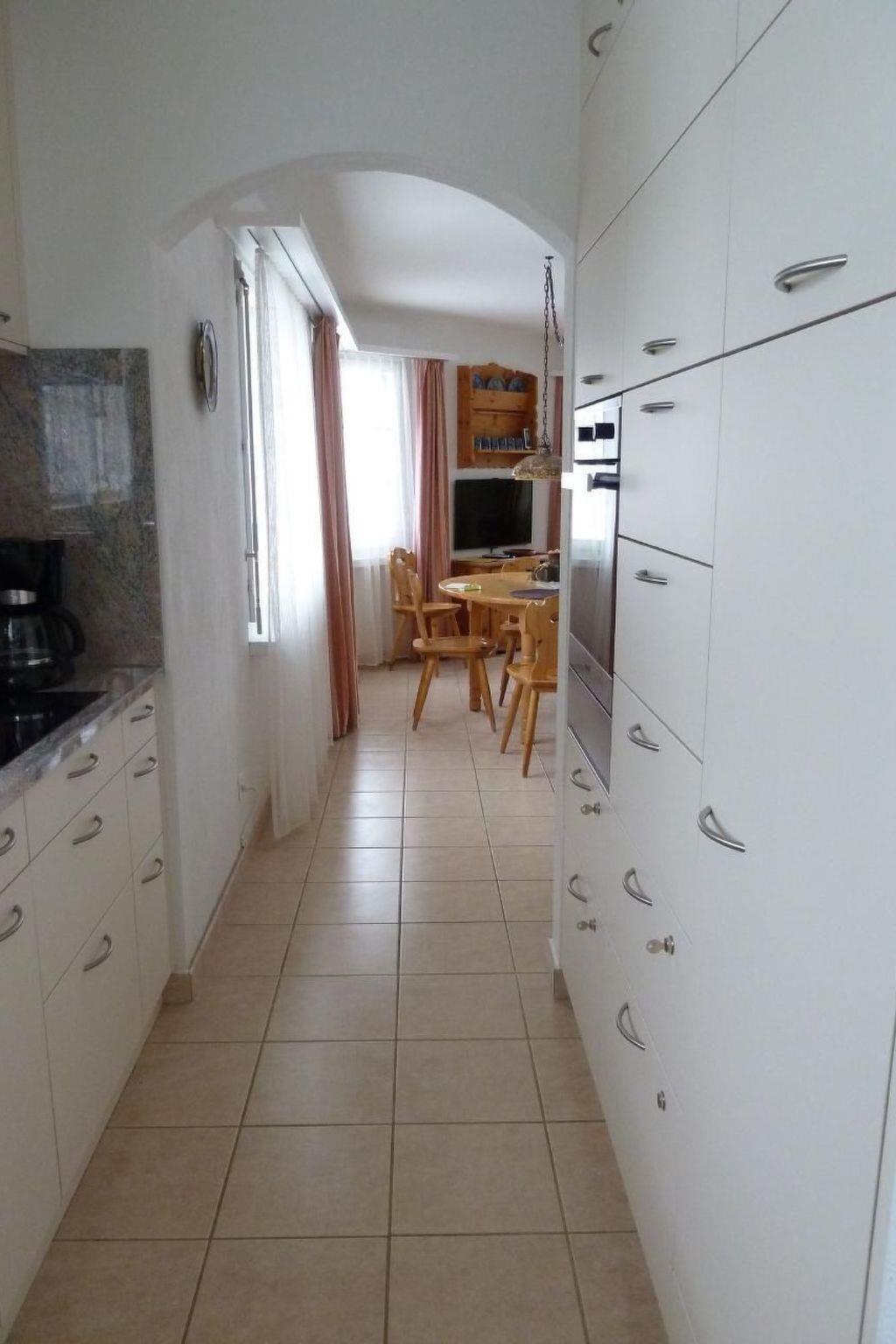 Inside, a comfortably furnished flat awaits you. The living room has a cosy sofa set, a dining area with table and 6 chairs, TV, radio with CD player and telephone for your comfort. A bedroom with a double bed, including a built-in wardrobe and chest of drawers, and a children's room with a bunk bed and a single bed are ideal for a good night's sleep. The kitchen is fully equipped with modern appliances such as a fridge, freezer, oven with warming drawer, ceramic hob and a Nespresso machine. There is also a bathroom with bath and shower, WC and a separate WC.