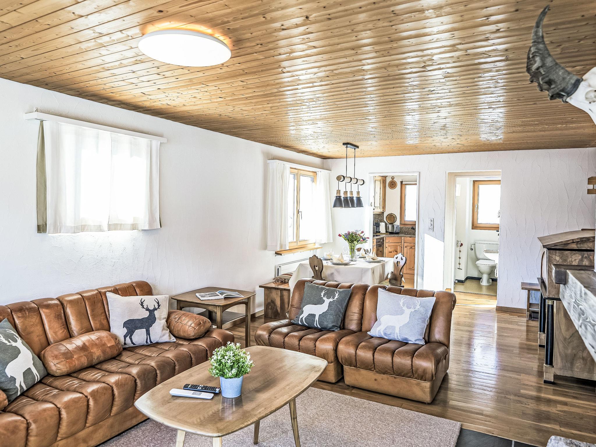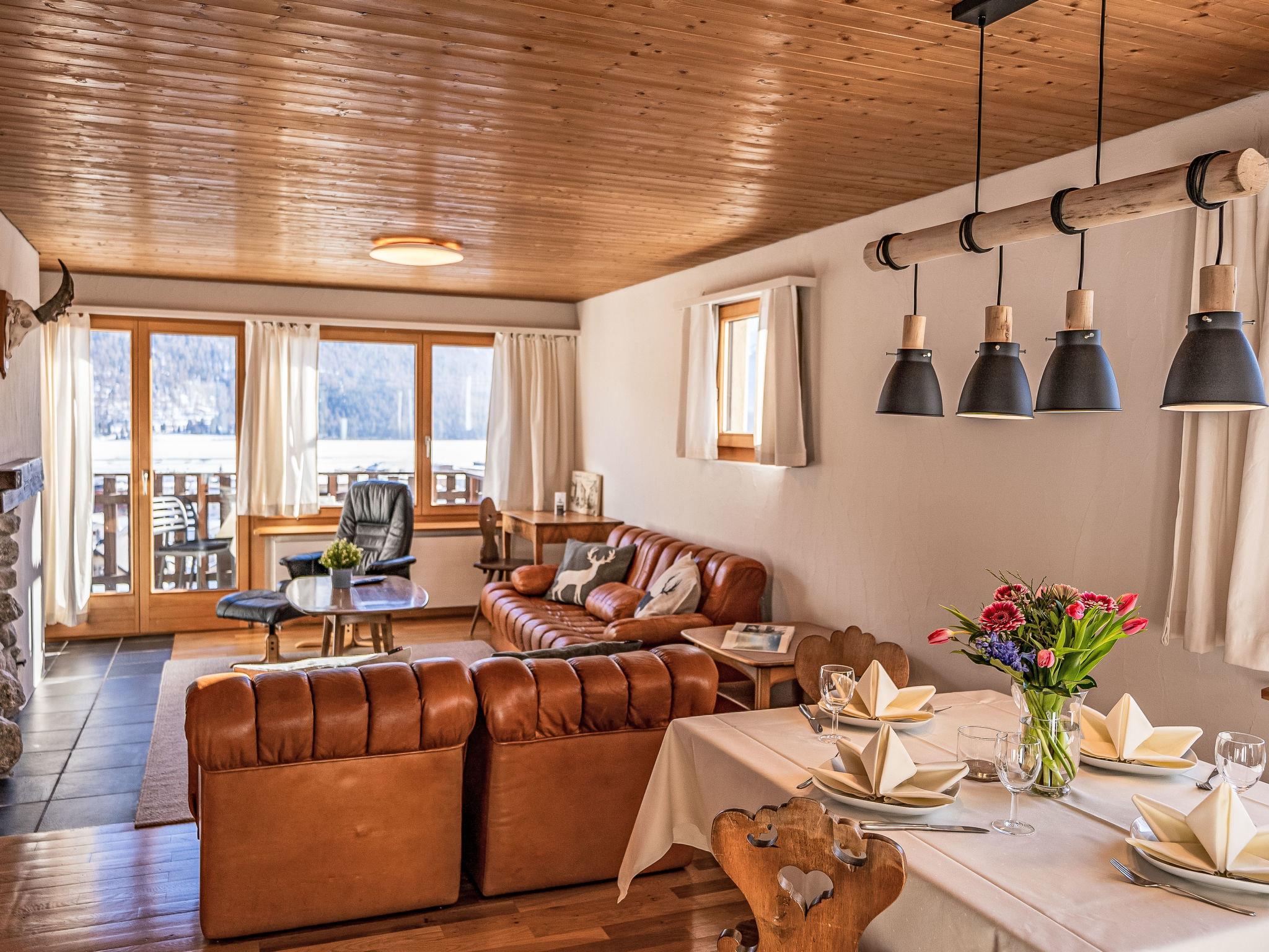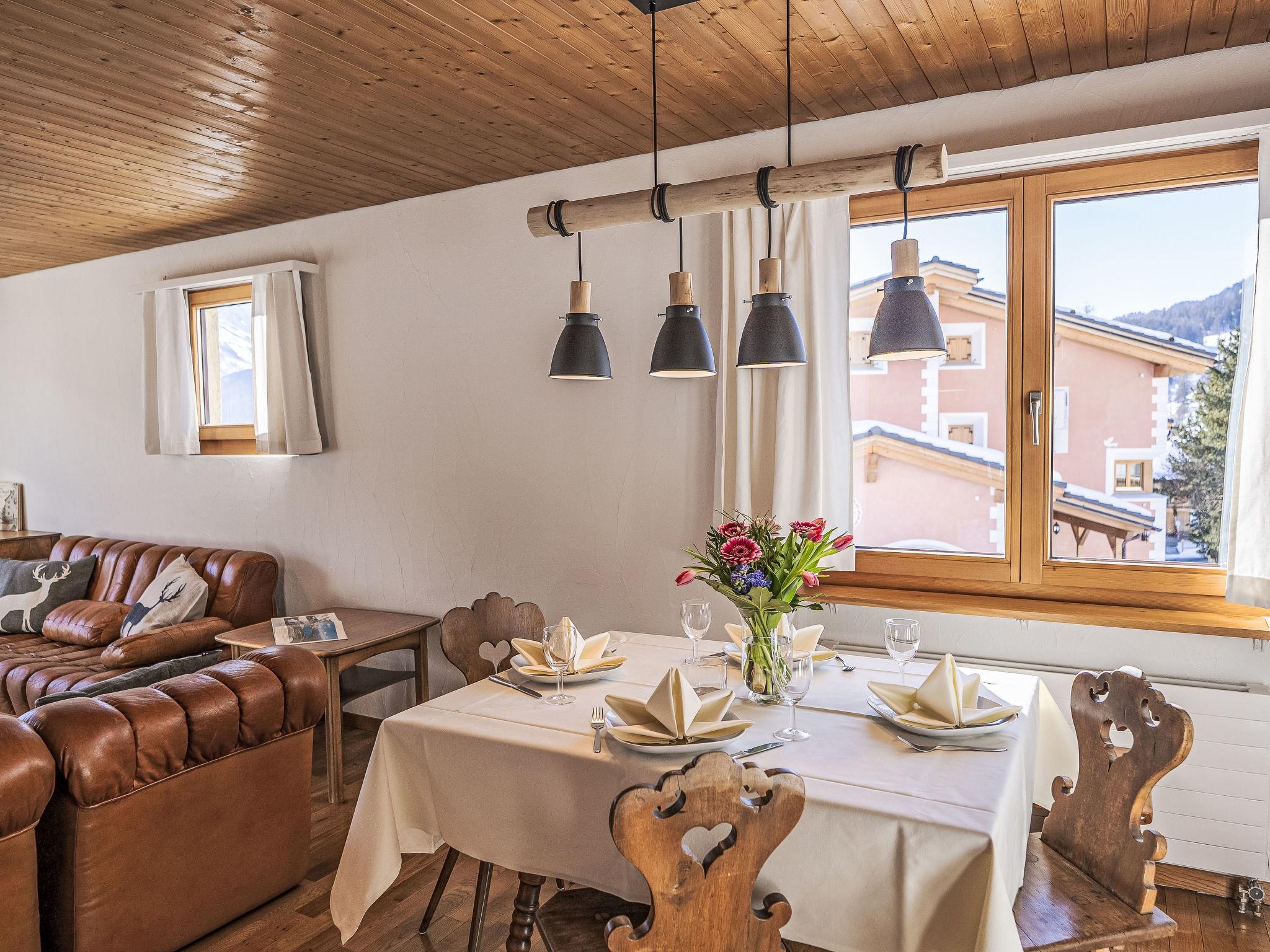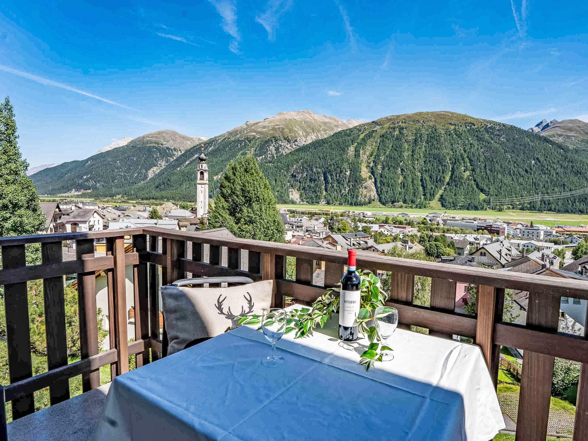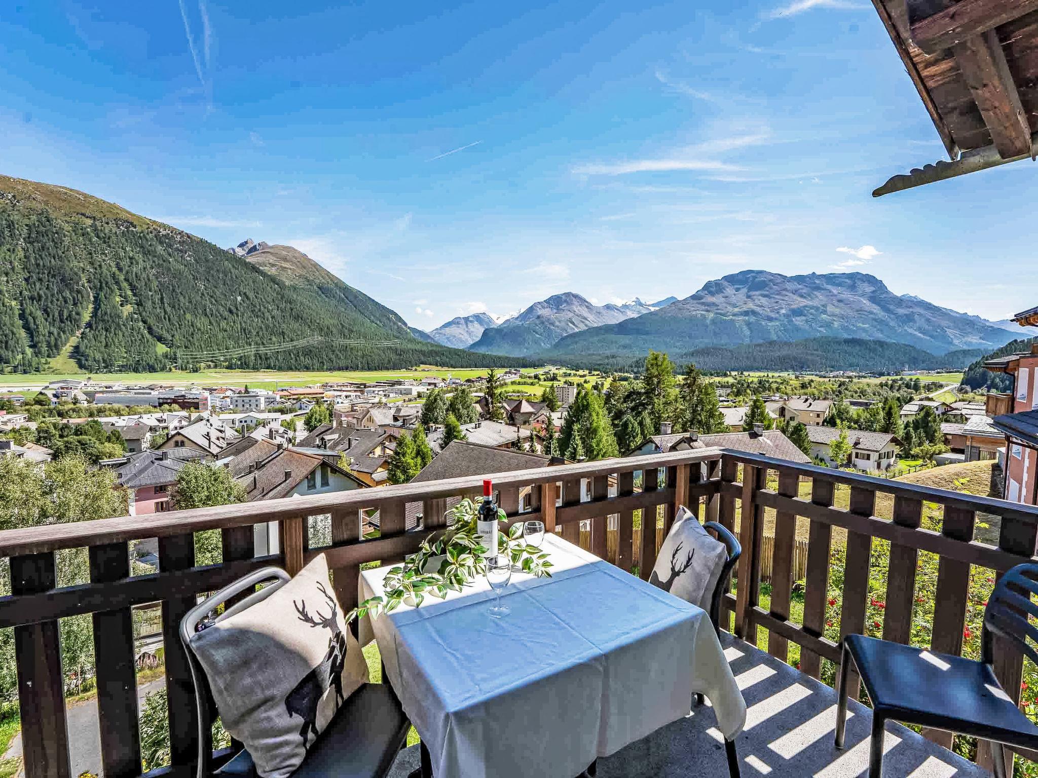 "Chesa Primula", 3-room apartment 70 m2 on 2nd floor. Simple and cosy furnishings: open living/dining room with open-hearth fireplace (only for decoration), flat screen. Exit to the balcony. 1 room with 2 beds (90 cm, length 190 cm). 1 double bedroom with 2 beds (100 cm, length 190 cm). Small kitchen (oven, 4 ceramic glass hob hotplates, toaster, kettle, electric coffee machine, Capsules for coffee machine (Nespresso) extra, fondue Set (cheese)). Bath/WC, sep. WC. Heating. Parquet floors, carpet. Balcony 8 m2. Balcony furniture. Beautiful panoramic view of the mountains, the countryside and the resort. Facilities: iron, hair dryer. Internet (WiFi, free). Garage space n 1 on the property (1 car), height 190 cm, width 230 cm. Please note: non-smokers only, non-smoking house. No lift.