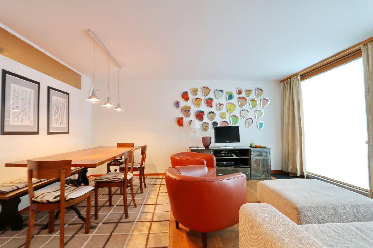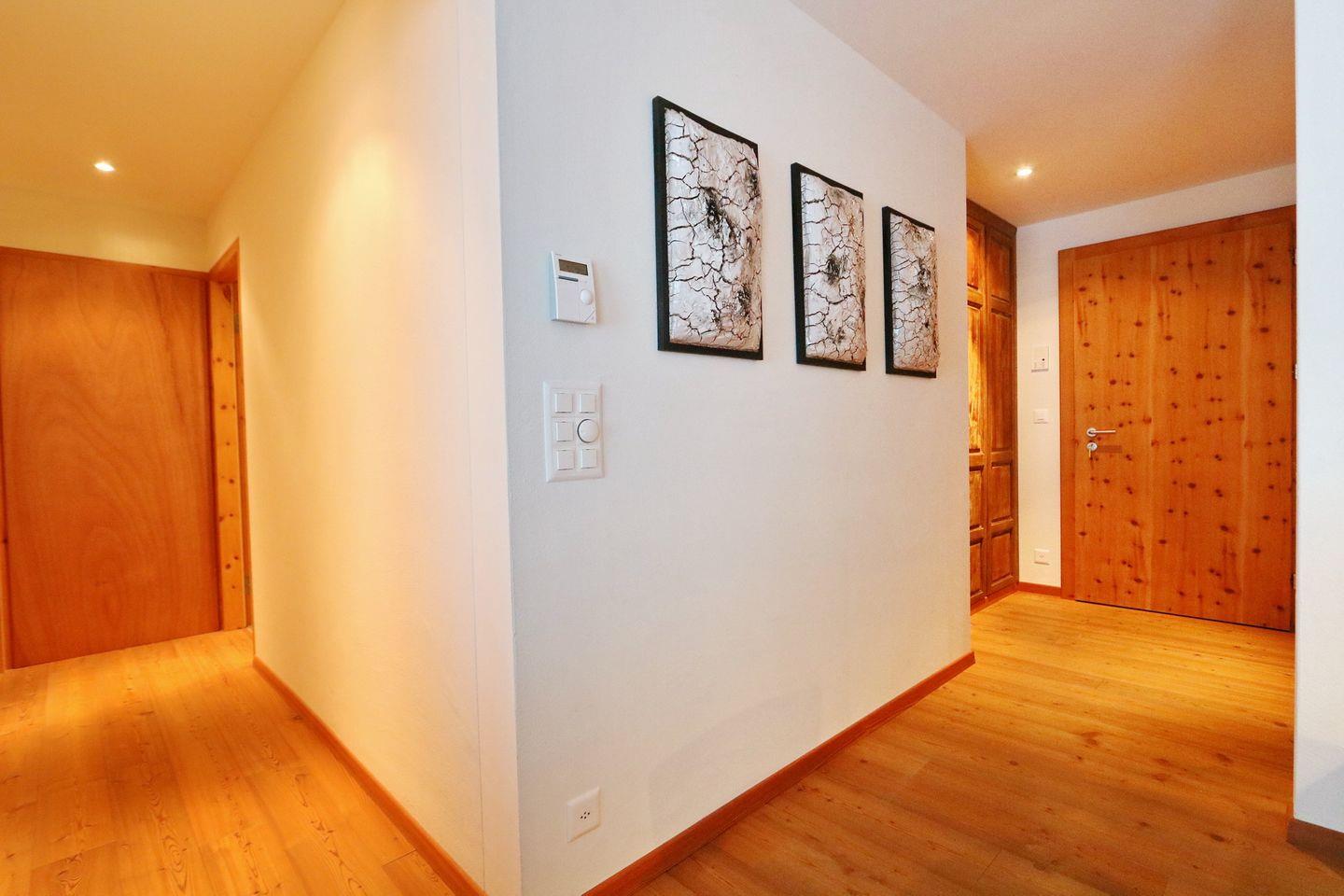 Die Wohnung verfügt über einen Eingangsbereich welcher in das gemütliche Wohnzimmer mit Sofa, Sesseln, Fernseher und grossem Esstisch führt. Vom Wohnzimmer gelangt man auf den Gartensitzplatz. Die geschlossene Küche ist mit den modernsten Küchengeräten ausgestattet und komplett eingerichtet. Ein Gang führt zu dem Schlafbereich mit einem Schlafzimmer mit Doppelbett und einem Badezimmer mit Badewanne. Ein Garagenparkplatz gehört zu dieser Wohnung. Eine Waschküche sowie ein Skiraum zur gemeinschaftlichen Nutzung steht ebenfalls zur Verfügung.