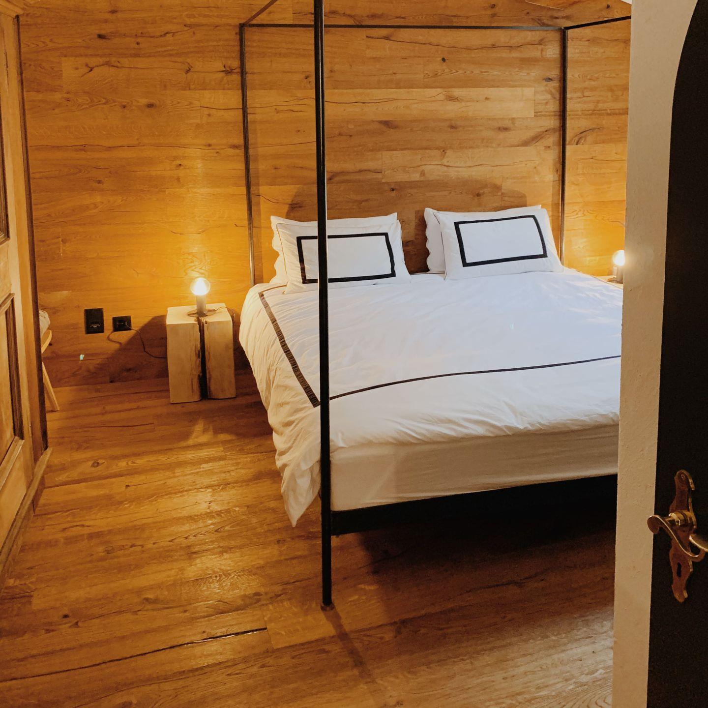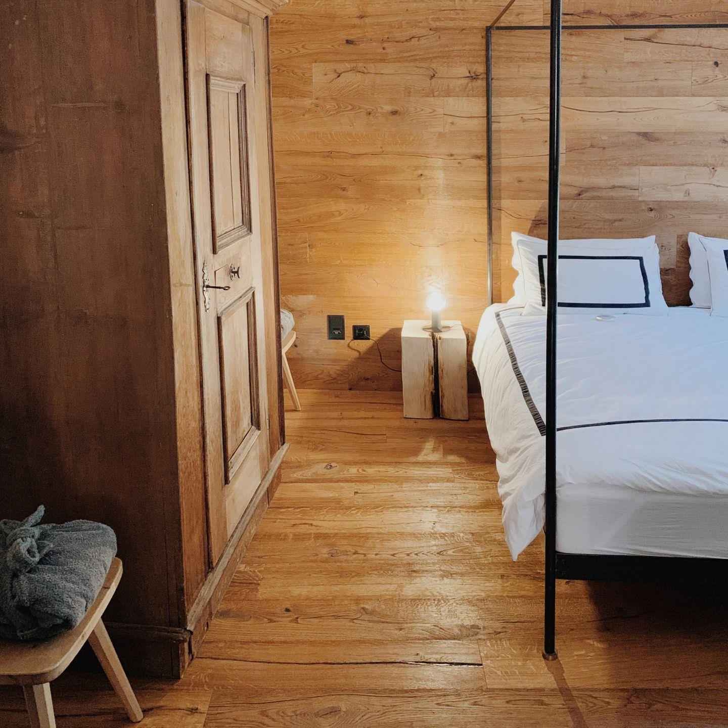 Das grosszügige Schlafzimmer sorgt mit einer modernen Holzvertäfelung für Gemütlichkeit. Es verfügt über ein grosses Doppelbett (180 x 200 cm) und bietet in einem alten Engadiner Schrank ausreichend Stauraum für Ihre persönlichen Dinge. Vom Schlafzimmer gelangen Sie direkt ins Bad mit Dusche, welches in elegantem Design strahlt.