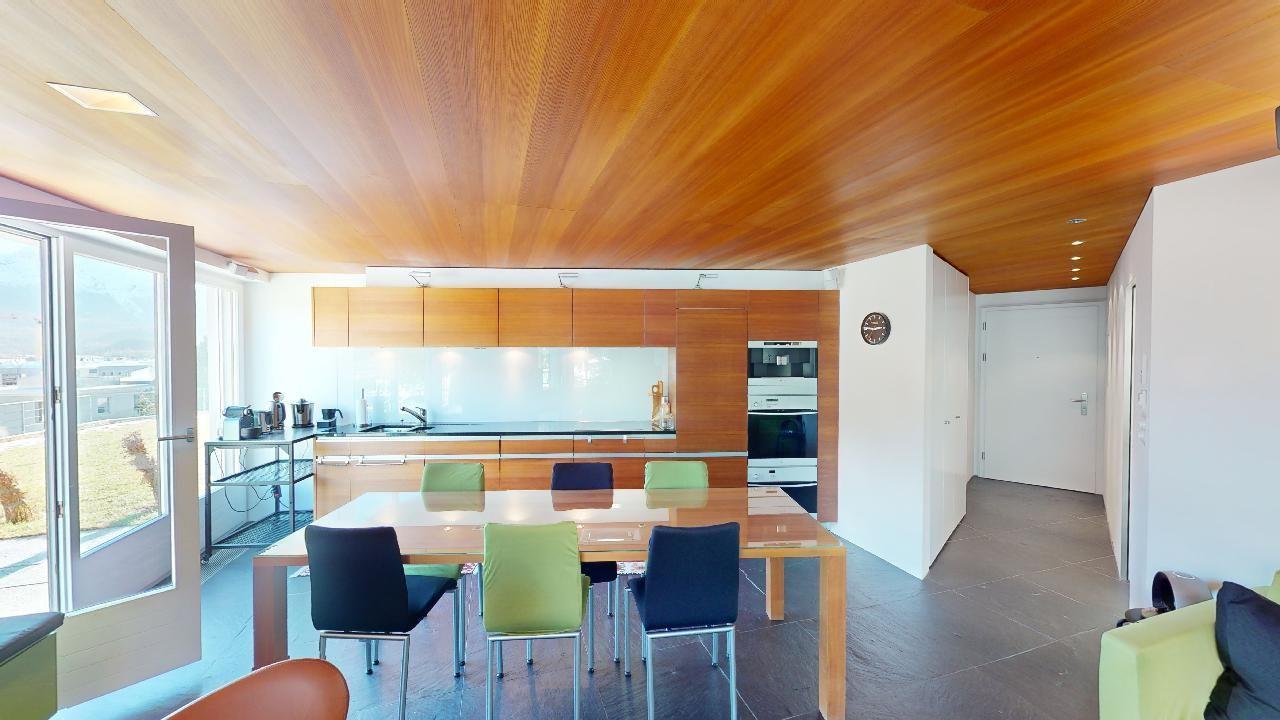 Die Wohnung besticht durch ein äusserst geräumiges Wohnzimmer, welches für eine tolle Atmosphäre sorgt und einen atemberaubenden Ausblick auf die umliegende Berglandschaft gewährt. Die offene Küche in edlem Massivholzdesign ist komplett ausgestattet und eingerichtet.