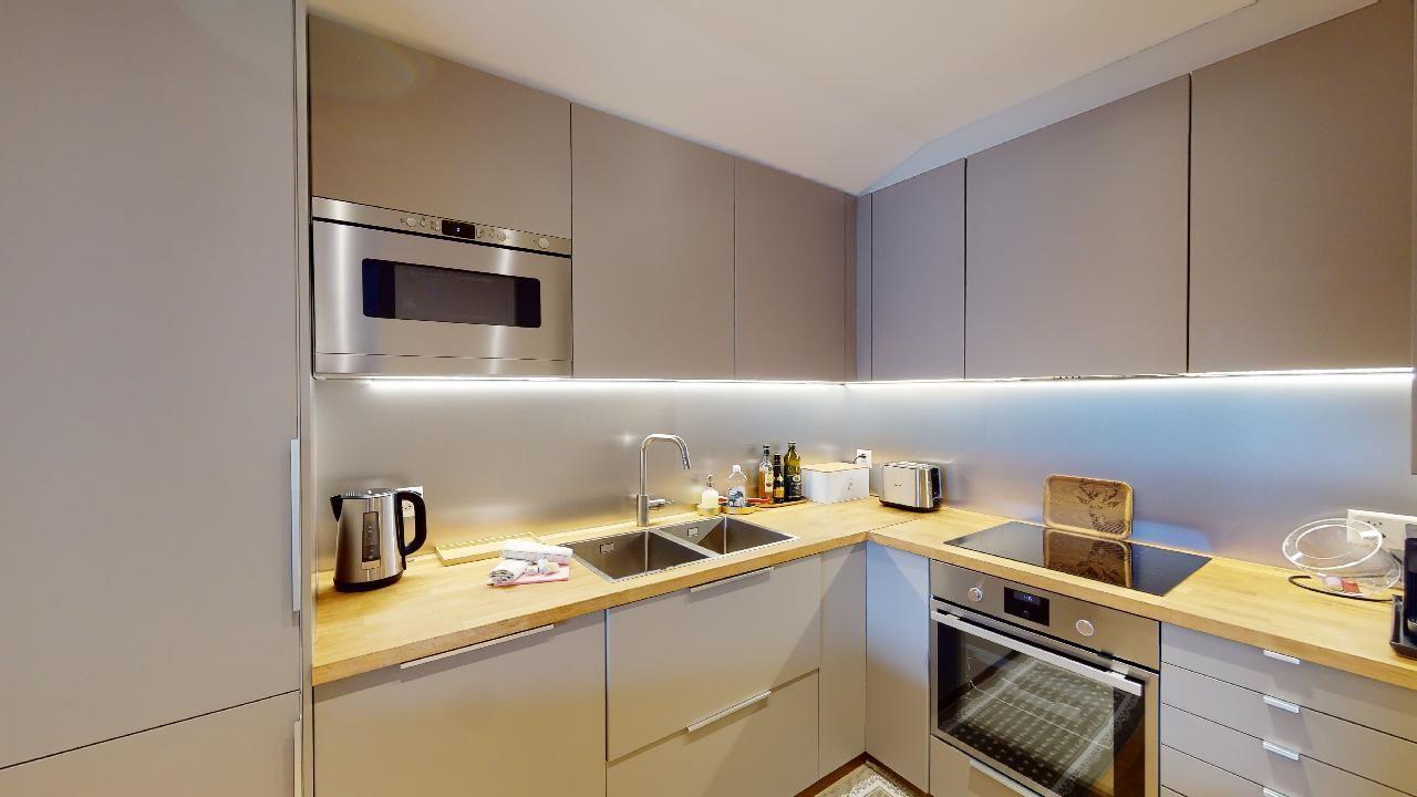 Diese grosszügige Wohnung bietet Schlafmöglichkeiten und genügend Platz für bis zu 6 Personen. Im Wohnzimmer befinden sich ein bequemes Sofa, TV sowie ein Esstisch. Vom Wohnzimmer gelangt man auf den nach Westen gericheteten Balkon, dieser Balkon ist mit einem Gasgrill ausgestattet. Die komlett eingerichete Küche bietet ebenfalls ausreichend Platz. Die Wohnung hat insgesamt drei Schlafzimmer, die beiden Masterschlafzimmer sind jeweils mit einem Doppelbett und einem En Suite Badezimmer mit Dusche ausgestattet. Der Zugang zum dritten Schlafzimmer mit den zwei Einzelbetten und TV gewährt eins der beiden Masterschlafzimmer. Zusätzlich haben beide Schlafzimmer Zugang zum nach Osten gerichteten Balkon. Es steht ein weiteres Gäste-WC zur Verfügung. Das Cheminee darf aus sicherheitsgründen nicht genutzt werden.