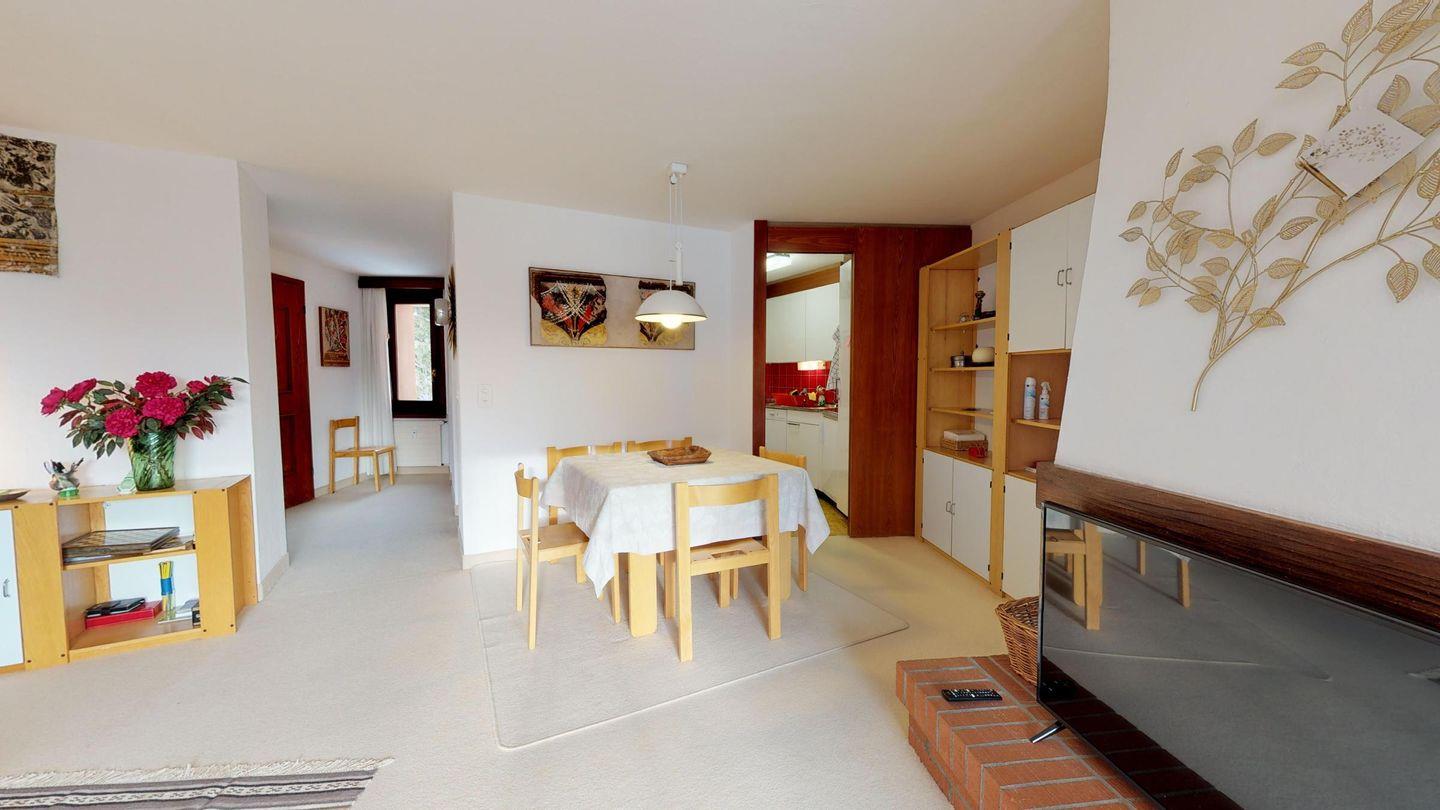 2 ½ Zimmerwohnung mit ca. 60 m2 im 2. Stock mit Aufzug. Eingang mit Garderobe, Wohn- / Essbereich, Bettsofa, Ausgang zu einem kleinen Balkon mit Blick auf die Berge. Fernsehen und Internet. Kleine separate Küche mit Backofen, Kühlschrank, Kaffeemaschine und Geschirrspüler. Schlafzimmer mit Doppelbett. Badezimmer mit Badewanne, Waschbecken und Bidet. Ein Aussenparkplatz. Waschküche und Skiraum. Haustiere nicht erlaubt.