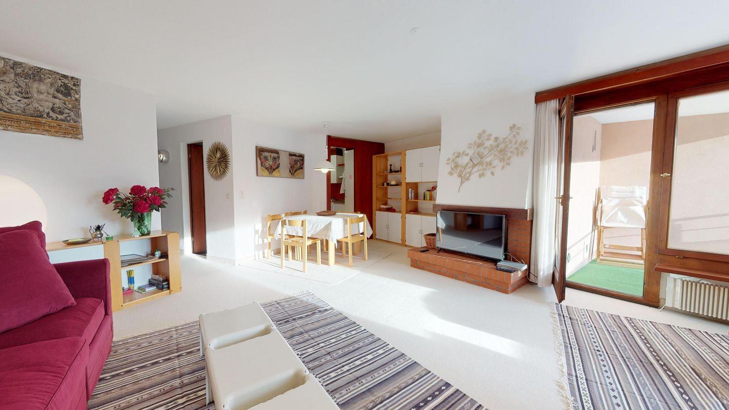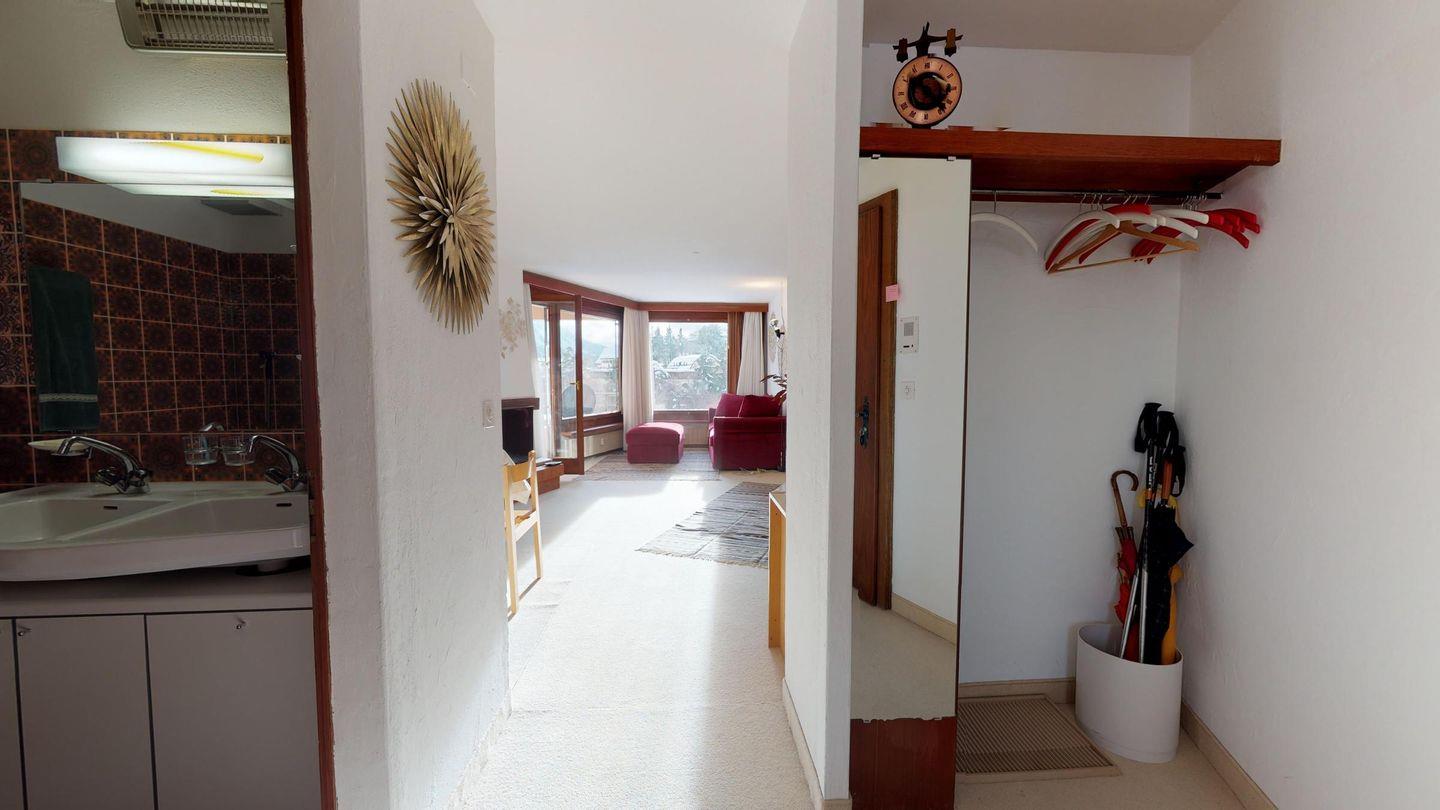 2 ½ Zimmerwohnung mit ca. 60 m2 im 2. Stock mit Aufzug. Eingang mit Garderobe, Wohn- / Essbereich, Bettsofa, Ausgang zu einem kleinen Balkon mit Blick auf die Berge. Fernsehen und Internet. Kleine separate Küche mit Backofen, Kühlschrank, Kaffeemaschine und Geschirrspüler. Schlafzimmer mit Doppelbett Badezimmer mit Badewanne, Waschbecken und Bidet. Ein Aussenparkplatz. Waschküche und Skiraum. Haustiere nicht erlaubt.