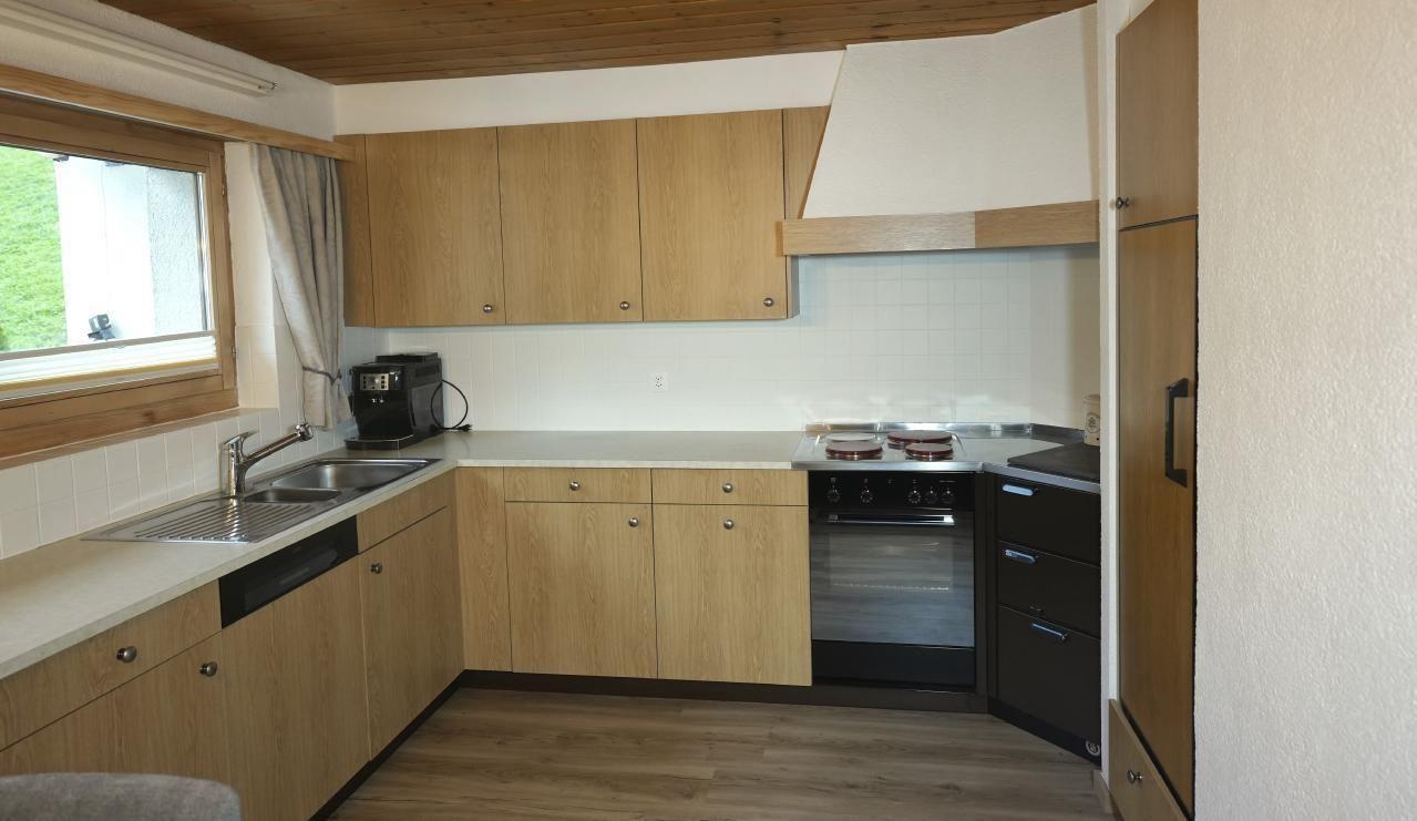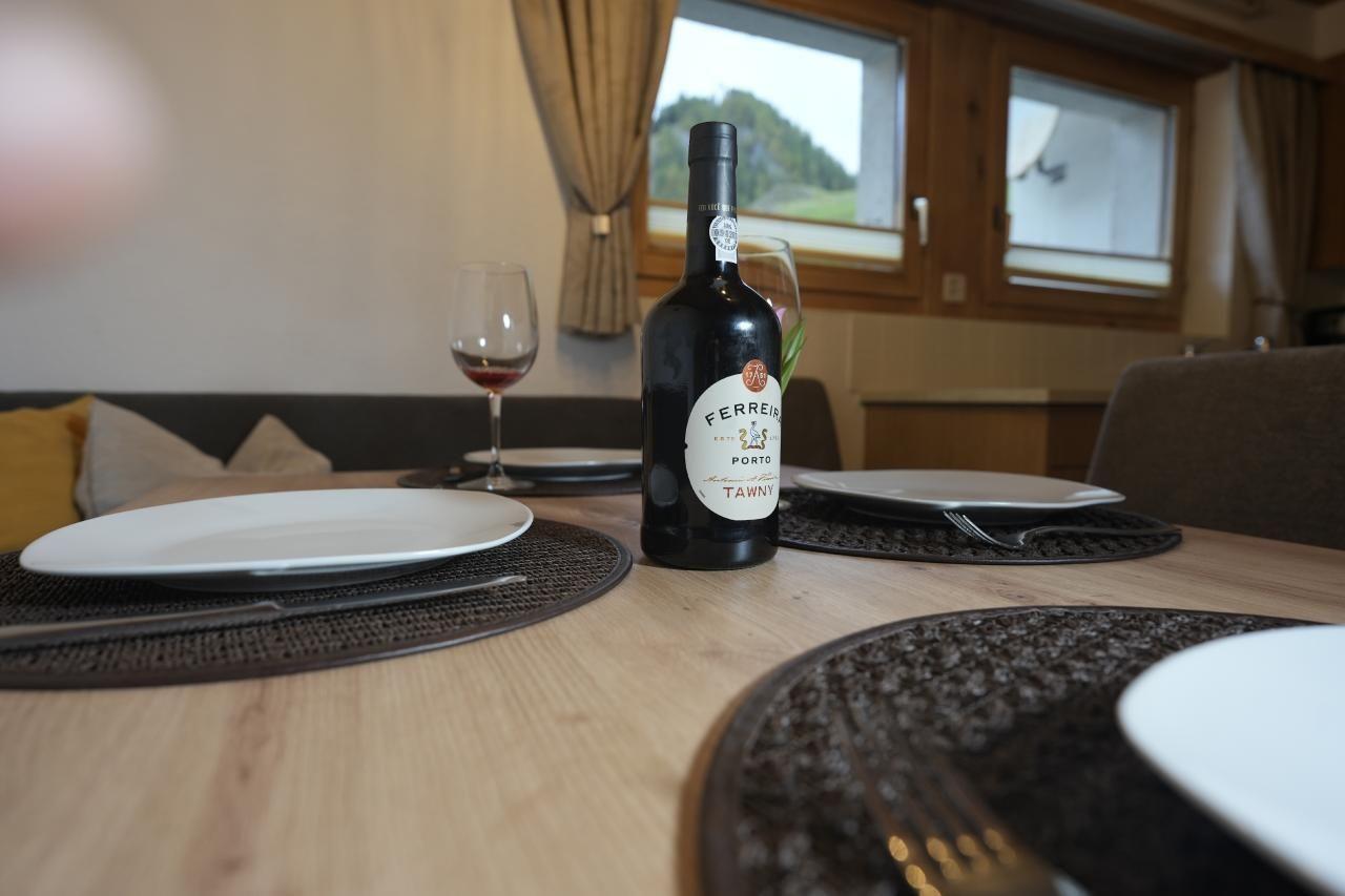 Our cosy flat, furnished with attention to detail, awaits you on the second floor of our apartment building. It offers a comfortable two-and-a-half room flat with balcony, ideal for couples or families. Relax in the living room with a pull-out sofa bed, which offers space for an additional person or two children. A wood-burning stove, complemented by a typical Samnaun stove couch, provides warmth and a cosy atmosphere. A fully equipped kitchen with dining area, a double bedroom and a bathroom/WC round off the living area. Free WLAN is also available, and we offer a bread roll service for a perfect start to the day.