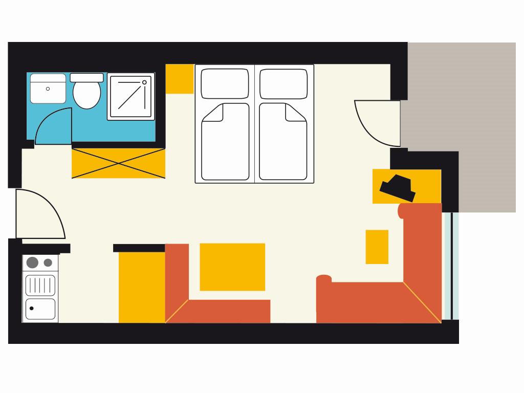 28 m2, living-/bedroom with foldaway beds, sofa with little table, bench seat with dining table, kitchenette with 2 plate stove, fridge etc. bathroom, satellite TV/radio, telephone, internet.