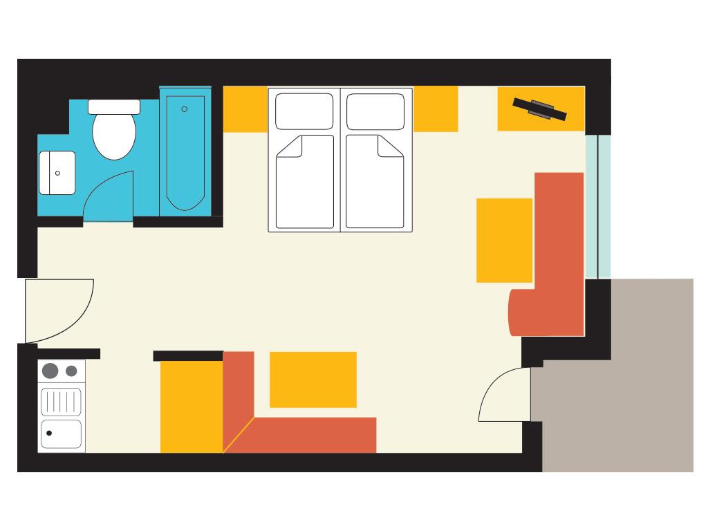 31 m2 , living-/bed room with double bed, sofa with little table, bench seat with dining table , kitchenette with 2 plate stove, fridge etc. bathroom, satellite TV/radio, telephone, internet.