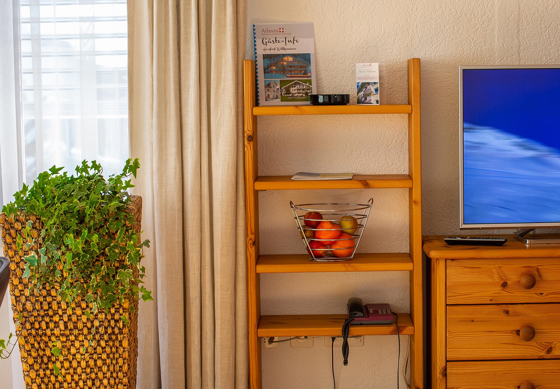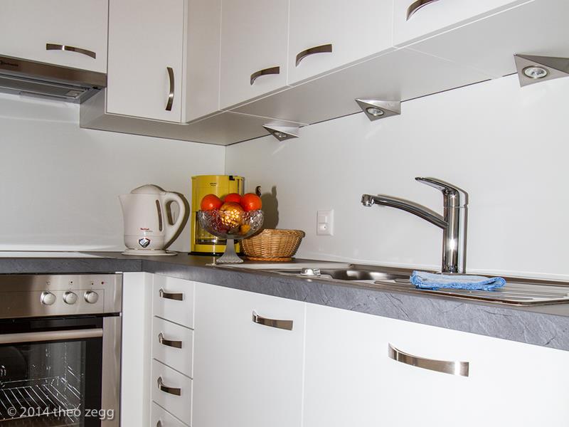 70m2, living room with sofa and little table, bench seat with dining table, two separate double bedroom, kitchen with 3 plate stove, oven, fridge etc. bathroom plus bath with separate toilete, satellite TV/radio, telephone, internet, south- and west facing balcony.