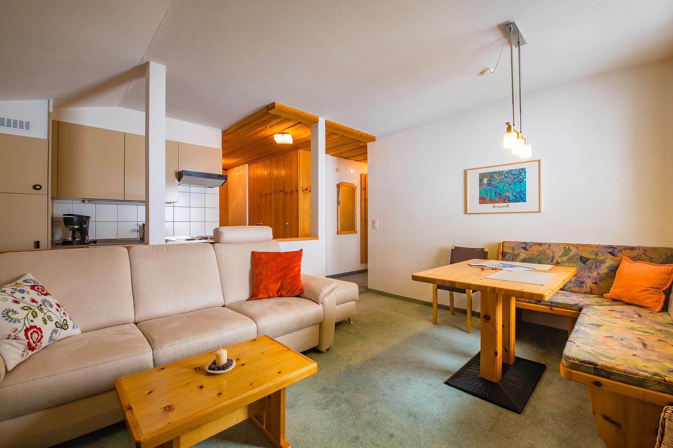 44 m2, living room with sofa and little table, bench seat with dining table, separate double bedroom, kitchen with 3 plate stove, oven, fridge, etc. bathroom, satellite TV/radio, telephone, internet.