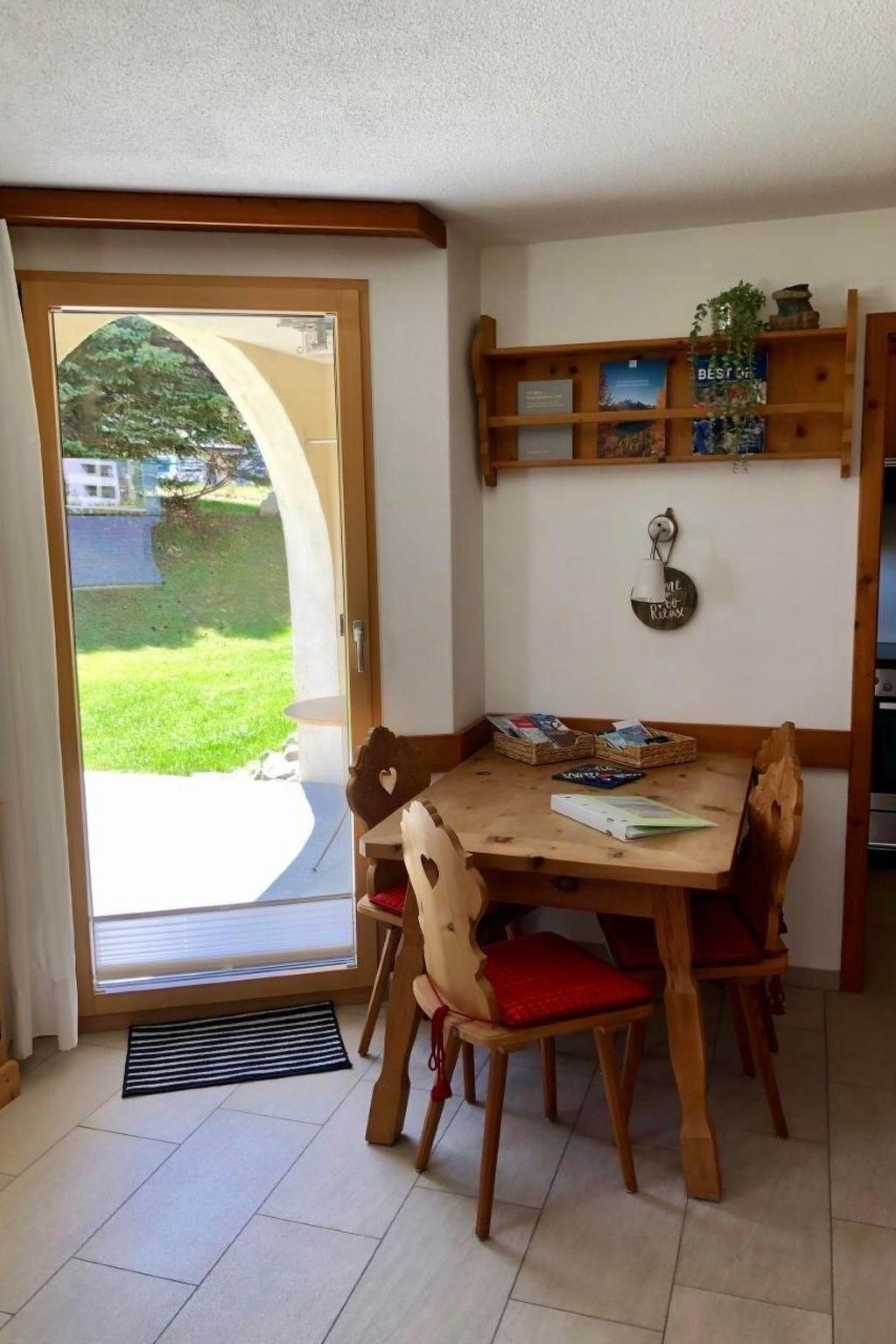 The dining area is furnished with typical Engadine Swiss stone pine furniture.