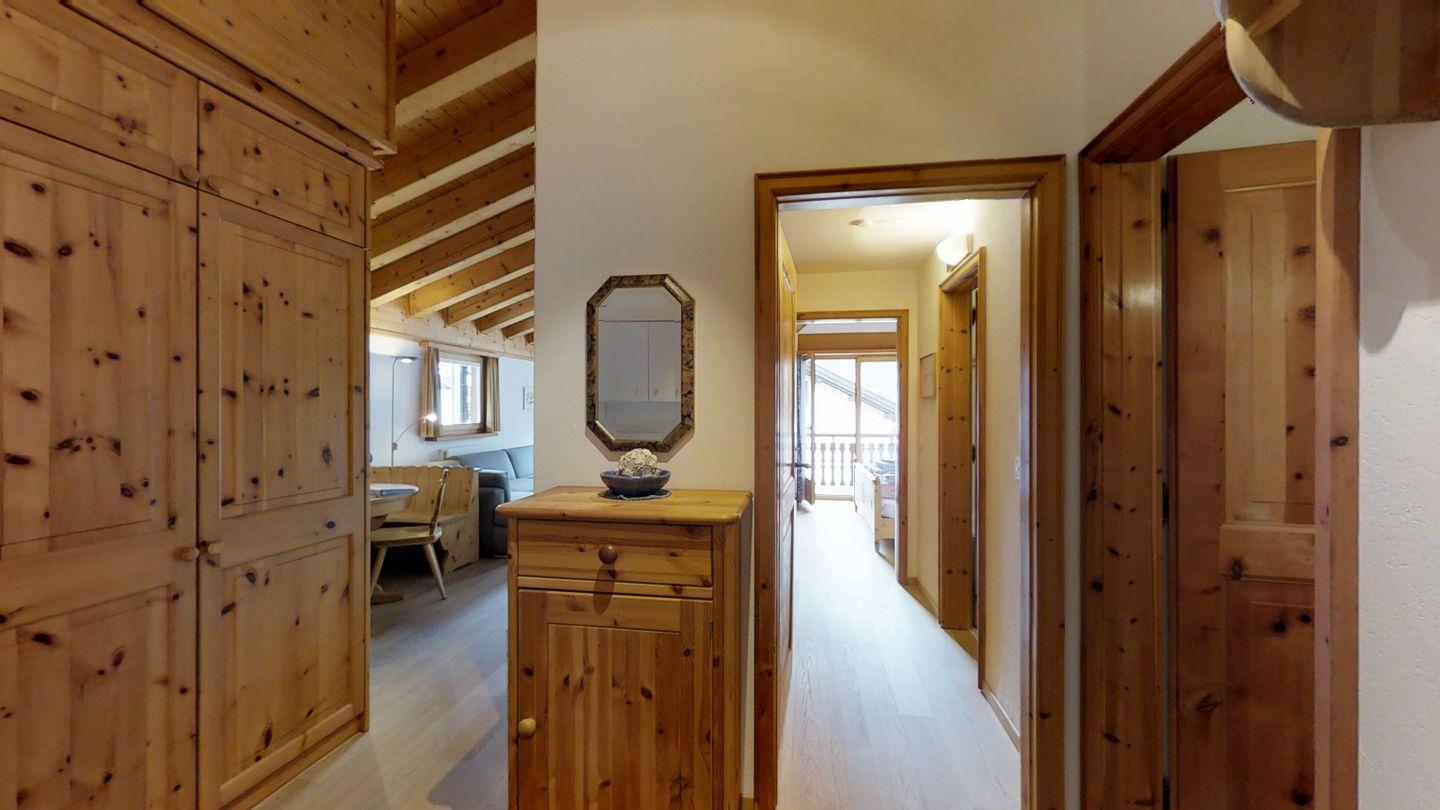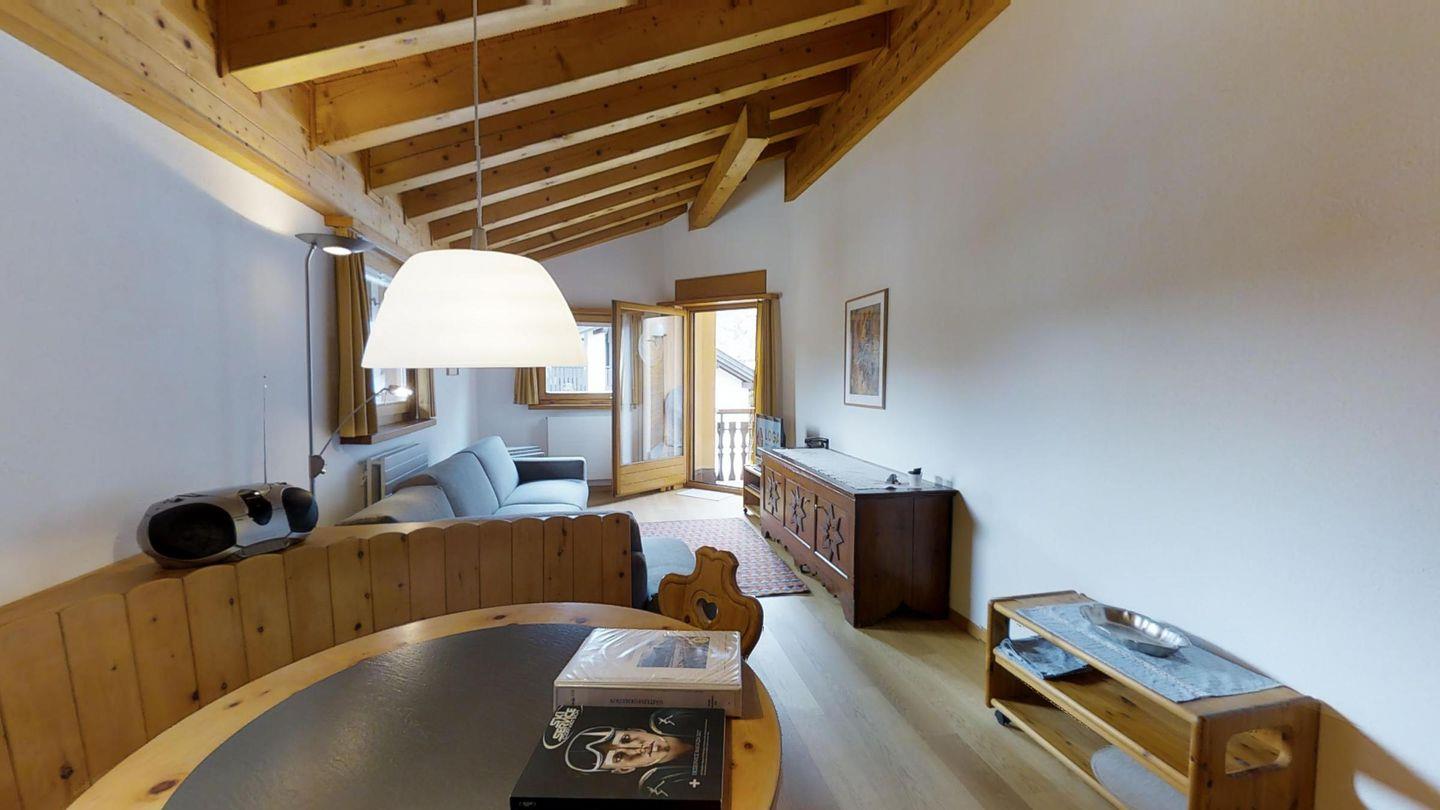 Hübsche 2-Zimmerwohnungen mit Galerie, an ruhiger Süd-West Lage, ca. 72 m. Wohn-/ Esszimmer mit Sofa, Balkon, TV und Radio. Holzküche, durch Schiebetüre abgetrennt, mit Backofen, Fondue-Geschirr, Mikrowelle und Geschirrspüler. Amici-Espressomaschine. 1 Zimmer mit Doppelbett (2x95x190) und einer Galerie. Bad/Dusche/WC/Lavabo. Separates WC. Garagenplatz. Sehr komfortable, rustikale Einrichtung. Haustiere sind nicht erlaubt. Nichtraucherwohnung.
