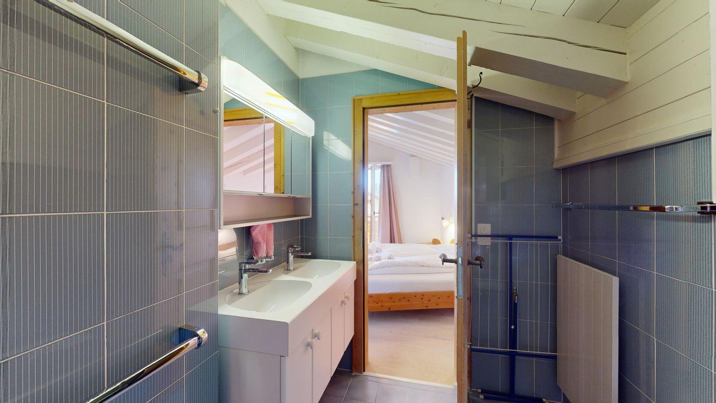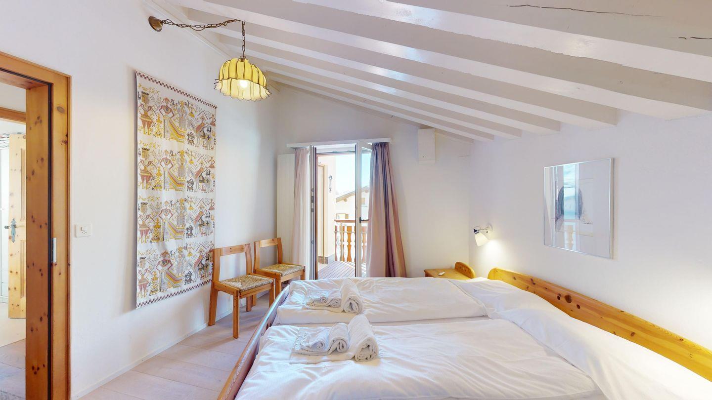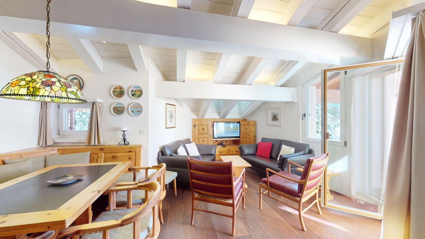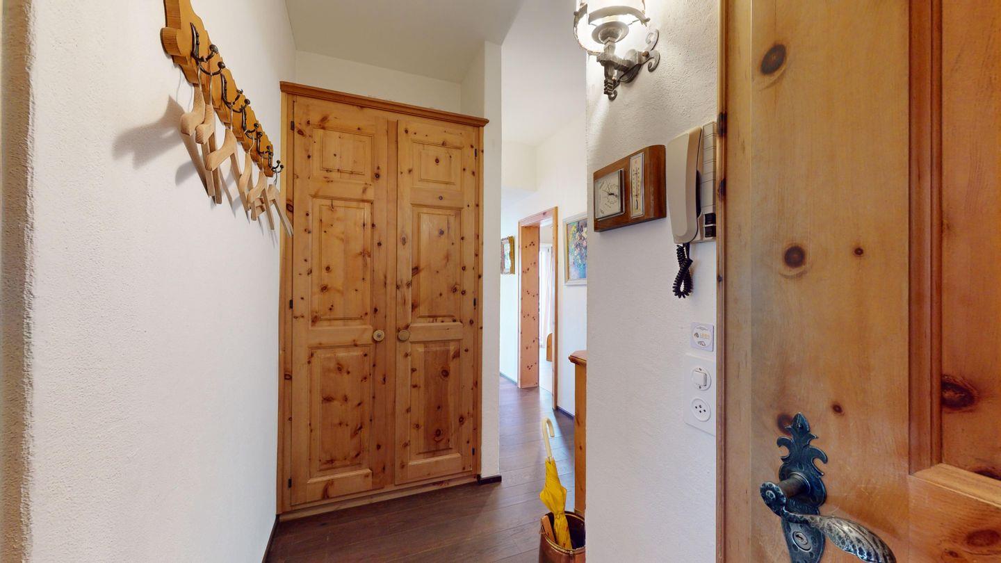Schöne und charmante 4-Zimmerwohnung im Dachgeschoss. Sehr ruhige Lage. Eingang mit Garderobe. Wohn-/Esszimmer mit Balkon (südwest) und Kaminofen. Radio/CD und TV/Sat. Abgeschlossene Küche mit Fenster und Backofen sowie Geschirrspüler. CHICCO D'ORO Kaffeemaschine. Dusche/WC/Lavabo. 1 Doppelzimmer mit Balkon, Bad/WC/Lavabo. 1 Zimmer mit Etagenbett (2 Schlafmöglichkeiten), Ausgang zum Balkon. 1 Zimmer mit einem Einzelbett. Parkettboden in der ganzen Wohnung. 1 Garagenplatz. Haustiere sind nicht erlaubt.