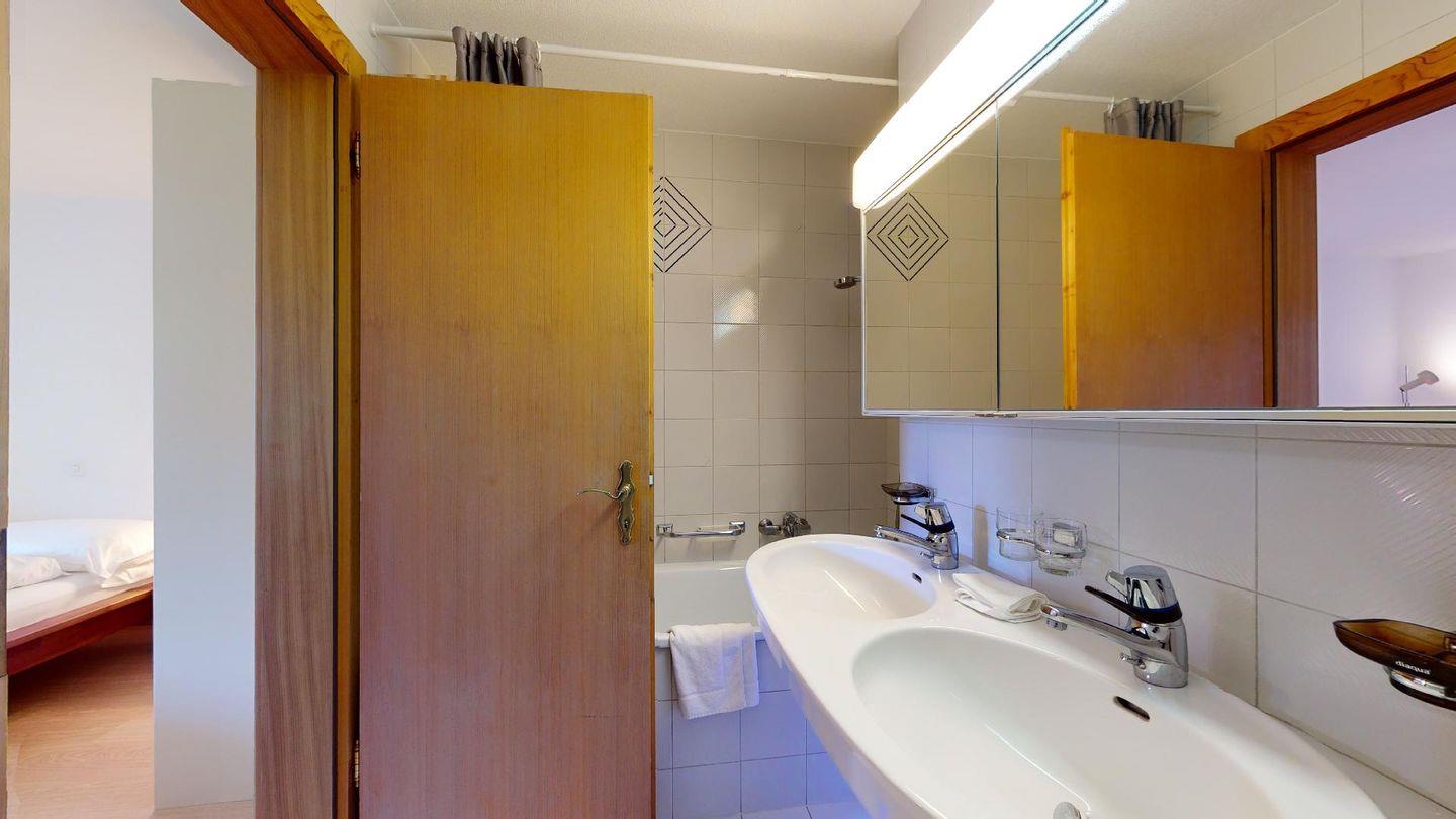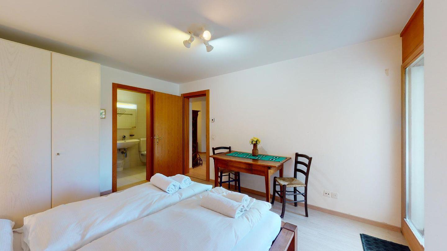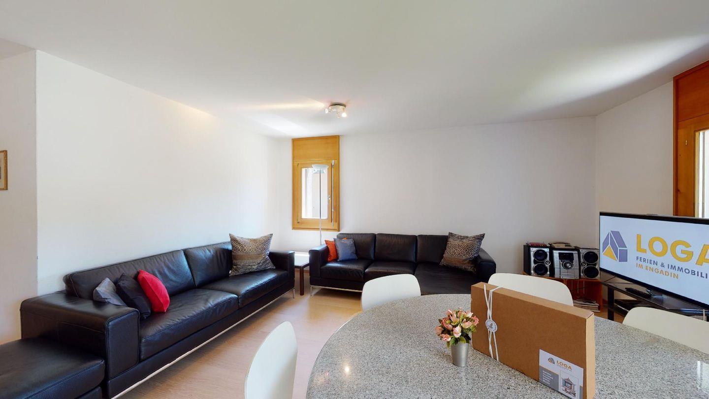 4-Zimmerwohnung im 1. Stock Segliasquartier, ca. 127 m². Eingang mit Garderobe. Ein Doppelzimmer mit Ausgang zum Balkon und Bad/WC/Doppellavabo, 2 separate Schlafzimmer mit je 2 Einzelbetten (+ ein Notklappbett) und Bad (Dusche/Lavabo/WC). Separate Küche mit Fenster, Backofen, Geschirrspüler, Kühlschrank und Tiefkühlabteil. Kaffeemaschine CHICCO D'ORO. Wohn/ Esszimmer mit Balkon (Nachmittagssonne) und Cheminee. Telefon, DAB-Radio mit CD Player und TV. 2 Garagenplätze und 1 Aussenparkplatz. Haustiere sind nicht erlaubt. Absolutes Rauchverbot.