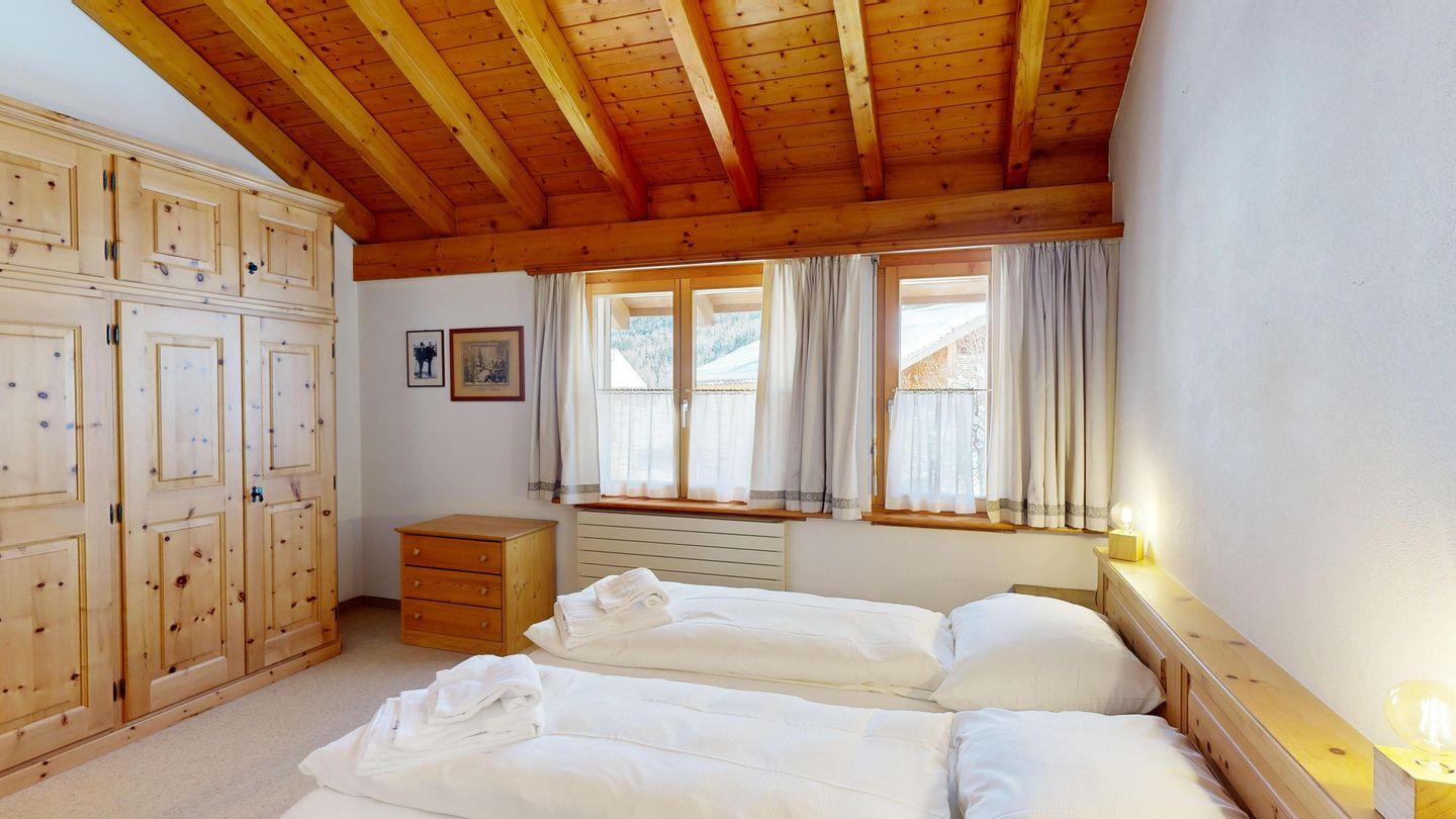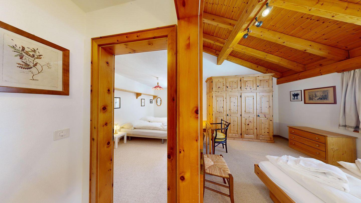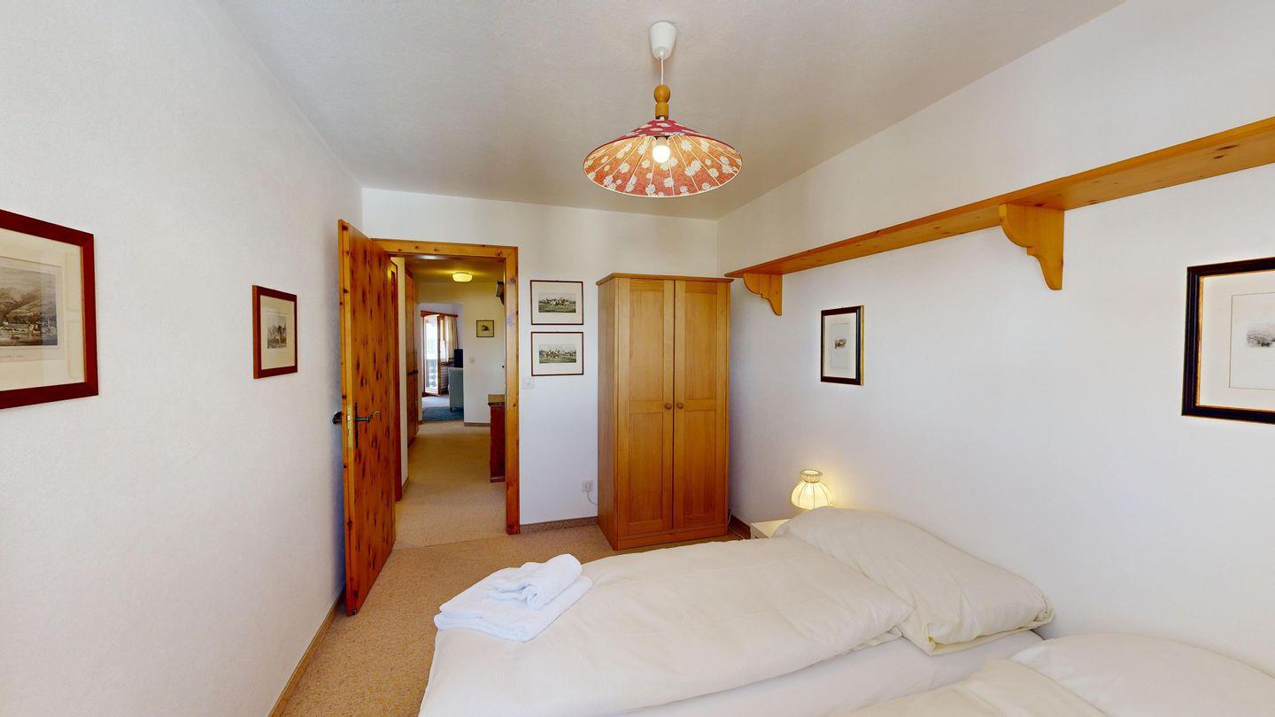 Der Eingangsbereich führt direkt zu den beiden Schlafzimmern und den zwei Badezimmern. Das grosse Schlafzimmer ist mit einem Doppelbett und einem Arvenschrank ausgestattet, während das zweite Schlafzimmer über zwei Einzelbetten und einen kleineren Kleiderschrank verfügt. Die beiden Badezimmer sind funktional eingerichtet, eines mit Badewanne und Duschmöglichkeit, das andere mit einer Dusche.